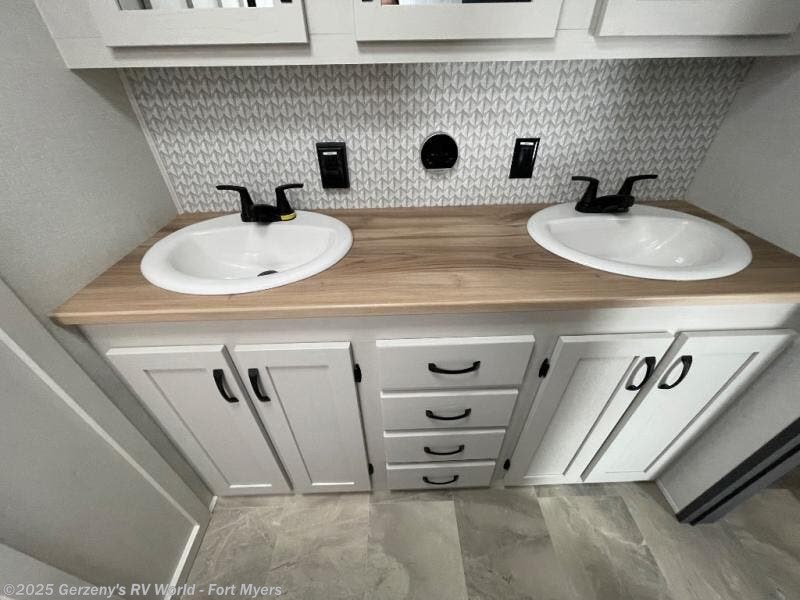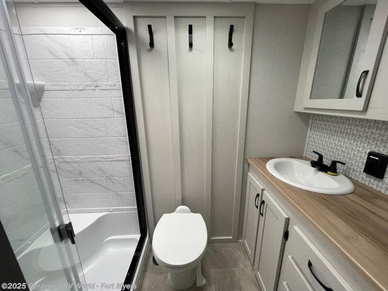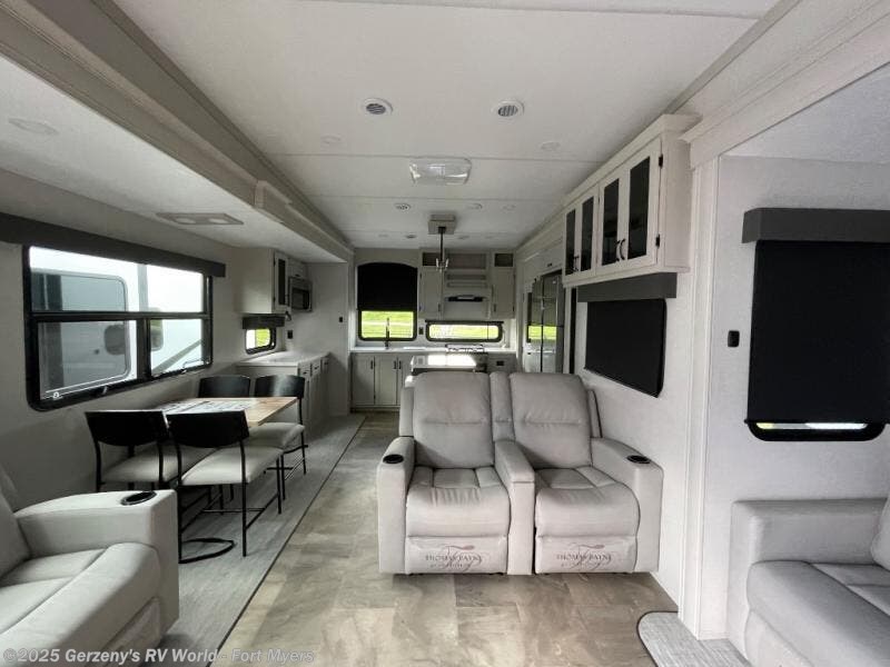 One look at this fifth wheel and you'll be sold. You'll find tons of counter space in the rear kitchen along with a kitchen island, a large pantry, and a hutch for even more storage. Visit in the main living area on the two theater seats and tri-fold sofa, or you may want to head outdoors under the two power awnings! There is even an outside refrigerator here to entertain guests. The spacious full bath will allow you to clean up after a day of adventuring, and here you'll find a full-size shower with sliding glass doors and a seat, plus a dual sink vanity. The front private bedroom will feel just like home with its king bed slide out, large wardrobe, and dresser to keep your clothes tidy.