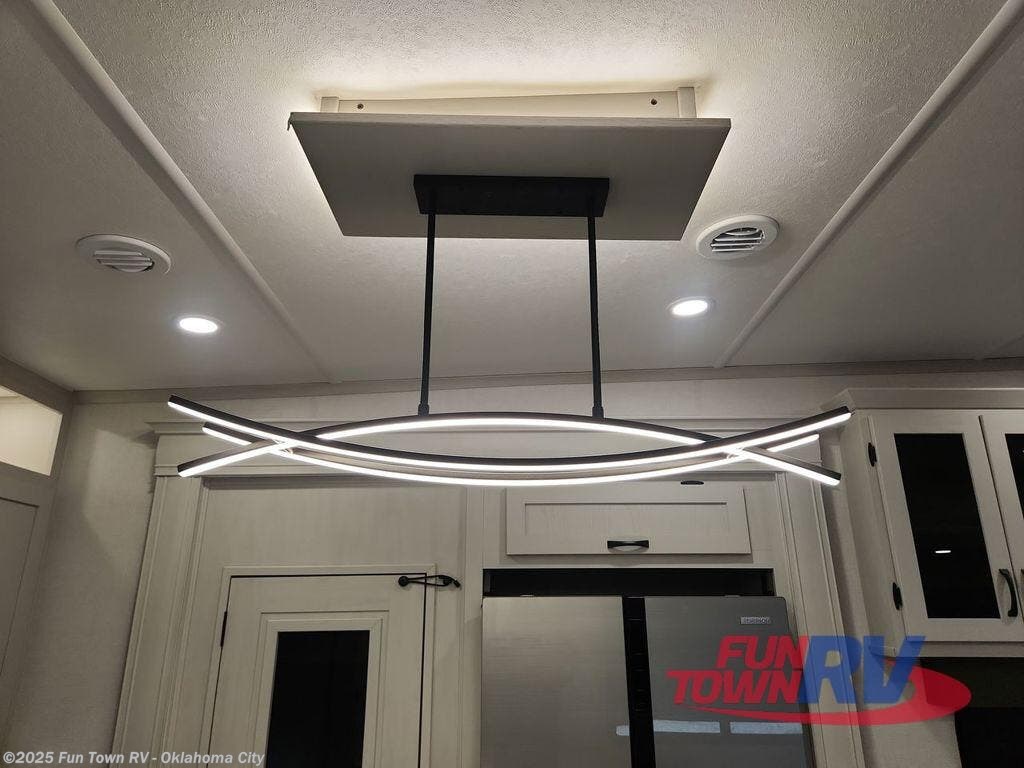 One look at this fifth wheel and you'll be sold. You'll find tons of counter space in the rear kitchen along with a kitchen island, a large pantry, and a hutch for even more storage. Visit in the main living area on the two theater seats and tri-fold sofa, or you may want to head outdoors under the two power awnings! There is even an outside refrigerator here to entertain guests. The spacious full bath will allow you to clean up after a day of adventuring, and here you'll find a full-size shower with sliding glass doors and a seat, plus a dual sink vanity. The front private bedroom will feel just like home with its king bed slide out, large wardrobe, and dresser to keep your clothes tidy.