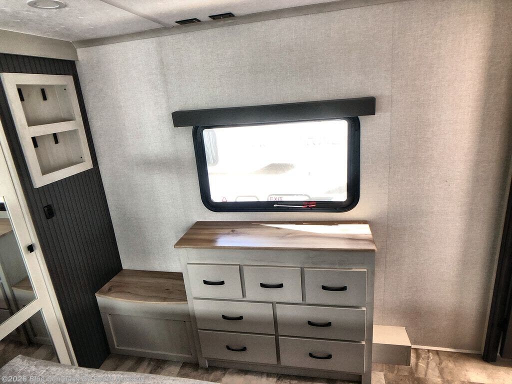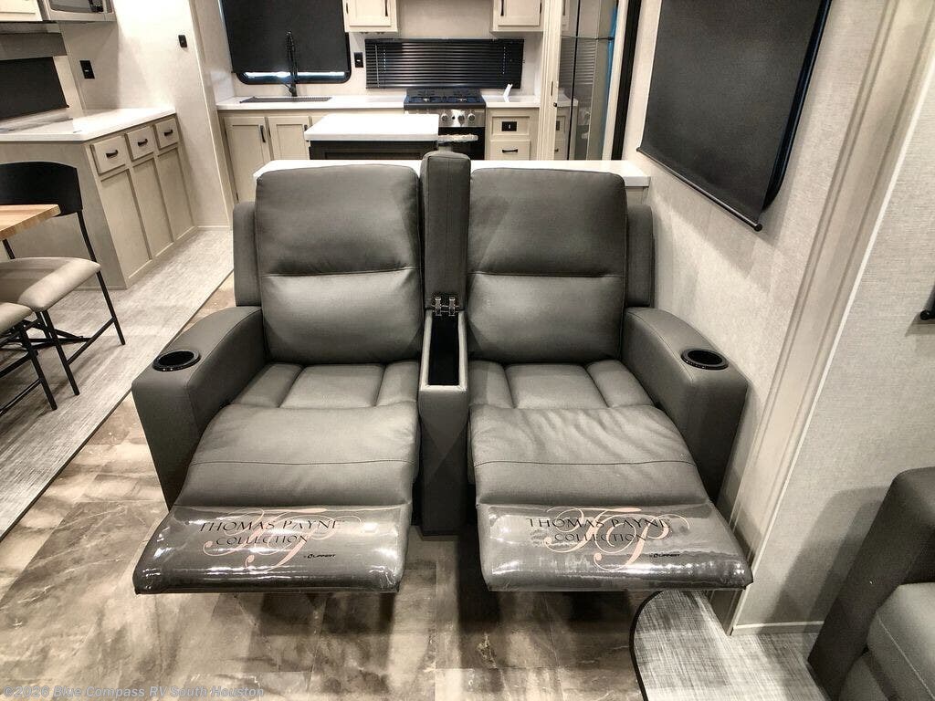 One look at this fifth wheel and you'll be sold. You'll find tons of counter space in the rear kitchen along with a kitchen island, a large pantry, and a hutch for even more storage. Visit in the main living area on the two theater seats and tri-fold sofa, or you may want to head outdoors under the two power awnings! There is even an outside refrigerator here to entertain guests. The spacious full bath will allow you to clean up after a day of adventuring, and here you'll find a full-size shower with sliding glass doors and a seat, plus a dual sink vanity. The front private bedroom will feel just like home with its king bed slide out, large wardrobe, and dresser to keep your clothes tidy.
