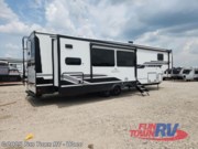 One look at this fifth wheel and you'll be sold. You'll find tons of counter space in the rear kitchen along with a kitchen island, a large pantry, and a hutch for even more storage. Visit in the main living area on the two theater seats and tri-fold sofa, or you may want to head outdoors under the two power awnings! There is even an outside refrigerator here to entertain guests. The spacious full bath will allow you to clean up after a day of adventuring, and here you'll find a full-size shower with sliding glass doors and a seat, plus a dual sink vanity. The front private bedroom will feel just like home with its king bed slide out, large wardrobe, and dresser to keep your clothes tidy.