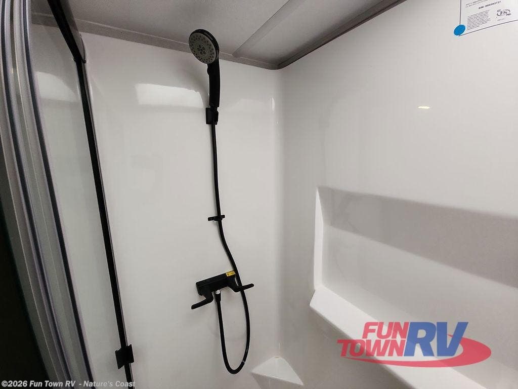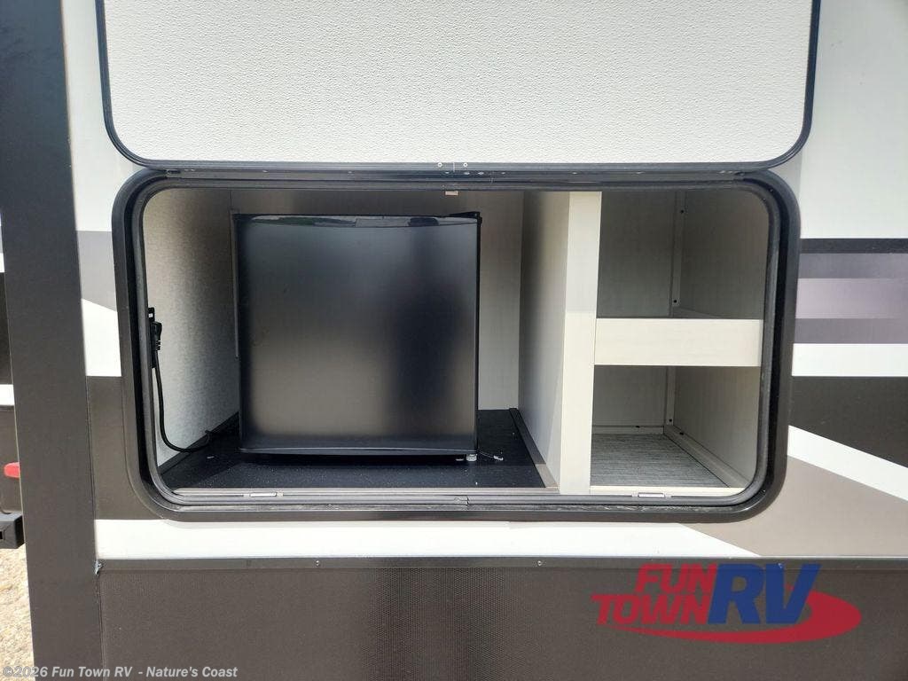 One look at this fifth wheel and you'll be sold. You'll find tons of counter space in the rear kitchen along with a kitchen island, a large pantry, and a hutch for even more storage. Visit in the main living area on the two theater seats and tri-fold sofa, or you may want to head outdoors under the two power awnings! There is even an outside refrigerator here to entertain guests. The spacious full bath will allow you to clean up after a day of adventuring, and here you'll find a full-size shower with sliding glass doors and a seat, plus a dual sink vanity. The front private bedroom will feel just like home with its king bed slide out, large wardrobe, and dresser to keep your clothes tidy.