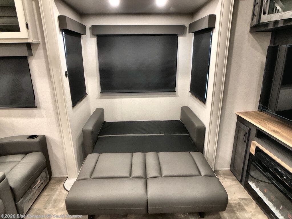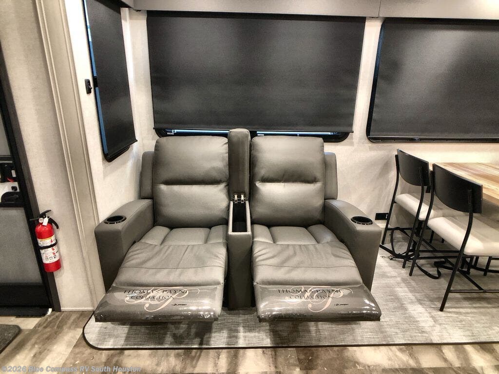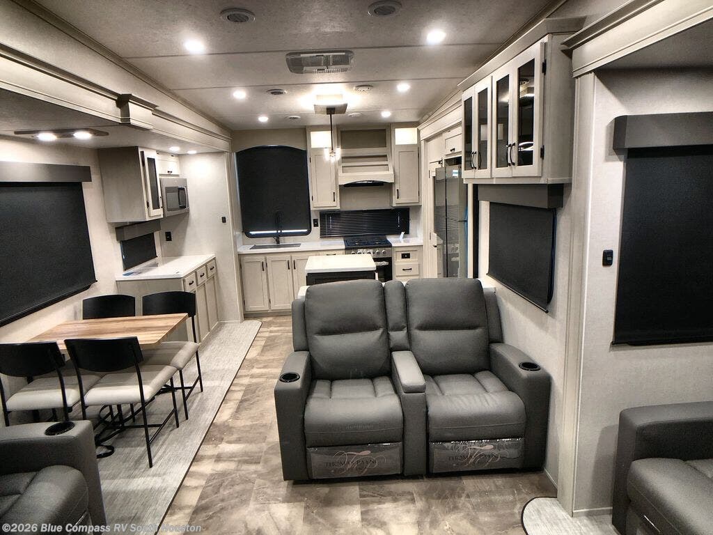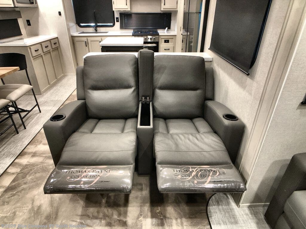 One look at this fifth wheel and you'll be sold. You'll find tons of counter space in the rear kitchen along with a kitchen island, a large pantry, and a hutch for even more storage. Visit in the main living area on the two theater seats and tri-fold sofa, or you may want to head outdoors under the power awning! There is even an outside refrigerator here to entertain guests. The spacious full bath will allow you to clean up after a day of adventuring, and here you'll find a full-size shower with sliding glass doors and a seat, plus a dual sink vanity. The front private bedroom will feel just like home with its king bed slide out, large wardrobe, and dresser to keep your clothes tidy.