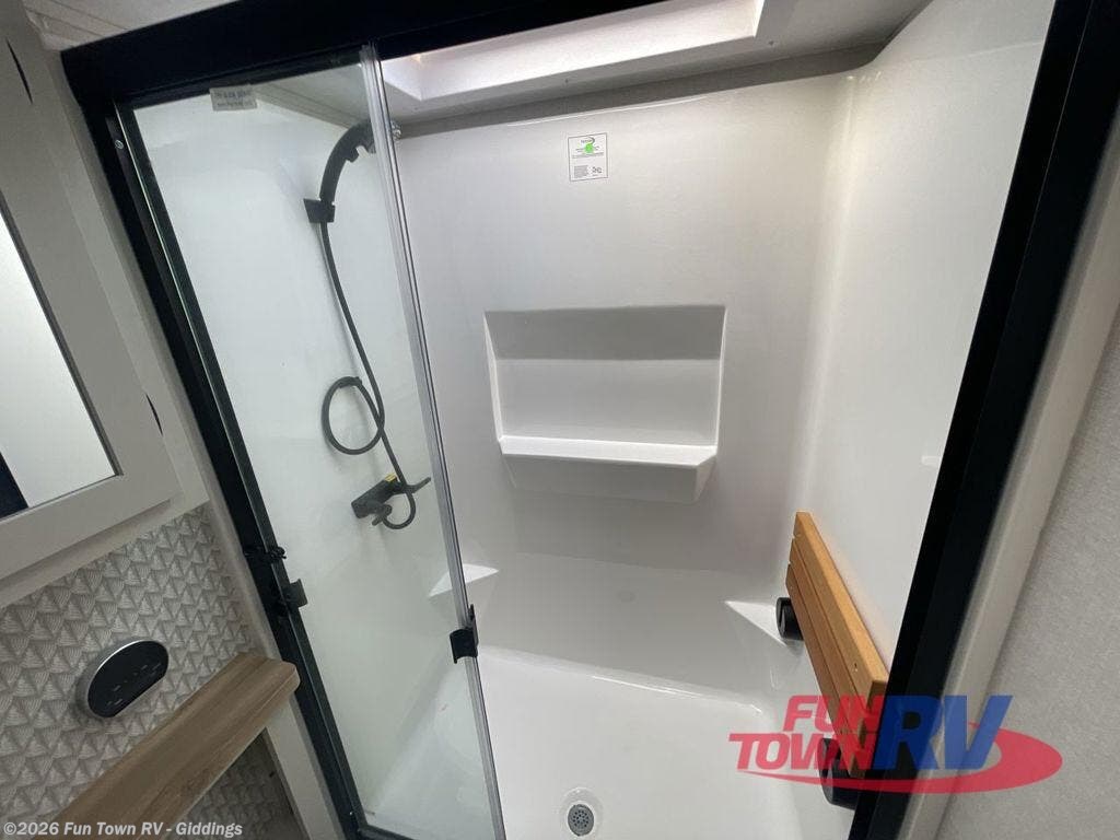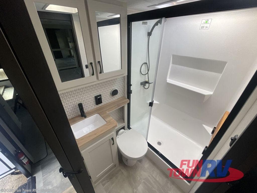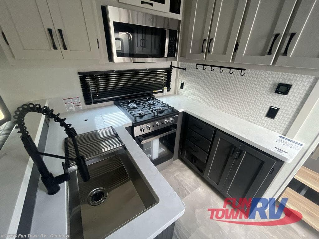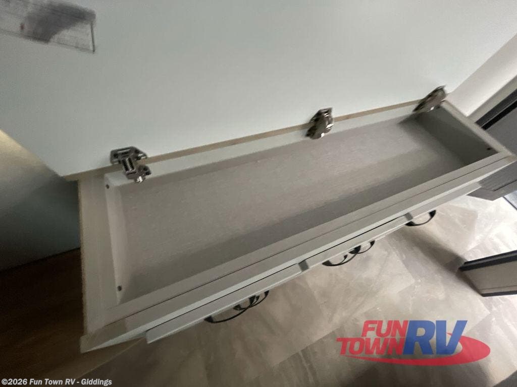 At the front of this fifth wheel, the main bedroom features a spacious king bed in a slide-out, paired with a walk-in closet, wardrobe, dresser, and bench to keep everything organized and make mornings effortless. The adjoining bathroom that is accessible from both the bedroom and hallway, includes a shower with a teak flip-down seat, sliding glass door, and a high-rise porcelain toilet with foot flush. Down the hall, the U-shaped kitchen offers solid-surface countertops, an aluminum roll-up drying rack/sink cover, an extra-deep single-basin sink, a 30" stainless microwave, a 24" four-burner range with oven, a large pantry, and a 16-cu. ft. stainless-glass 12V refrigerator in a slide-out. Nearby, the multi-functional slide/swivel table with a fixed bar creates a perfect spot for meals, games, or work. Across from it, the living area includes a tri-fold hide-a-bed sofa and theater seating facing the entertainment center. At the rear, the second bedroom provides a queen bed in a slide-out and ample storage with a dresser and dual wardrobes, while the second full bathroom, with its own exterior entry adds convenience and accessibility.