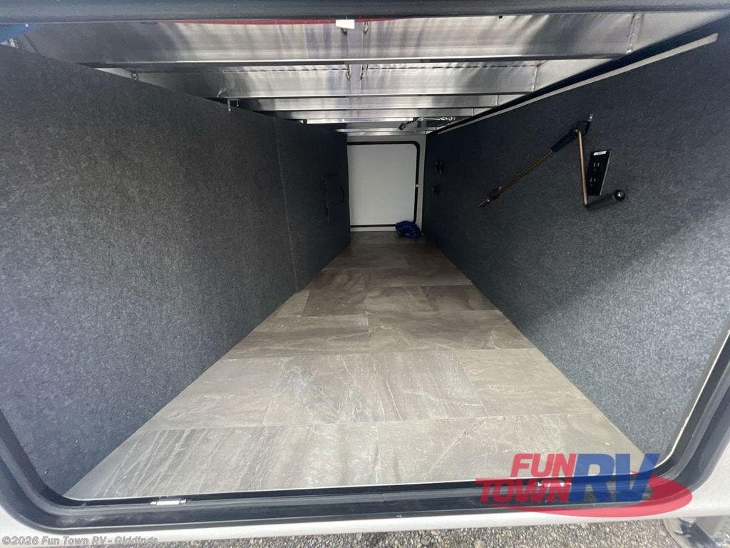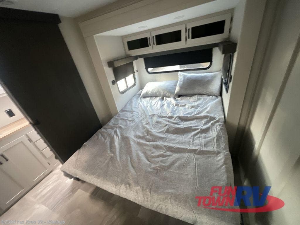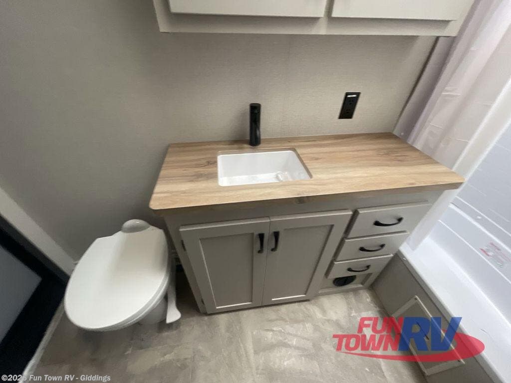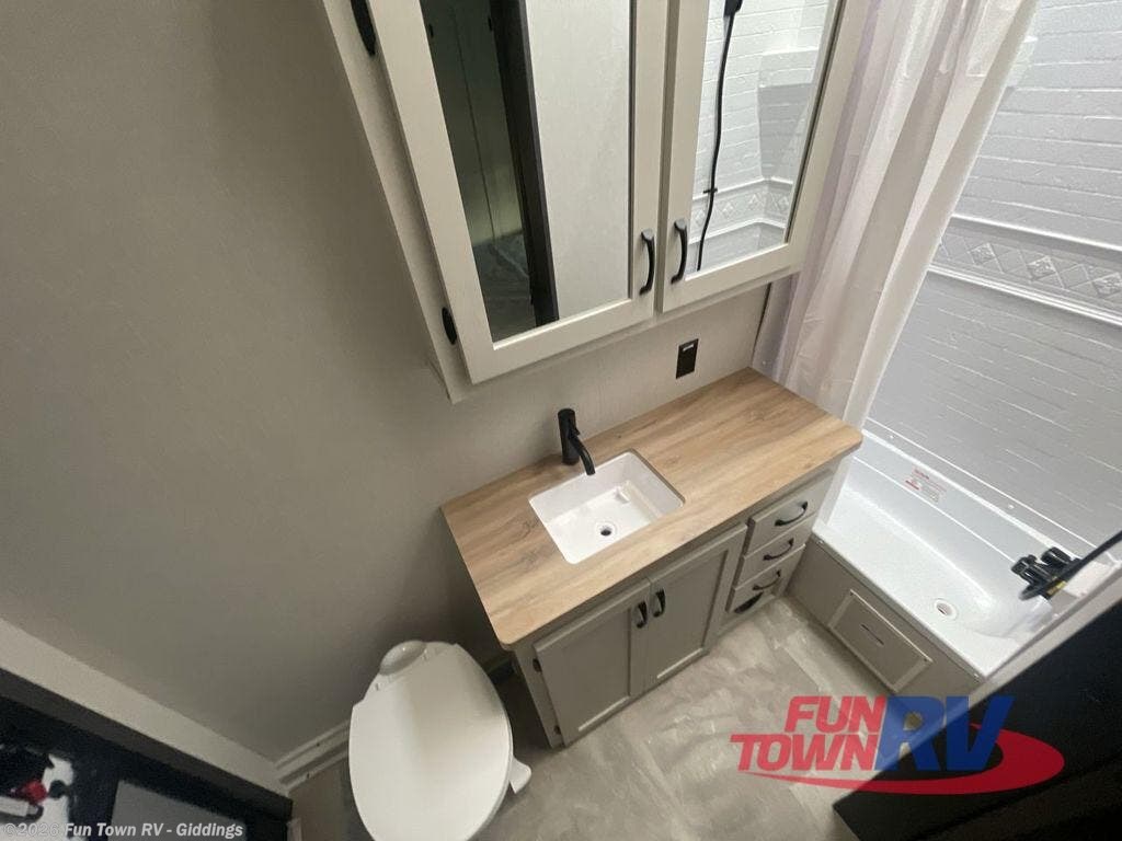 At the front of this fifth wheel, the main bedroom features a spacious king bed in a slide-out, paired with a walk-in closet, wardrobe, dresser, and bench to keep everything organized and make mornings effortless. The adjoining bathroom that is accessible from both the bedroom and hallway, includes a shower with a teak flip-down seat, sliding glass door, and a high-rise porcelain toilet with foot flush. Down the hall, the U-shaped kitchen offers solid-surface countertops, an aluminum roll-up drying rack/sink cover, an extra-deep single-basin sink, a 30" stainless microwave, a 24" four-burner range with oven, a large pantry, and a 16-cu. ft. stainless-glass 12V refrigerator in a slide-out. Nearby, the multi-functional slide/swivel table with a fixed bar creates a perfect spot for meals, games, or work. Across from it, the living area includes a tri-fold hide-a-bed sofa and theater seating facing the entertainment center. At the rear, the second bedroom provides a queen bed in a slide-out and ample storage with a dresser and dual wardrobes, while the second full bathroom, with its own exterior entry adds convenience and accessibility.