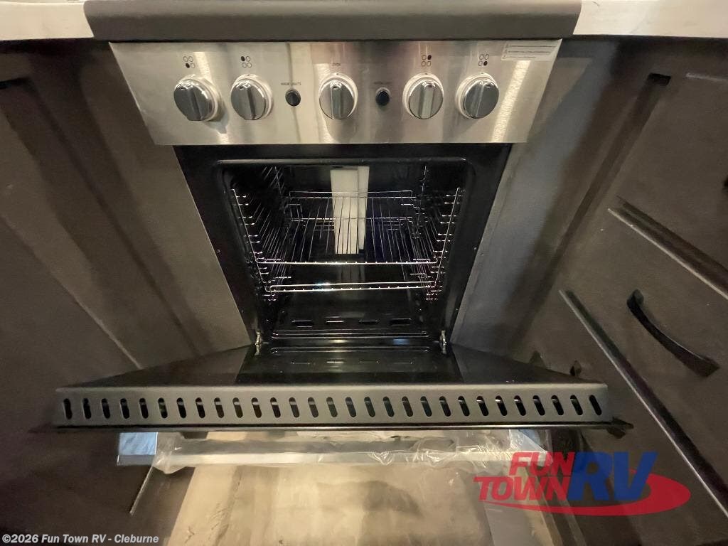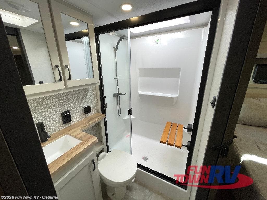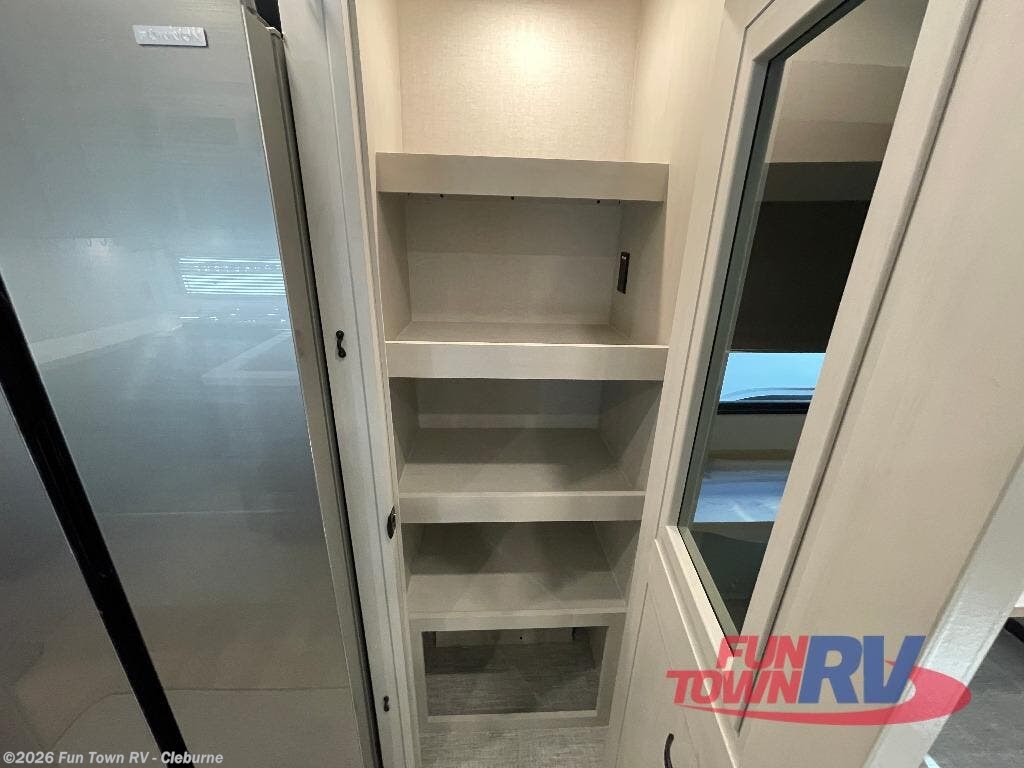 At the front of this fifth wheel, the main bedroom features a spacious king bed in a slide-out, paired with a walk-in closet, wardrobe, dresser, and bench to keep everything organized and make mornings effortless. The adjoining bathroom that is accessible from both the bedroom and hallway, includes a shower with a teak flip-down seat, sliding glass door, and a high-rise porcelain toilet with foot flush. Down the hall, the U-shaped kitchen offers solid-surface countertops, an aluminum roll-up drying rack/sink cover, an extra-deep single-basin sink, a 30" stainless microwave, a 24" four-burner range with oven, a large pantry, and a 16-cu. ft. stainless-glass 12V refrigerator in a slide-out. Nearby, the multi-functional slide/swivel table with a fixed bar creates a perfect spot for meals, games, or work. Across from it, the living area includes a tri-fold hide-a-bed sofa and theater seating facing the entertainment center. At the rear, the second bedroom provides a queen bed in a slide-out and ample storage with a dresser and dual wardrobes, while the second full bathroom, with its own exterior entry adds convenience and accessibility.