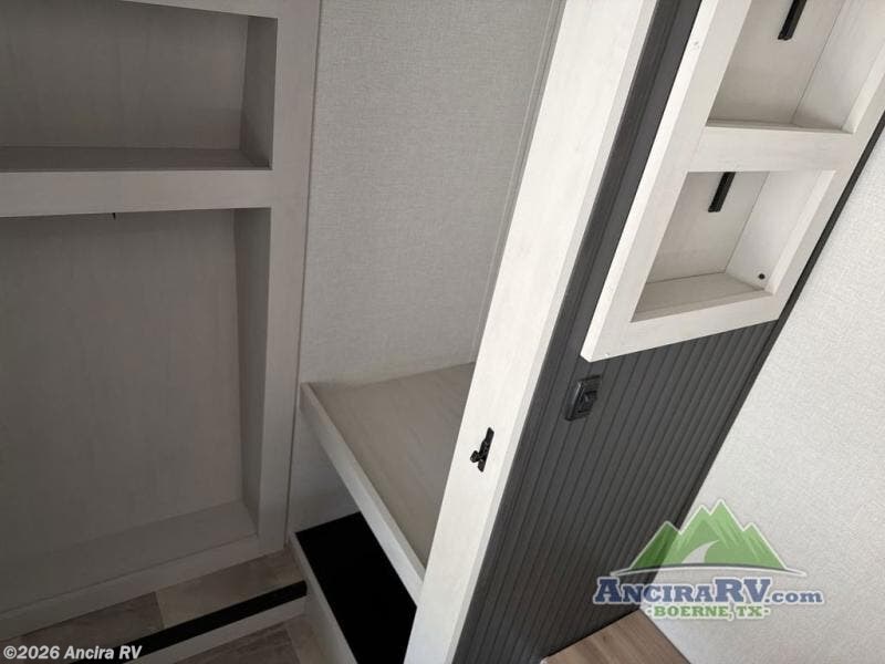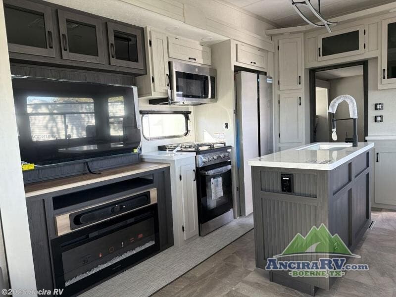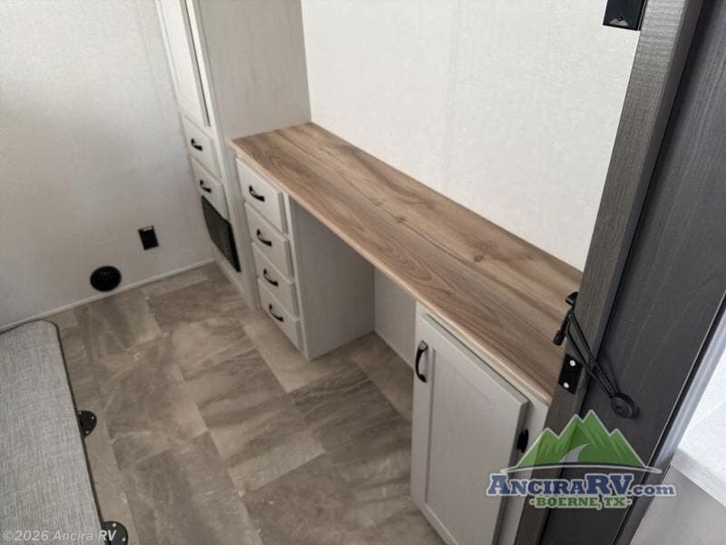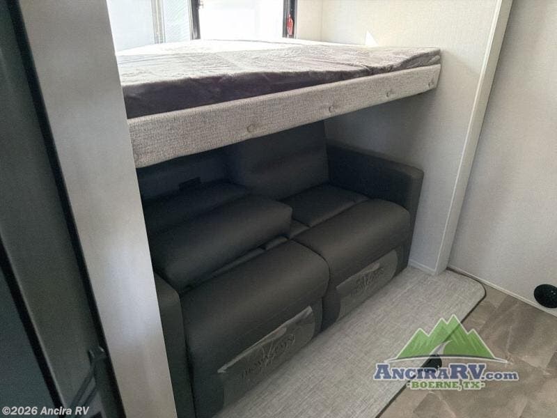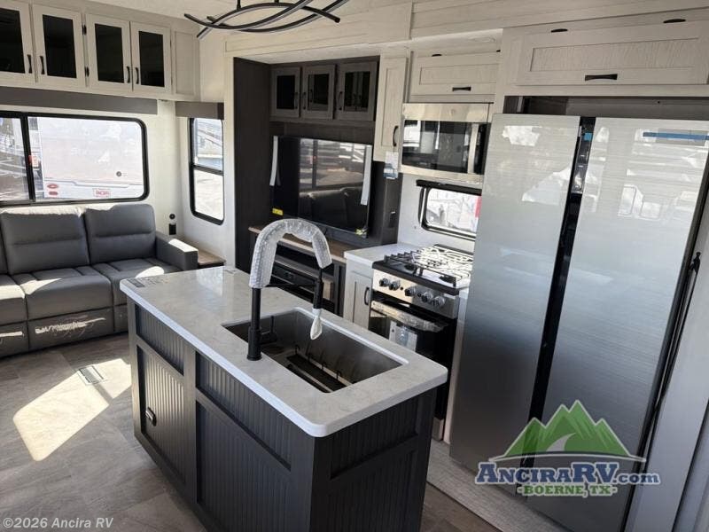 This family-friendly fifth wheel can sleep the whole gang comfortably between the king bed, the tri-fold sofa, and the middle bunkhouse with a loft above! There is plenty of counter space in the bunkhouse, plus a sofa with a removable table and a wardrobe for clothes. The kitchen is any chef's dream with its residential cooktop, 12V refrigerator, and kitchen island for more counter space. While dinner is being made, you can play a game of cards at the free-standing table, relax on the tri-fold sofa, or visit outdoors under the 20' electric awning with LED light strip. You won't be left wanting for storage space in this model thanks to the overhead cabinets, plus the bedroom dresser and large wardrobe. There is even a wardrobe with washer and dryer prep if you want to add those appliances.
