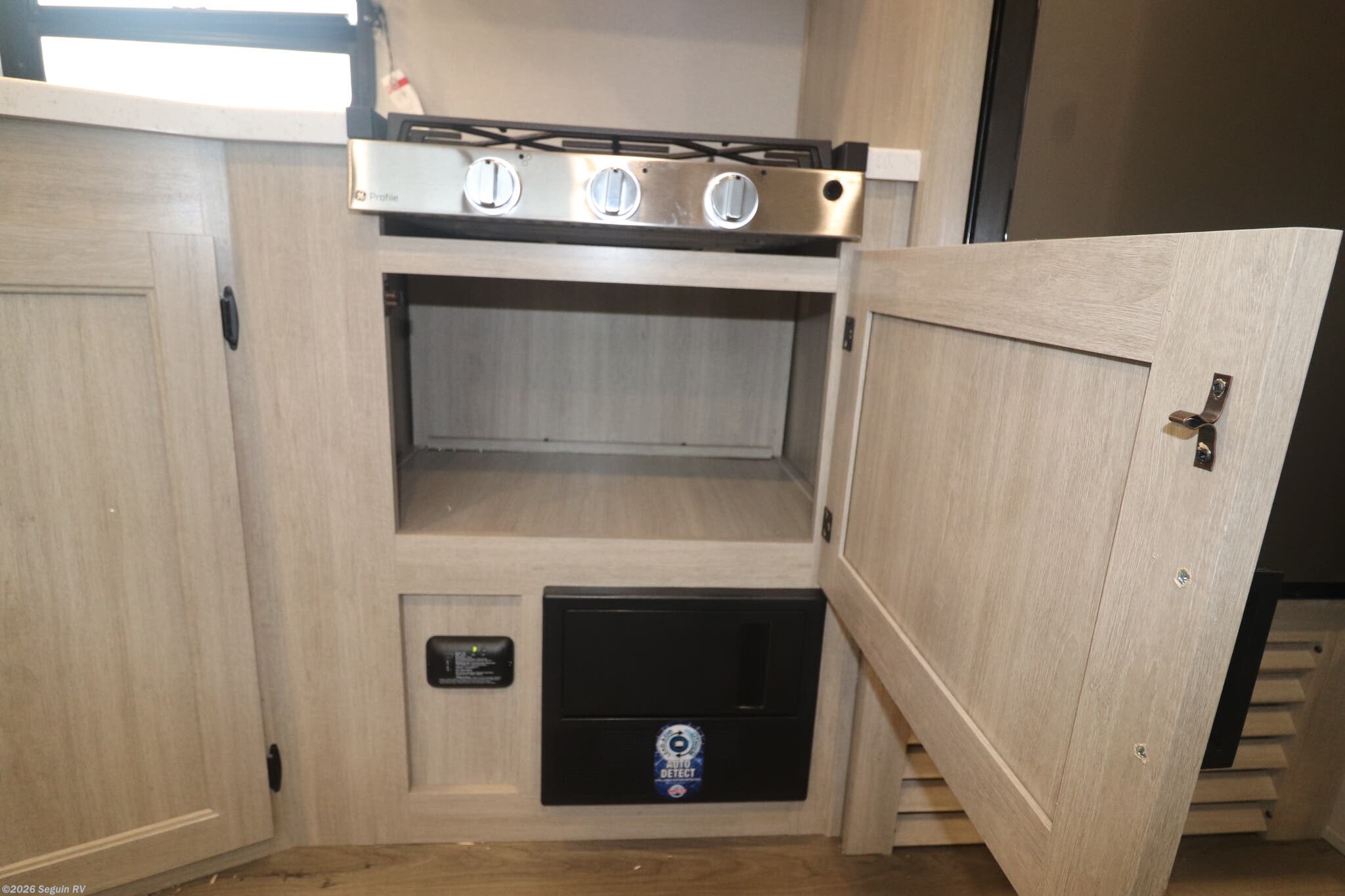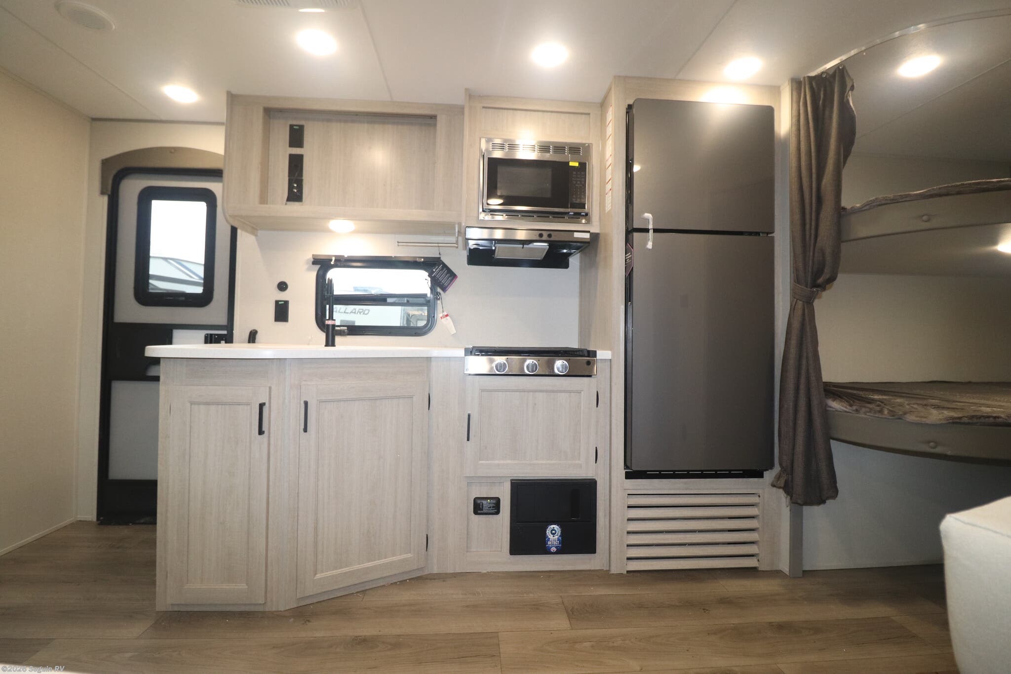 - Compact, easy-to-tow travel trailer with a family-friendly floorplan.