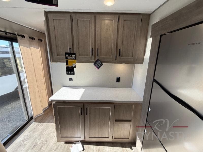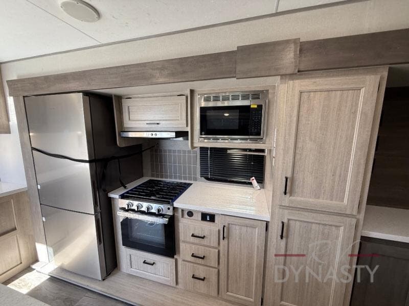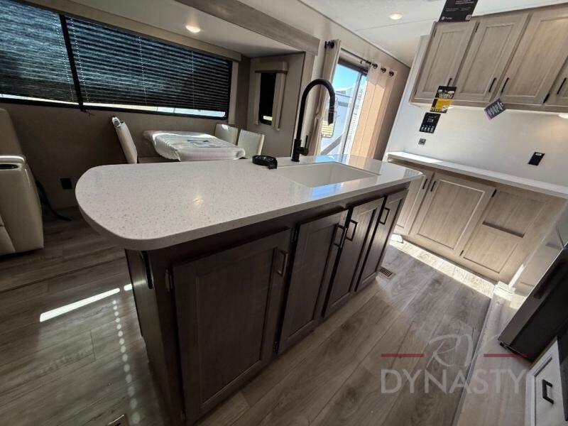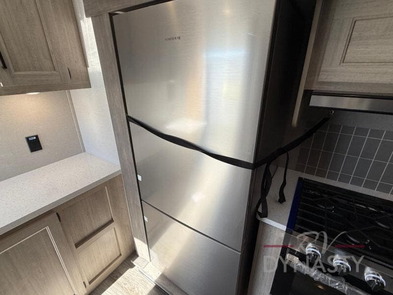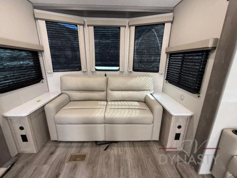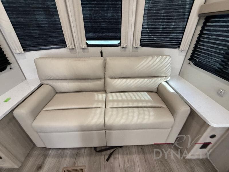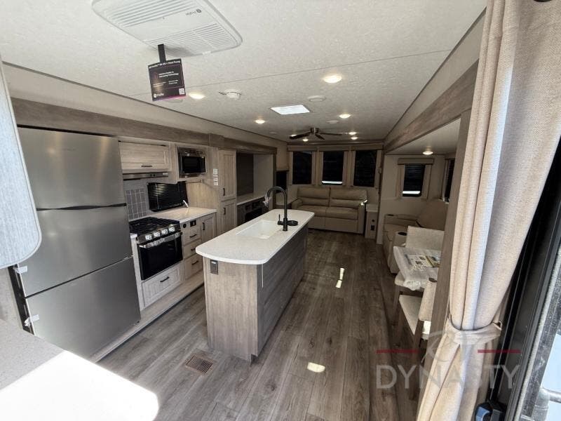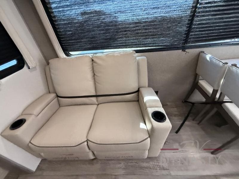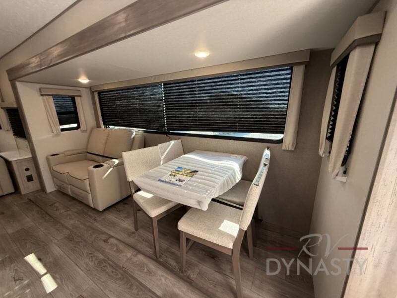 You'll feel right at home in this spacious destination trailer with triple slides. The front entertainment center and front living room includes theater seating, dual recliner lounges, and a booth dinette for ample seating space. You might like to add the free standing dinette option if you prefer that type of seating. The cook will love the spacious kitchen with an island, a residential refrigerator, a pantry and an extra countertop space. The full bathroom offers a shower with a seat and linen storage with washer/dryer prep for added convivence. Head to the rear bedroom for a great night's rest on the king bed slide out, and you can store all your clothes in the dresser with drawers or rear wardrobe with interior storage shelves!