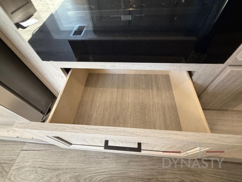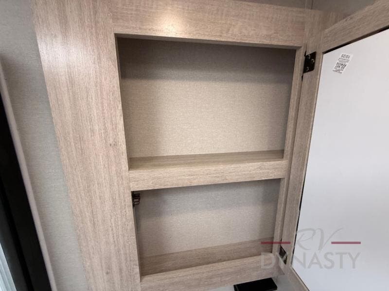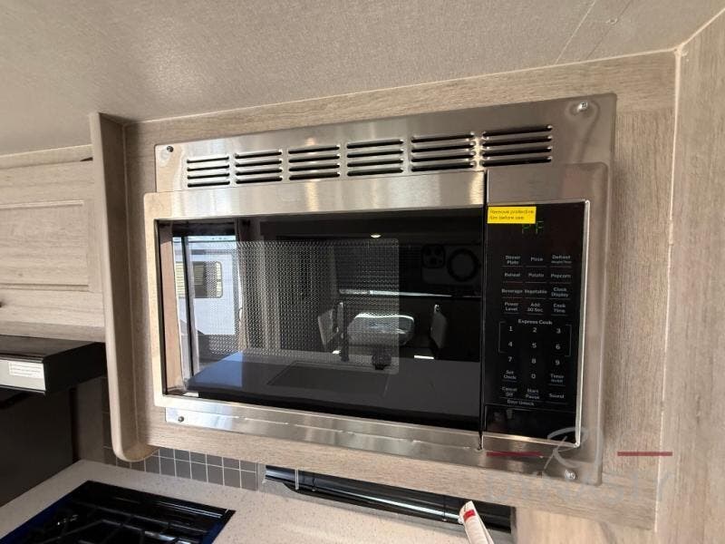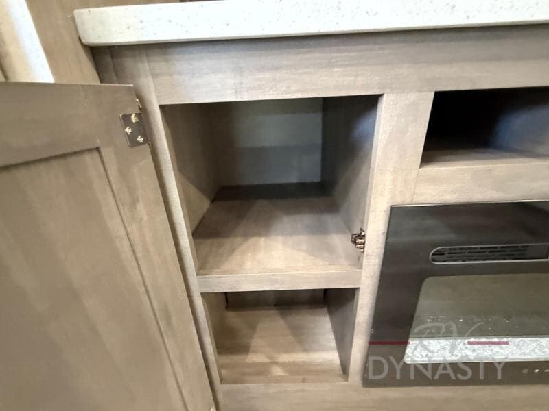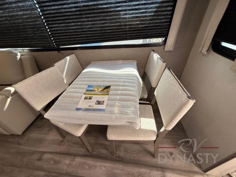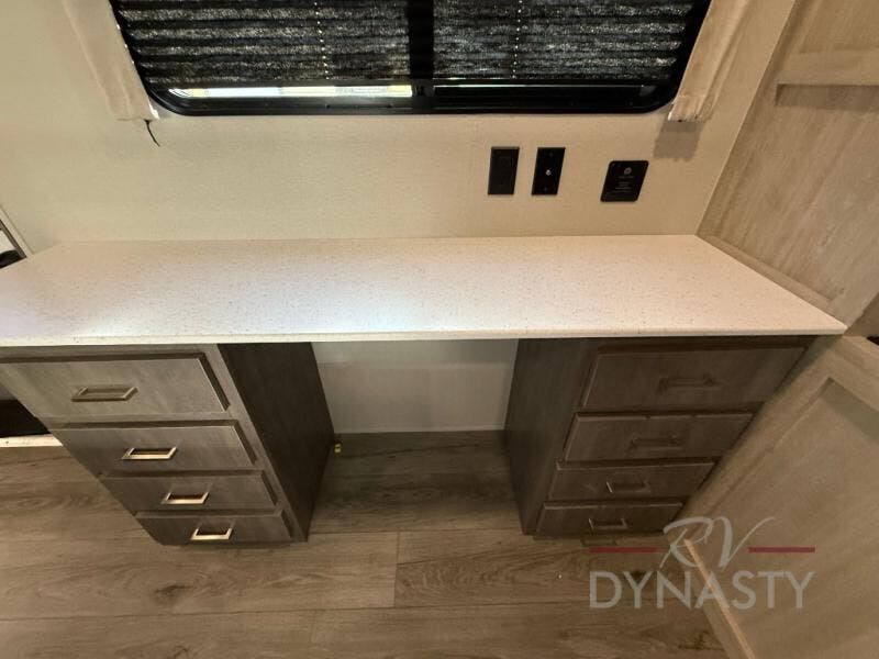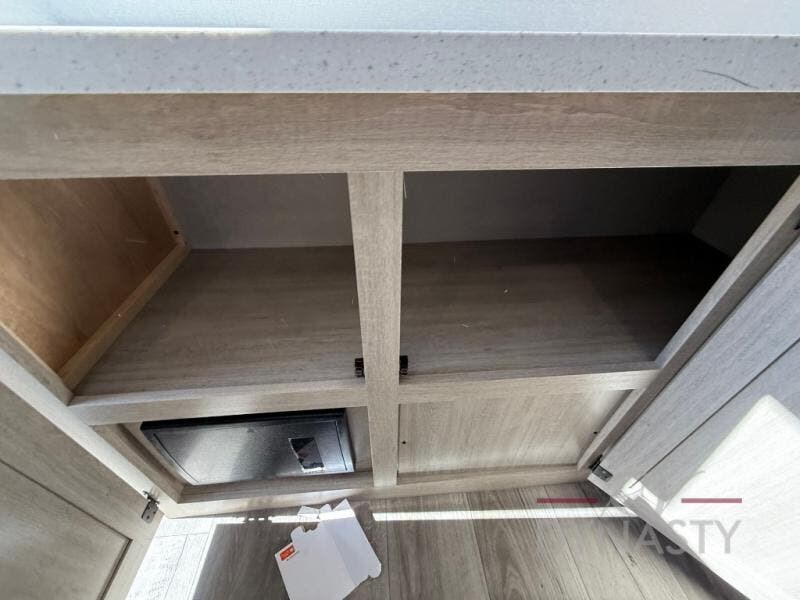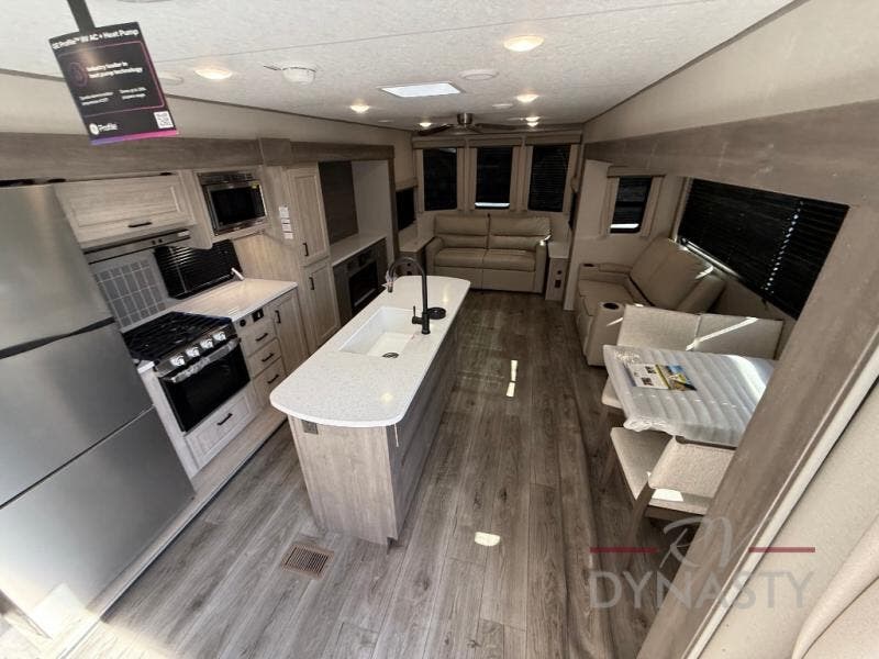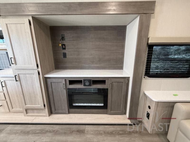 You'll feel right at home in this spacious destination trailer with triple slides. The front entertainment center and front living room includes theater seating, dual recliner lounges, and a booth dinette for ample seating space. You might like to add the free standing dinette option if you prefer that type of seating. The cook will love the spacious kitchen with an island, a residential refrigerator, a pantry and an extra countertop space. The full bathroom offers a shower with a seat and linen storage with washer/dryer prep for added convivence. Head to the rear bedroom for a great night's rest on the king bed slide out, and you can store all your clothes in the dresser with drawers or rear wardrobe with interior storage shelves!