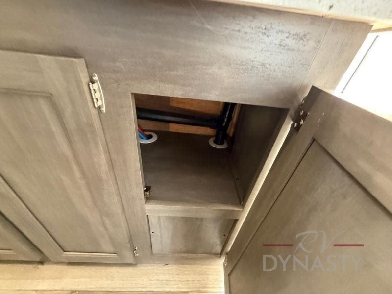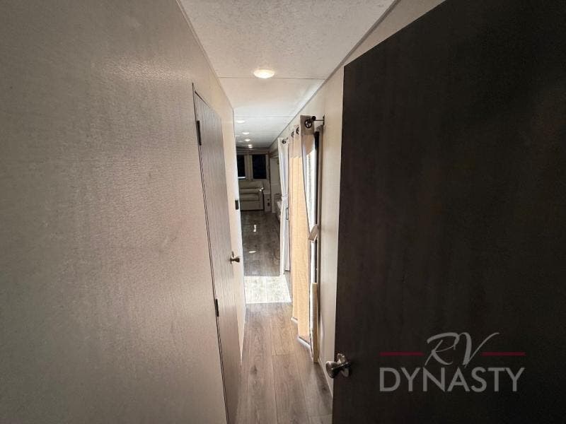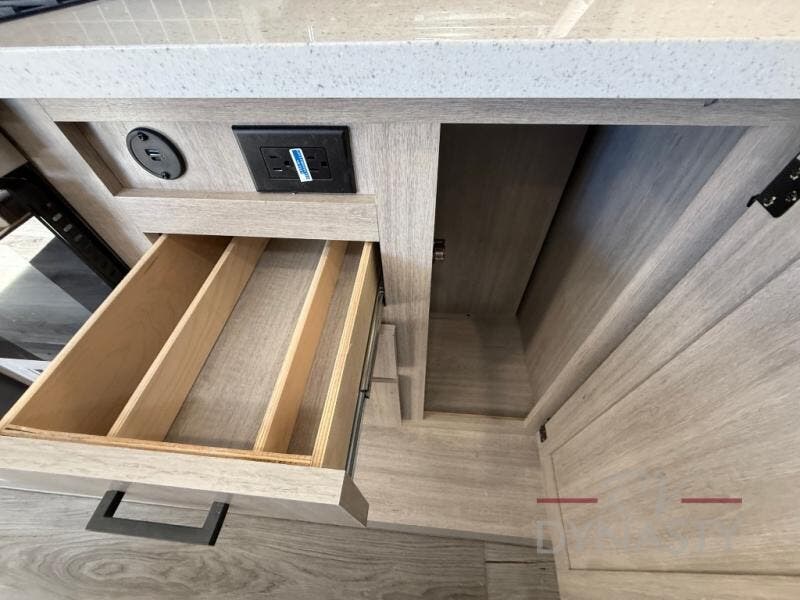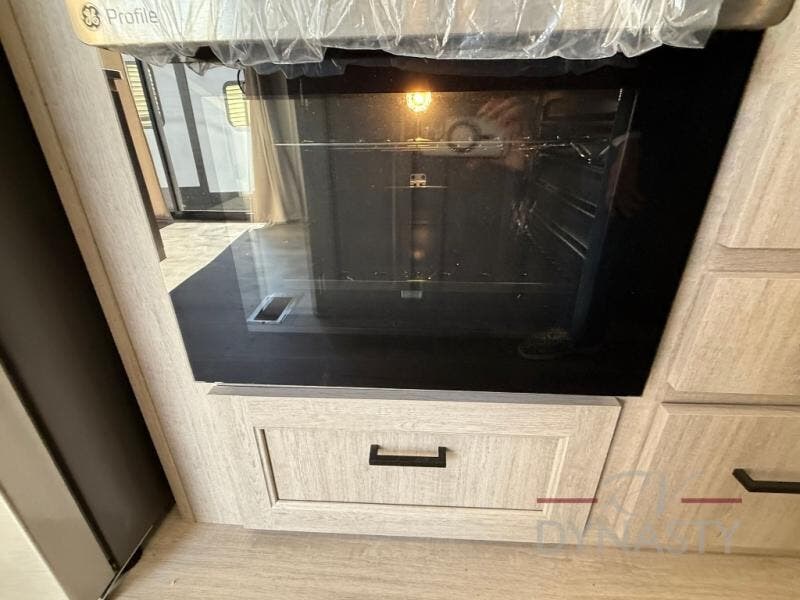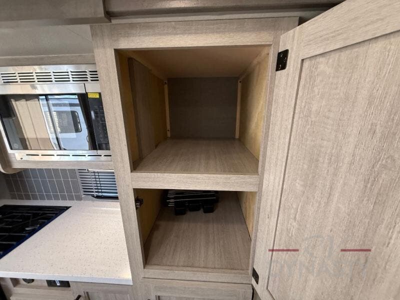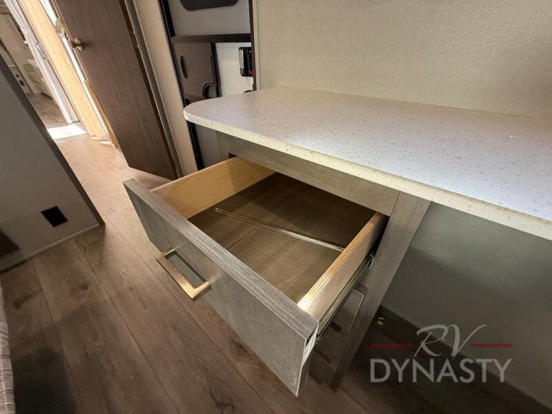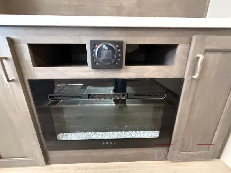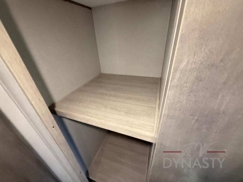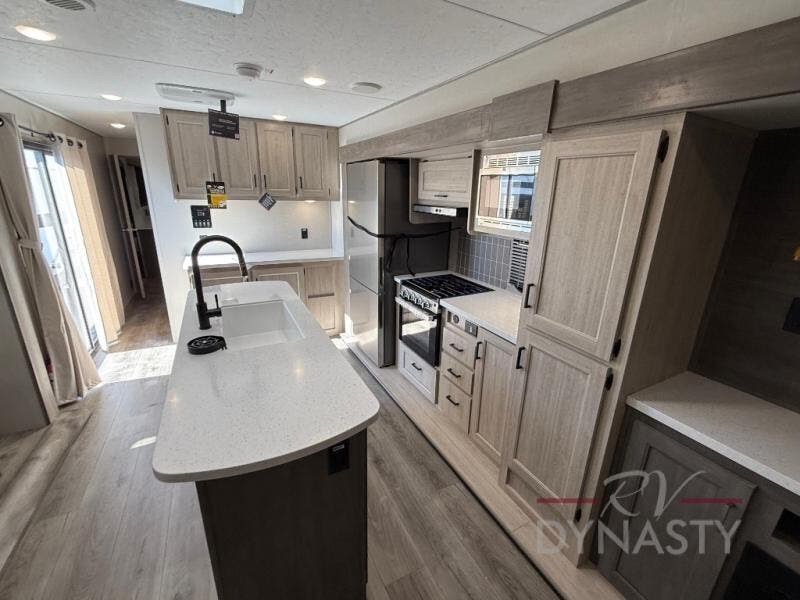 You'll feel right at home in this spacious destination trailer with triple slides. The front entertainment center and front living room includes theater seating, dual recliner lounges, and a booth dinette for ample seating space. You might like to add the free standing dinette option if you prefer that type of seating. The cook will love the spacious kitchen with an island, a residential refrigerator, a pantry and an extra countertop space. The full bathroom offers a shower with a seat and linen storage with washer/dryer prep for added convivence. Head to the rear bedroom for a great night's rest on the king bed slide out, and you can store all your clothes in the dresser with drawers or rear wardrobe with interior storage shelves!