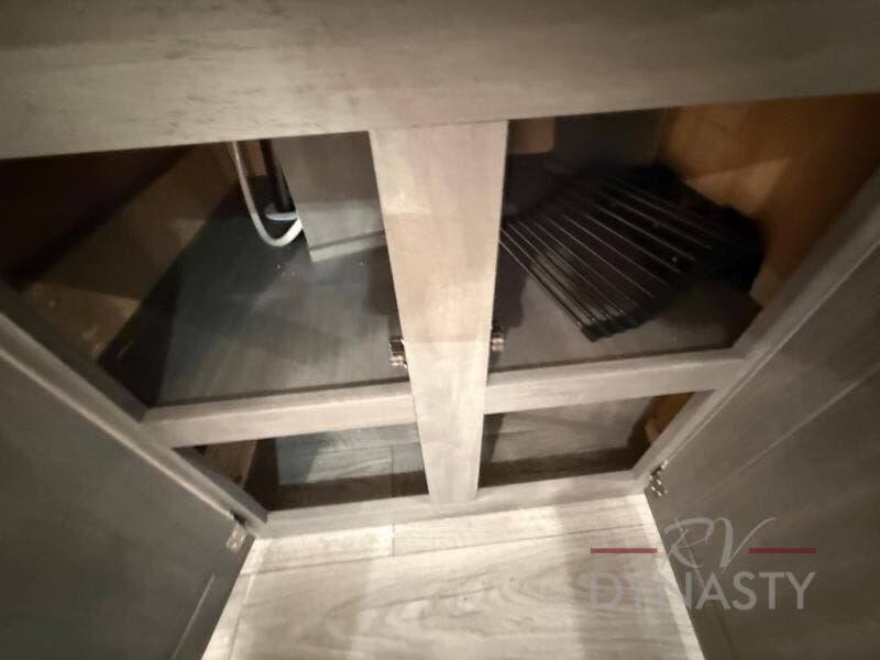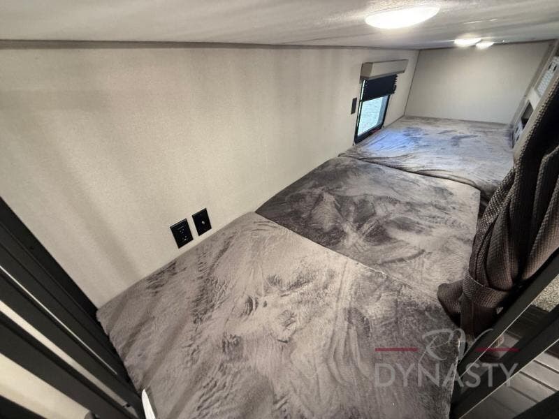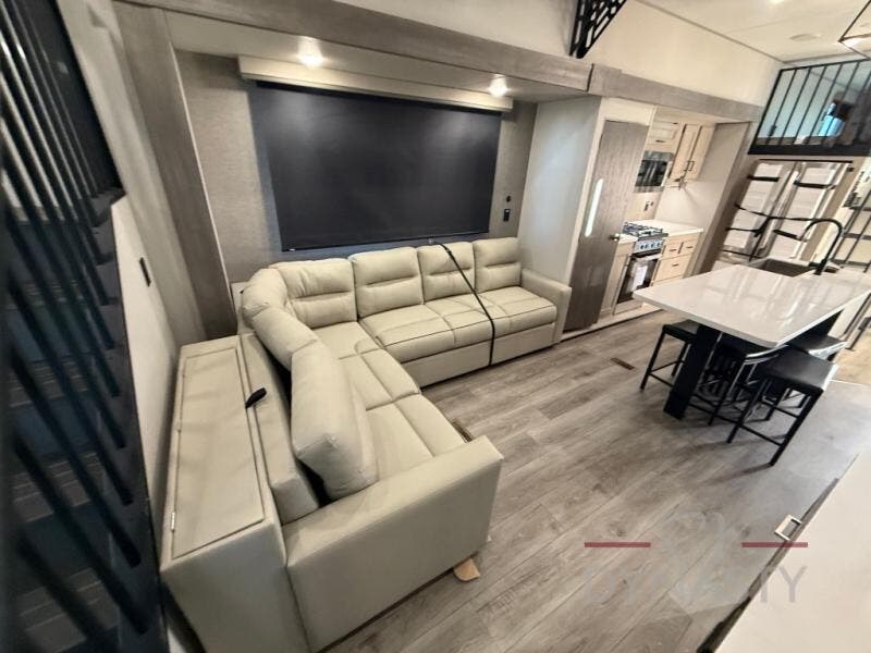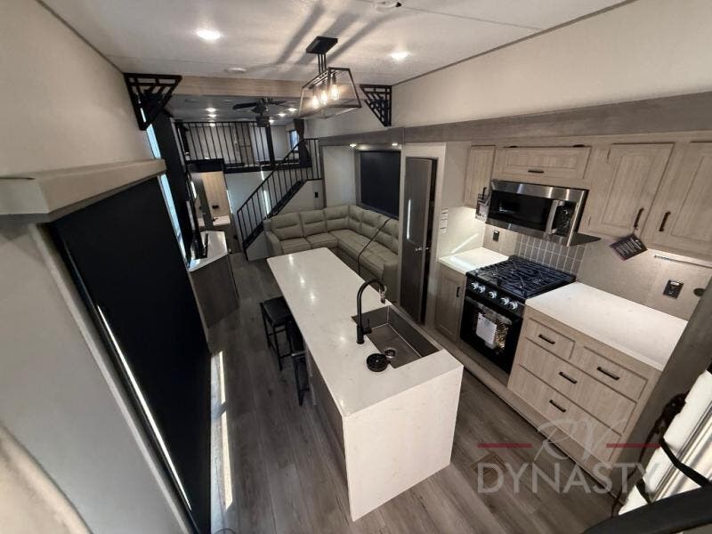 This unit with dual lofts and tons of sleeping space is ideal for a larger group! Lofts at either end of the unit overlook the living area and have a total of five bunk mats, with four 42" x 74" and one smaller 28" x 74". Downstairs there's a private bedroom with a queen bed and fireplace. The main living area has a huge hide-a-bed sectional sofa so you can fit even more guests, or just relax and watch the TV on the power lift in the entertainment center. The kitchen is well-equipped with a french door refrigerator, microwave, and pantry. The centerpiece here is a kitchen island with a deep basin farm-style sink and bar stool seating so your group can gather together and make new memories! The full bath in the rear has a roomy 48" x 30" shower with glass door, and a linen closet.
