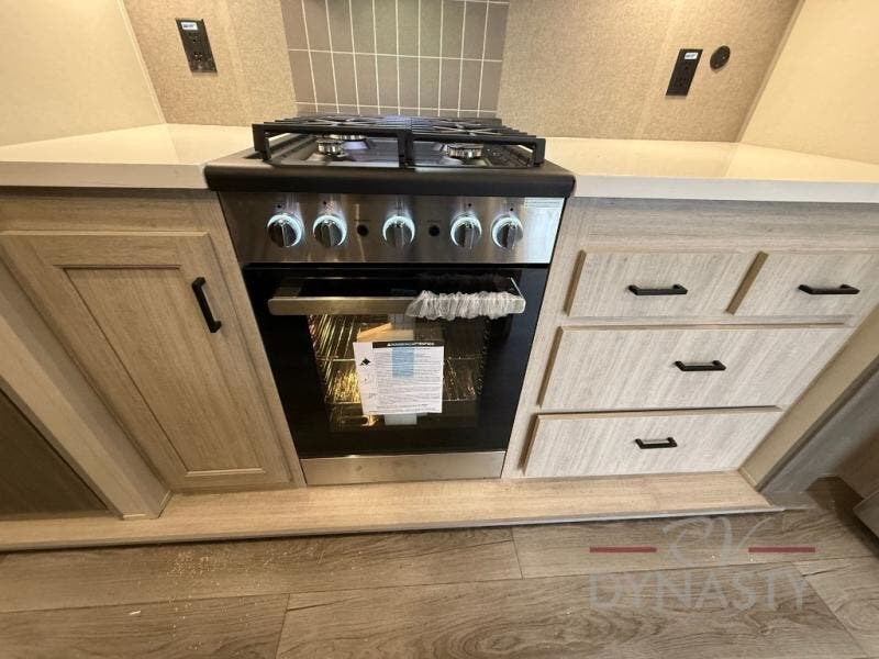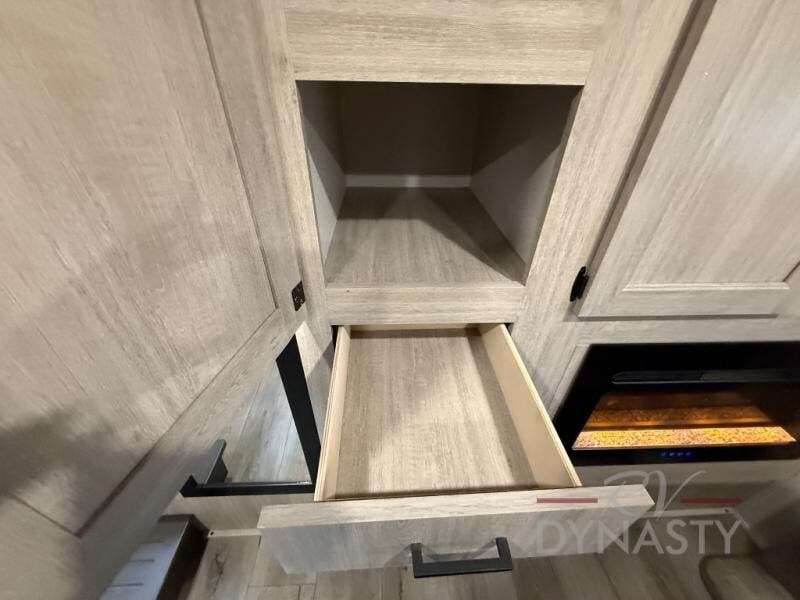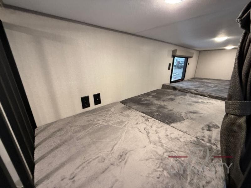 This unit with dual lofts and tons of sleeping space is ideal for a larger group! Lofts at either end of the unit overlook the living area and have a total of five bunk mats, with four 42" x 74" and one smaller 28" x 74". Downstairs there's a private bedroom with a queen bed and fireplace. The main living area has a huge hide-a-bed sectional sofa so you can fit even more guests, or just relax and watch the TV on the power lift in the entertainment center. The kitchen is well-equipped with a french door refrigerator, microwave, and pantry. The centerpiece here is a kitchen island with a deep basin farm-style sink and bar stool seating so your group can gather together and make new memories! The full bath in the rear has a roomy 48" x 30" shower with glass door, and a linen closet.