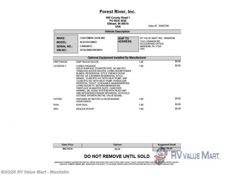 Request More Info on this 2026 Coachmen Catalina Destination Series 43CONDO Offered for sale by RV Value Mart - Manheim