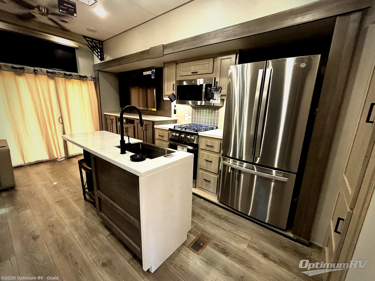 There is much to love about this destination trailer! Starting with the loft that has two queen beds, a wardrobe/storage, and a custom 58" x 71" bed. Downstairs there's a private bedroom with a king bed slide, a fireplace, and its very own private full bathroom complete with a dual sink vanity. The main living area has a huge bi-fold sleeper sectional sofa so you can fit even more guests, or just relax and watch the TV on the power lift in the entertainment center. The kitchen is well-equipped with a french door refrigerator, microwave, and pantry. The centerpiece here is a kitchen island with a deep basin farm-style sink and bar stool seating so your group can gather together and make new memories. The second full bath has a roomy 36" x 30" shower with glass door, and just around the corner find the stackable washer and dryer!