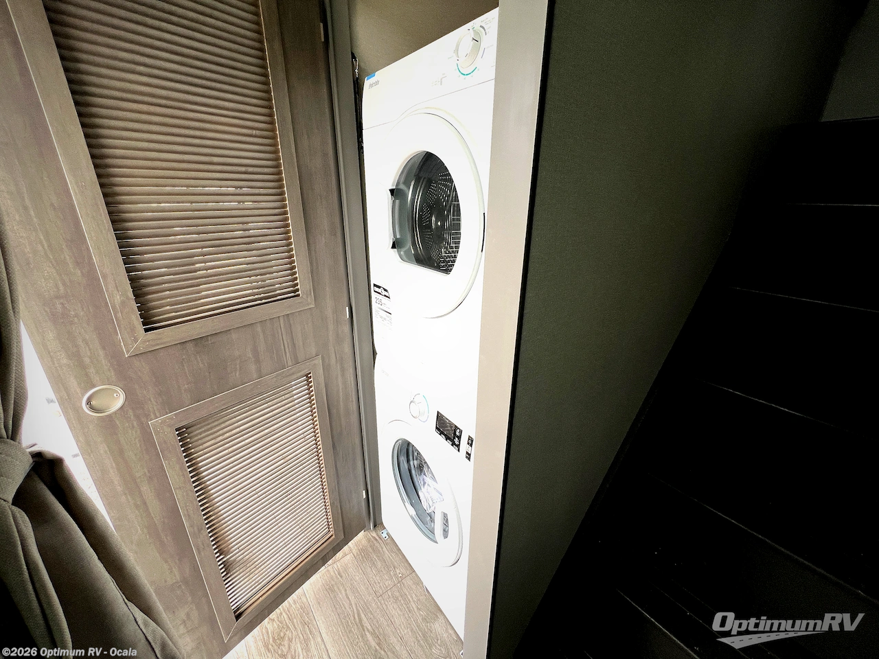 There is much to love about this destination trailer! Starting with the loft that has two queen beds, a wardrobe/storage, and a custom 58" x 71" bed. Downstairs there's a private bedroom with a king bed slide, a fireplace, and its very own private full bathroom complete with a dual sink vanity. The main living area has a huge bi-fold sleeper sectional sofa so you can fit even more guests, or just relax and watch the TV on the power lift in the entertainment center. The kitchen is well-equipped with a french door refrigerator, microwave, and pantry. The centerpiece here is a kitchen island with a deep basin farm-style sink and bar stool seating so your group can gather together and make new memories. The second full bath has a roomy 36" x 30" shower with glass door, and just around the corner find the stackable washer and dryer!