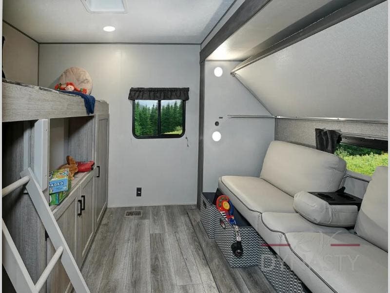 This half-ton friendly trailer is easy to pull and park, and is spacious thanks to the large slide out in the main living and kitchen area! You can dine at the booth dinette or choose the free standing dinette option, and the sofa offers drink holders for your drink when you're relaxing. The rear corner offers a full bathroom and a large wardrobe/pantry for the storage you need. The galley kitchen offers full amenities plus a breakfast bar where you can set out fresh fruit and cereal. And the 15' awning provides protection from the elements plus has the choice of multiple LED colors with the use of the remote.