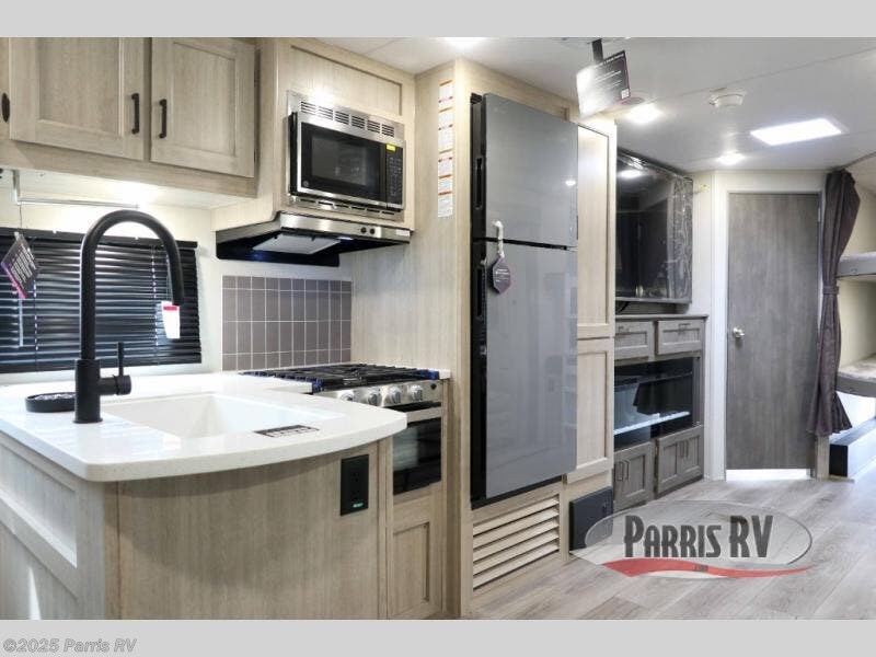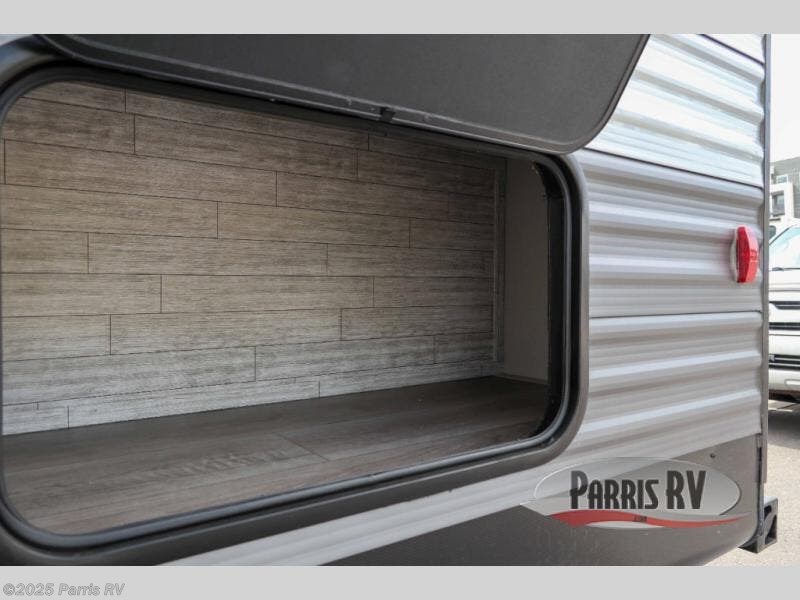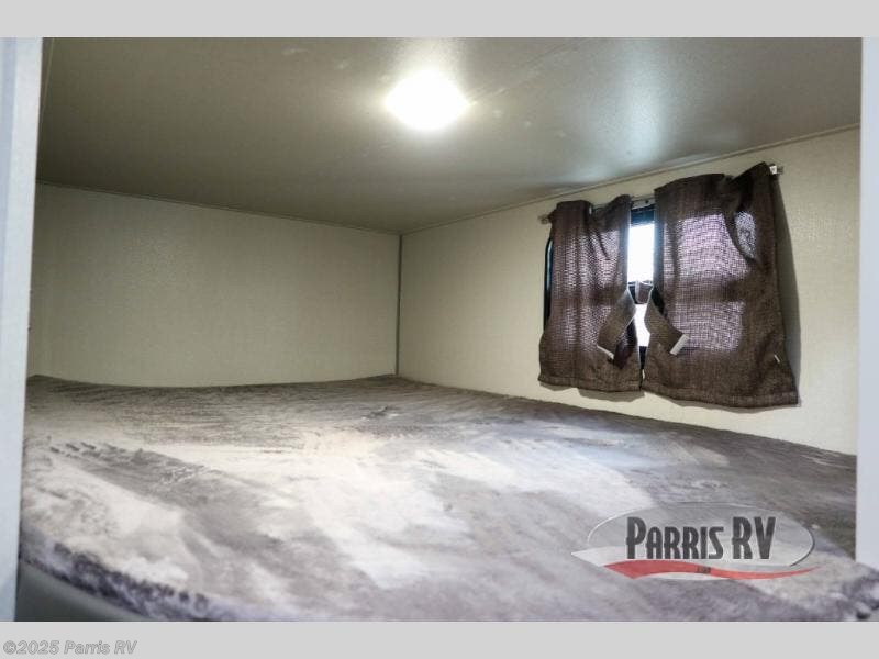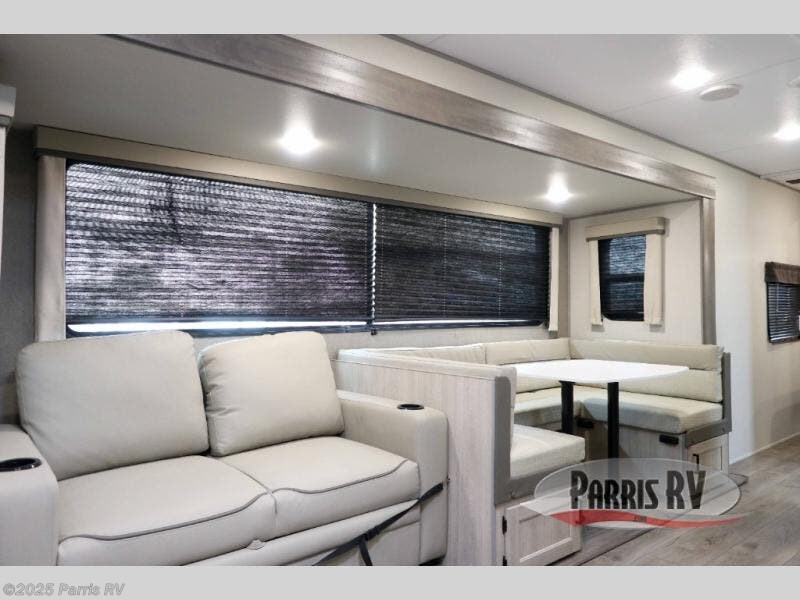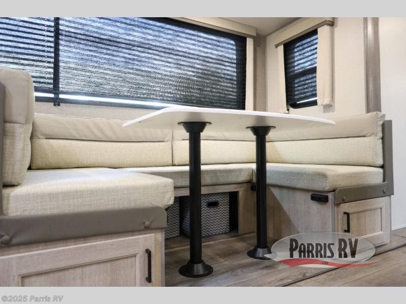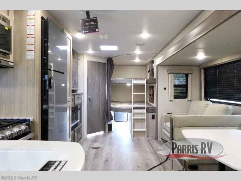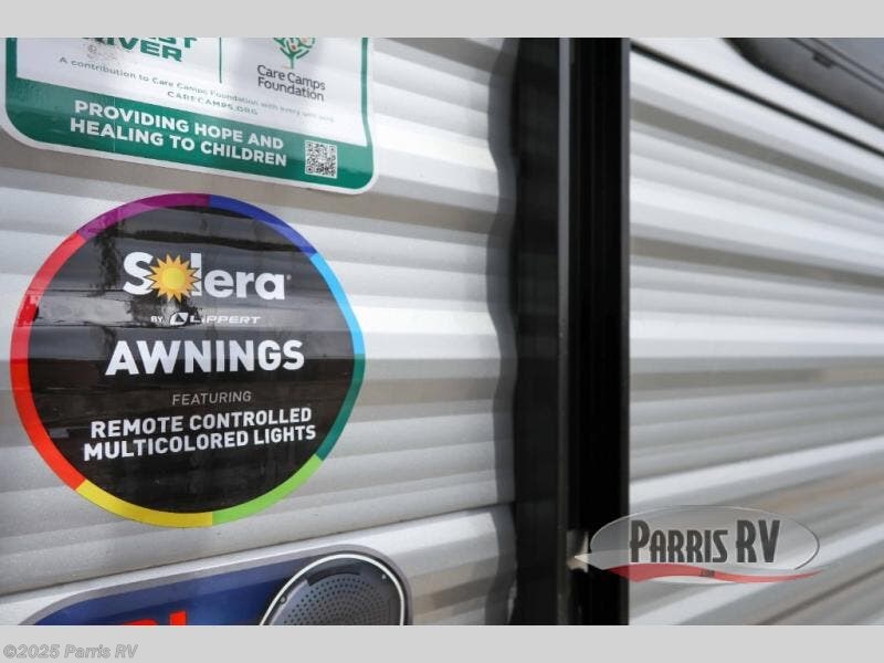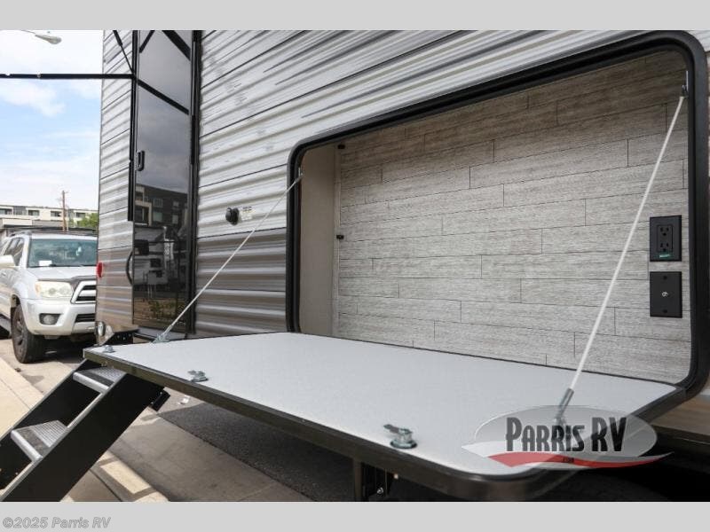 This travel trailer is perfect for your whole crew! Once you arrive at the campground, you can put out the 21' electric awning and start lunch on the exterior camper kitchen with a griddle and mini fridge. There is also a pass-thru storage plus additional exterior storage with a fold-down table and a TV hookup for added convenience. And since there are dual entry doors found on this unit, you can enter in through the full bath in the back, or the main living area towards the front! A large slide provides ample space to move about, and you'll find a trundle sofa and U-shaped dinette here for cozy seating and sleeping space. Speaking of sleeping, there is a front RV queen bed in the bedroom plus double-size bunks in the back for guests!