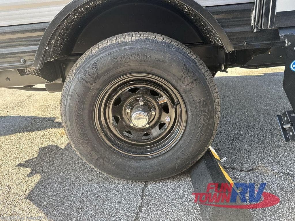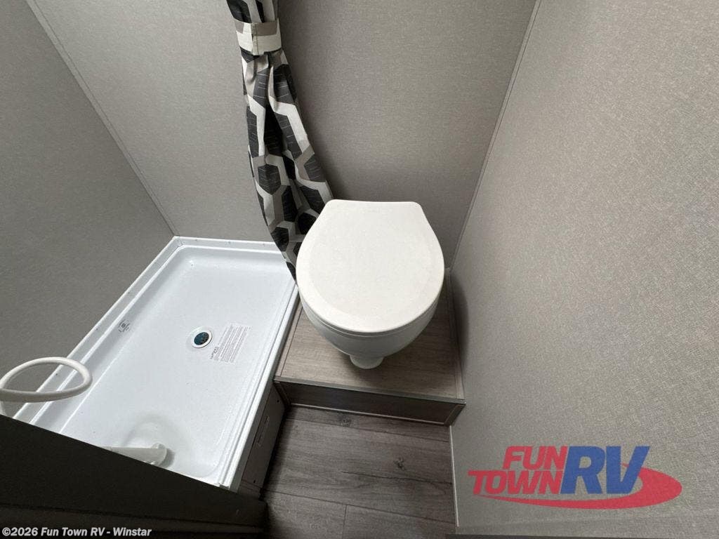 Lightweight camping is easier than you think with this travel trailer in tow! The front 54" x 74" bed will provide a great night's rest each night, while your overnight guest takes the booth dinette. There is a handy shelf above the front bed for your belongings plus additional bedroom storage. A private bath includes a 24" x 32" shower and a toilet with a mirror behind it so you can freshen up each day. You'll also find a two burner cooktop and microwave oven to make meals each day plus a 3.3 cu. ft. 12V refrigerator for food storage!