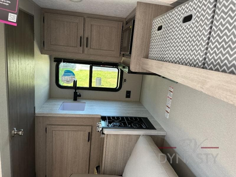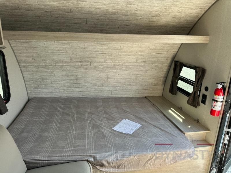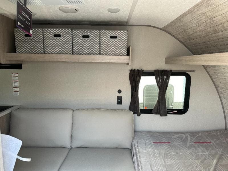 Lightweight camping is easier than you think with this travel trailer in tow! The front 54" x 74" queen bed will provide a great night's rest each night, while your overnight guest takes the 60" Jack knife sofa. There is a handy shelf above the front bed for your belongings plus a shelf with bins over the sofa. A private bath includes a 24" x 32" shower and a toilet with a mirror behind it so you can freshen up each day. You'll also find a two burner cooktop and microwave oven to make meals each day plus a 3.3 cu. ft. 12V refrigerator for food storage!