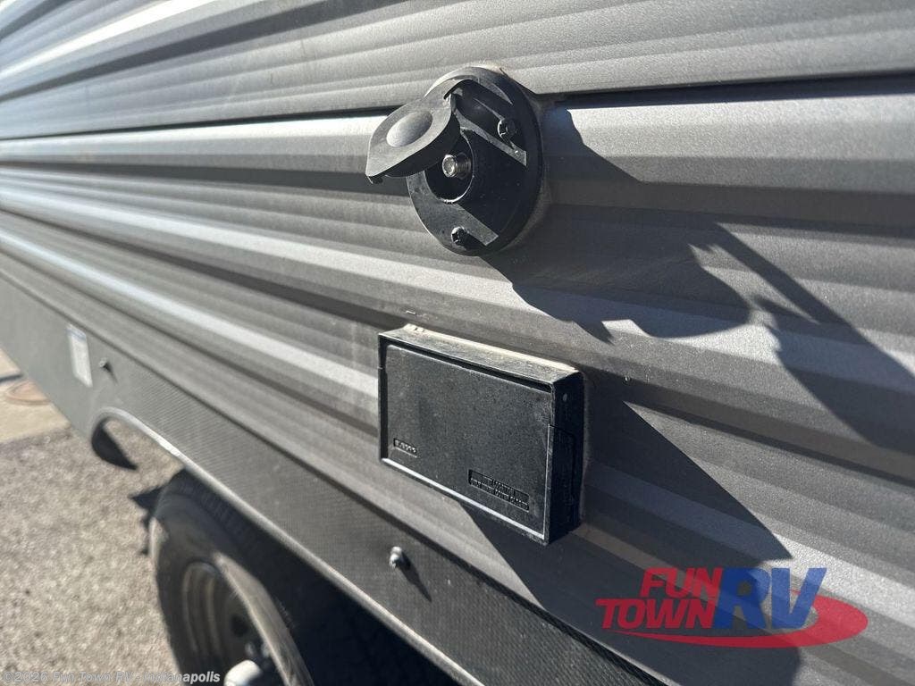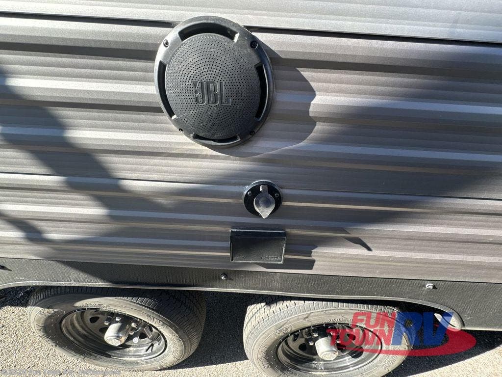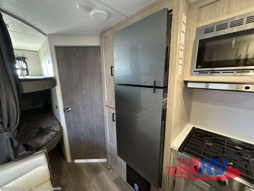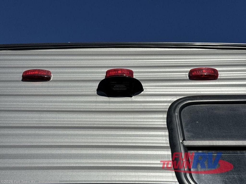 You'll love camping and spending time together in this travel trailer for seven! The bunk beds include under-bunk storage to keep bags out of the way, and the full bath is right next to the bunks for easy nighttime use. A semi-private bedroom up front includes a privacy curtain so you can get dressed each morning, and there are dual wardrobes to keep your things tidy. The chef of your group can whip up breakfast each morning on the three burner cooktop or in the GE stainless microwave, and there is a GE 10.7 cu. ft. 12V refrigerator to keep perishables fresh! A booth dinette provides a place to dine, or you can take your plate outdoors to sit under the 15' power awning with multicolored lights!