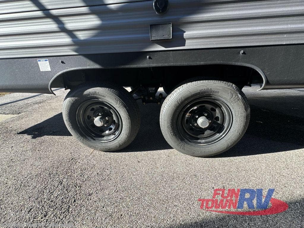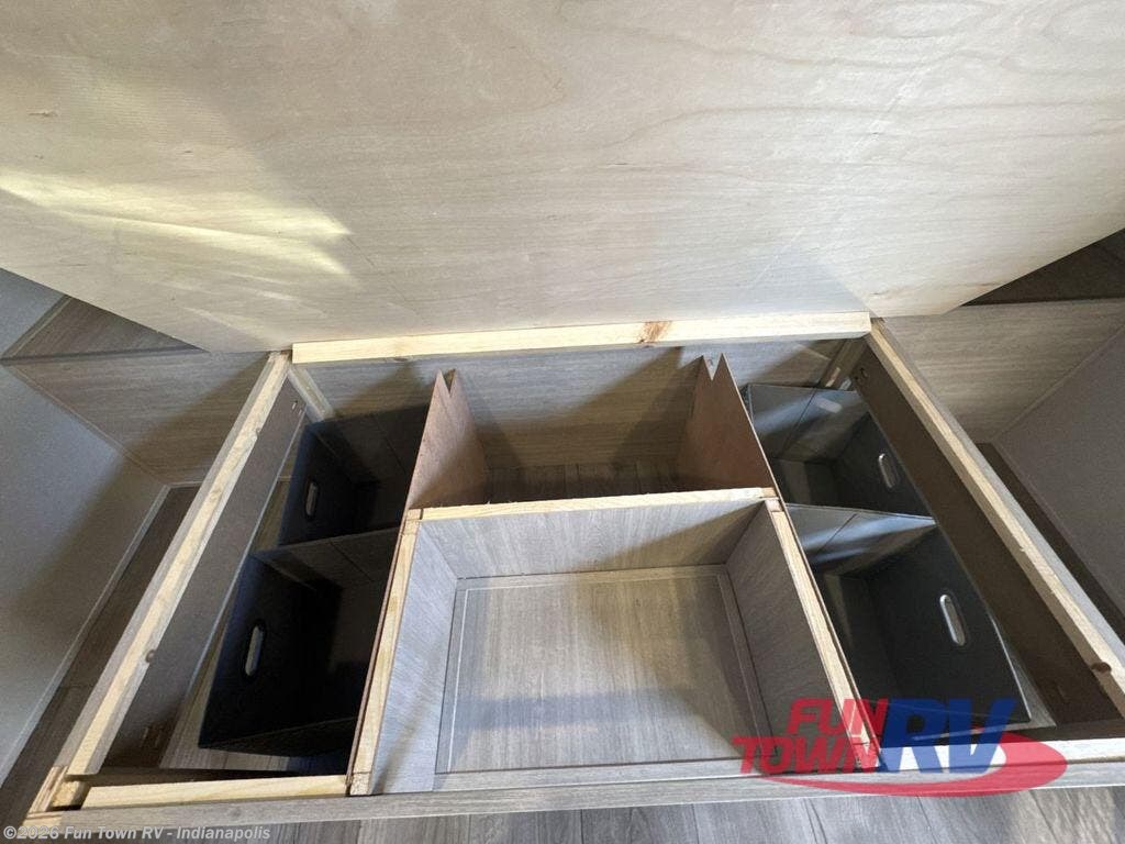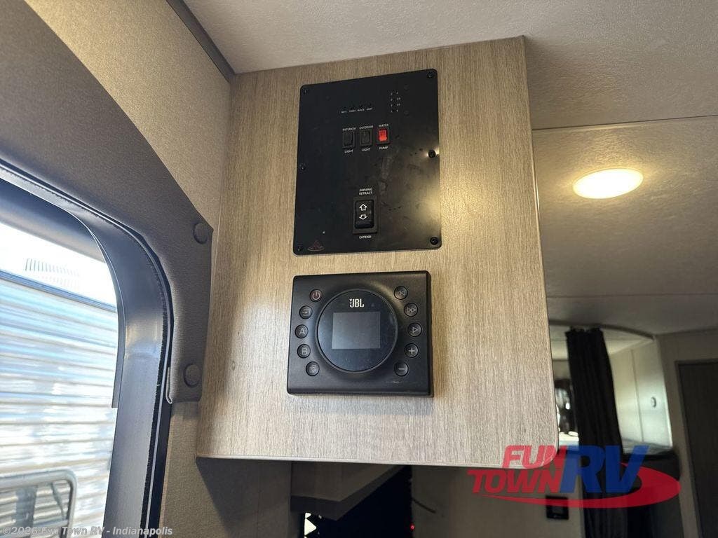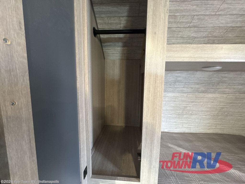 You'll love camping and spending time together in this travel trailer for seven! The bunk beds include under-bunk storage to keep bags out of the way, and the full bath is right next to the bunks for easy nighttime use. A semi-private bedroom up front includes a privacy curtain so you can get dressed each morning, and there are dual wardrobes to keep your things tidy. The chef of your group can whip up breakfast each morning on the three burner cooktop or in the GE stainless microwave, and there is a GE 10.7 cu. ft. 12V refrigerator to keep perishables fresh! A booth dinette provides a place to dine, or you can take your plate outdoors to sit under the 15' power awning with multicolored lights!