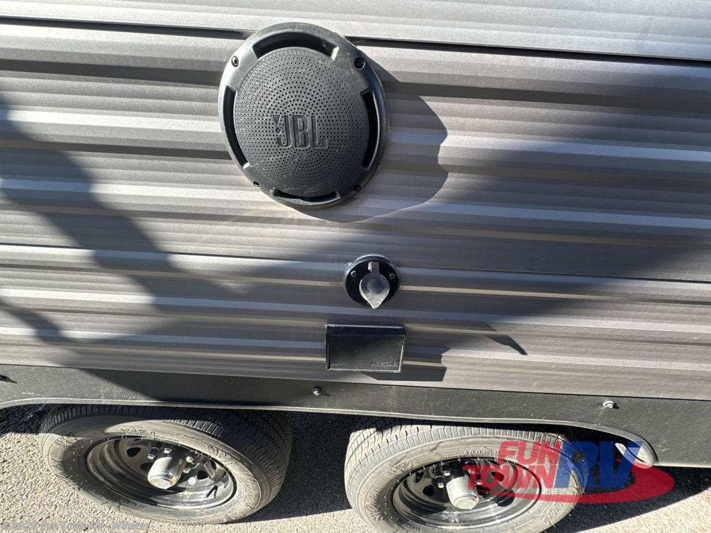 You'll love camping and spending time together in this travel trailer for seven! The bunk beds include under-bunk storage to keep bags out of the way, and the full bath is right next to the bunks for easy nighttime use. A semi-private bedroom up front includes a privacy curtain so you can get dressed each morning, and there are dual wardrobes to keep your things tidy. The chef of your group can whip up breakfast each morning on the three burner cooktop or in the GE stainless microwave, and there is a GE 10.7 cu. ft. 12V refrigerator to keep perishables fresh! A booth dinette provides a place to dine, or you can take your plate outdoors to sit under the 15' power awning with multicolored lights!
