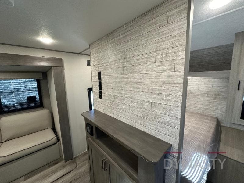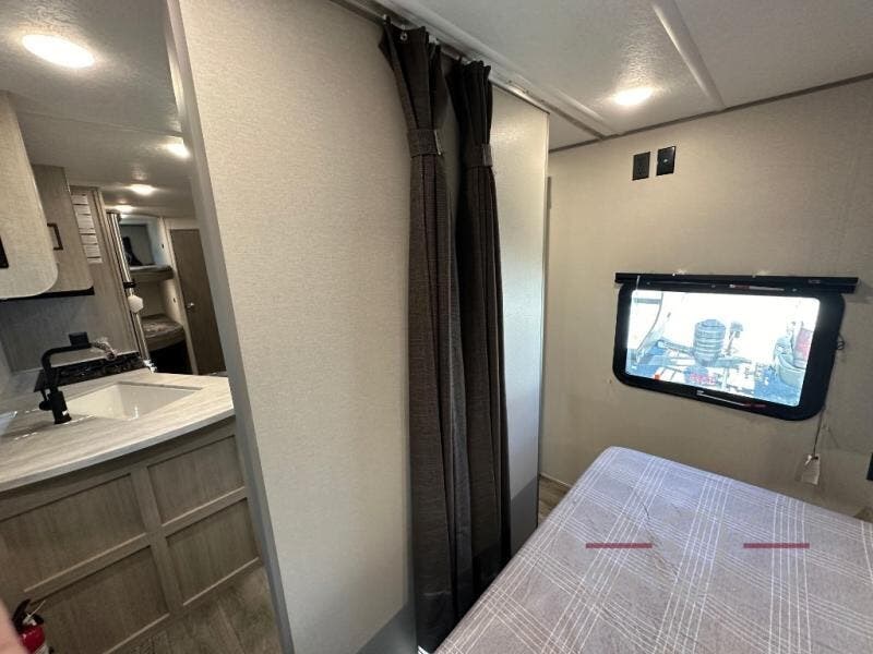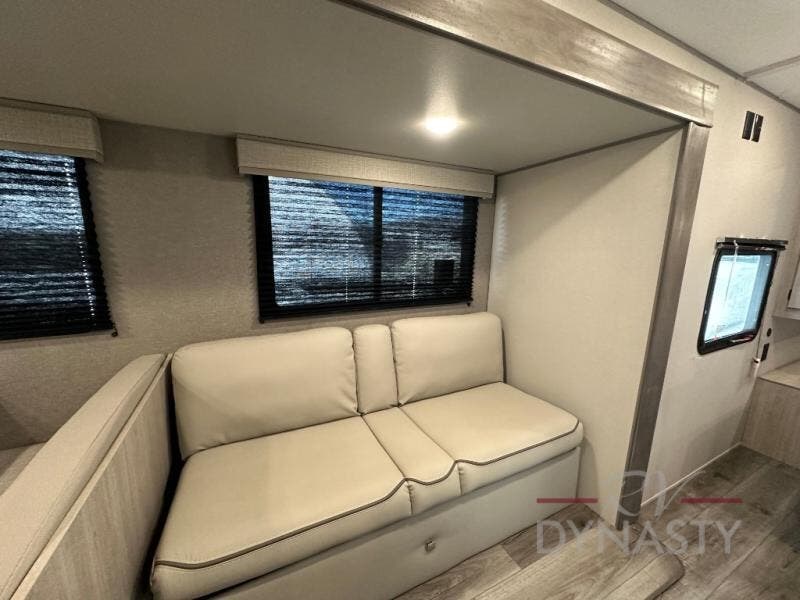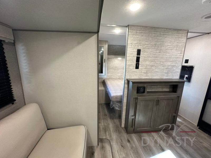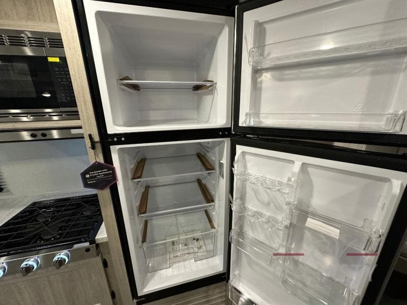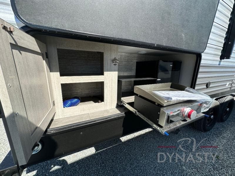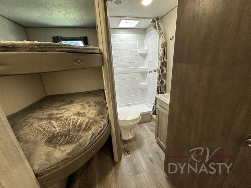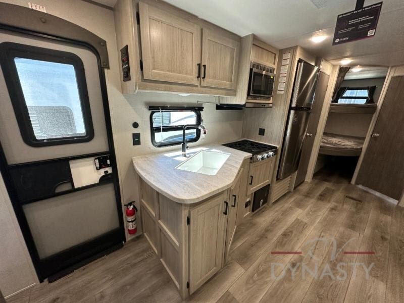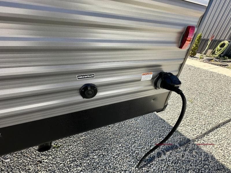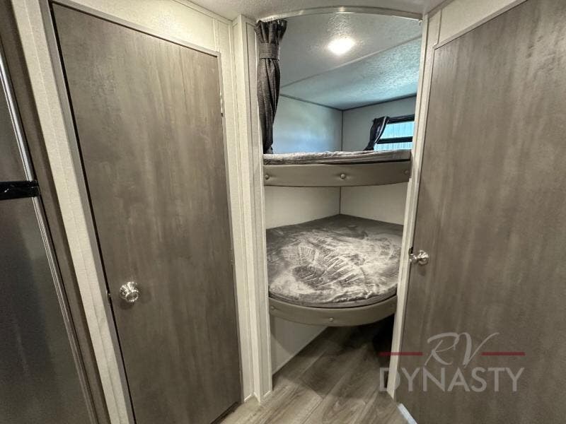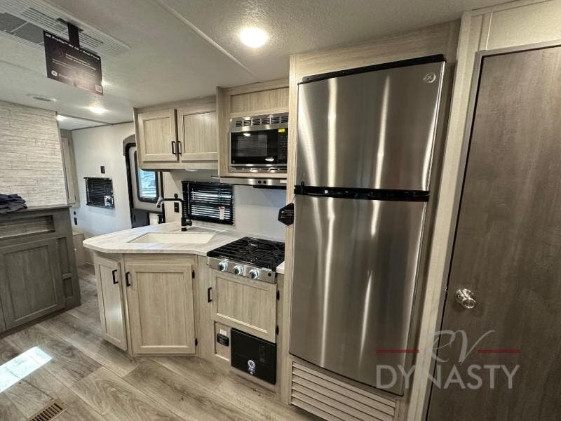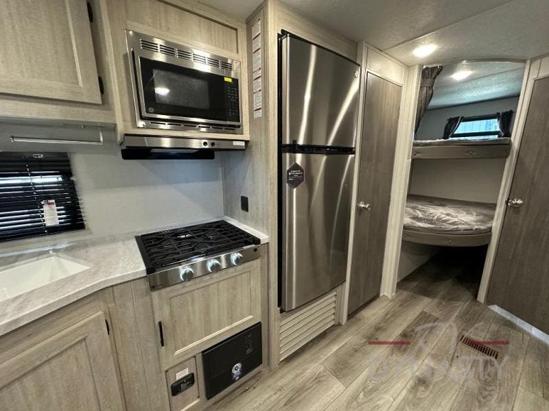 This is the perfect mid-size travel trailer for you and your family! The 46" x 74" double-size bunk beds with lower interior storage offer a comfortable sleeping space for the kids and you will have your own private sleeping space with the 60" x 74" queen bed in the front private bedroom. Freshen up each morning in the rear corner bathroom with the tub/shower and a mirror to get ready each morning. You can prepare your best home cooked meals with the GE stainless three burner cooktop and GE stainless 10.7 cu. ft. 12V refrigerator, then enjoy them together at the booth dinette. The sofa is near the entertainment center for a relaxing movie night. Don't leave any of your outdoor gear behind either thanks to the front pass-through storage area and the exterior outside storage area. You could even add the optional outside camper kitchen to grill the catch of the day on the pull out griddle!