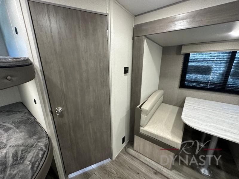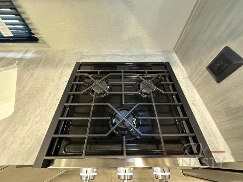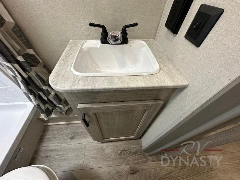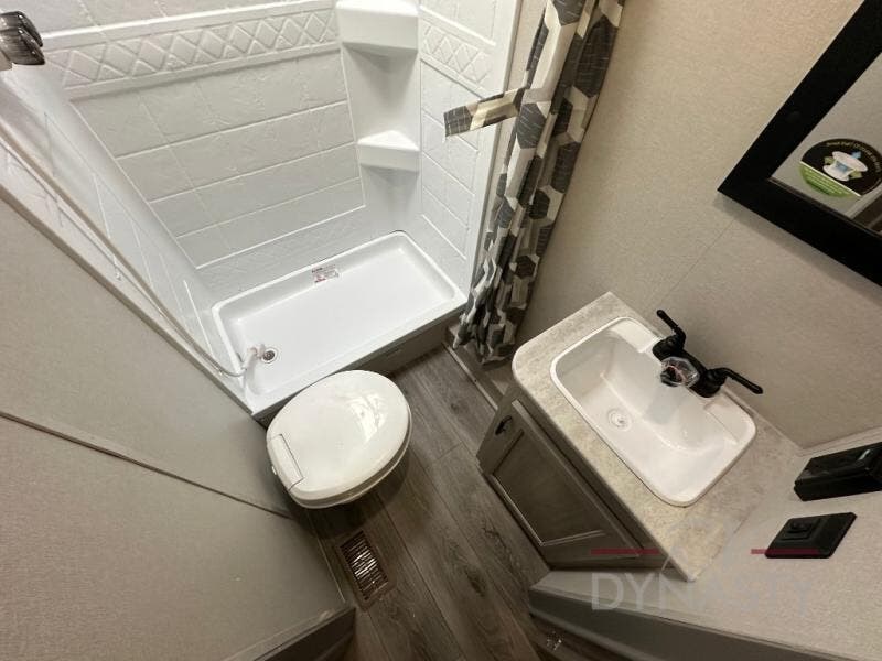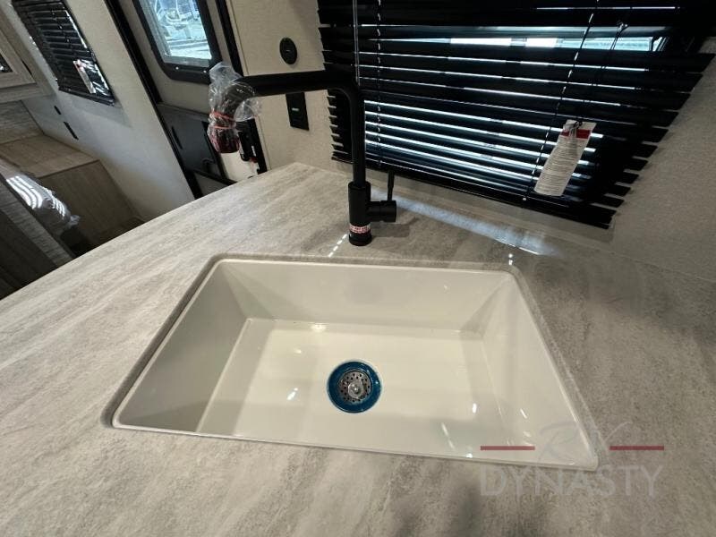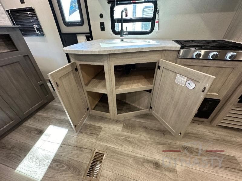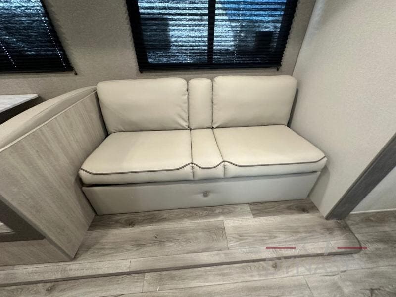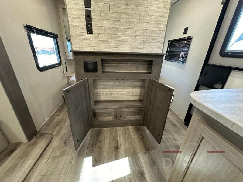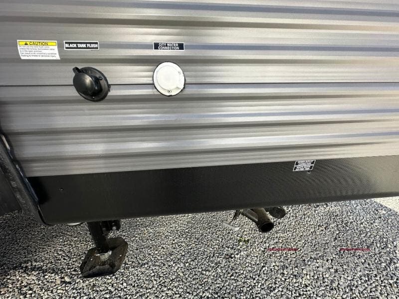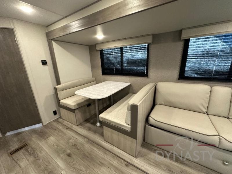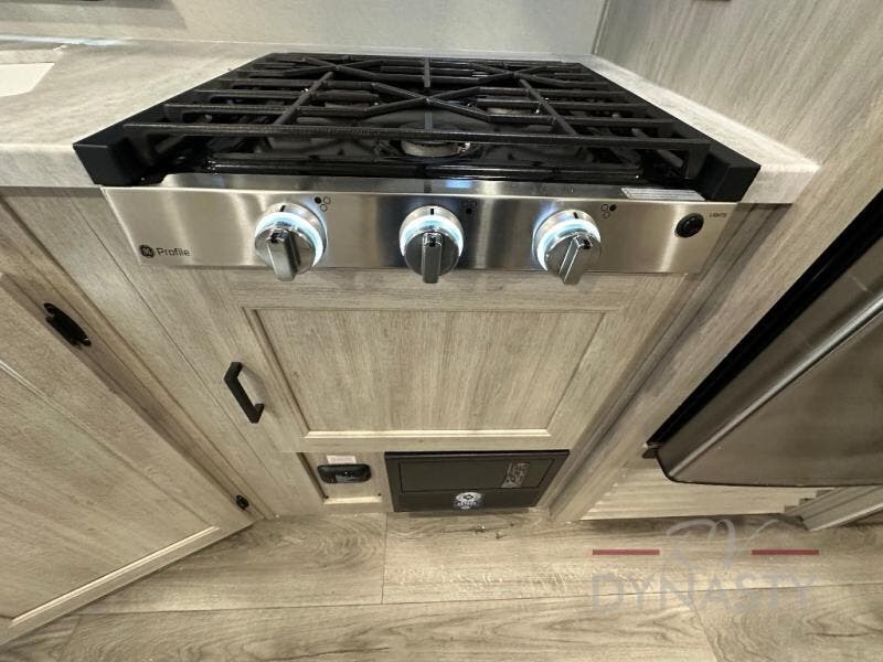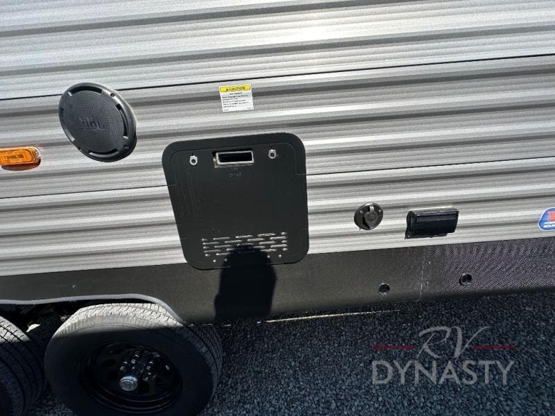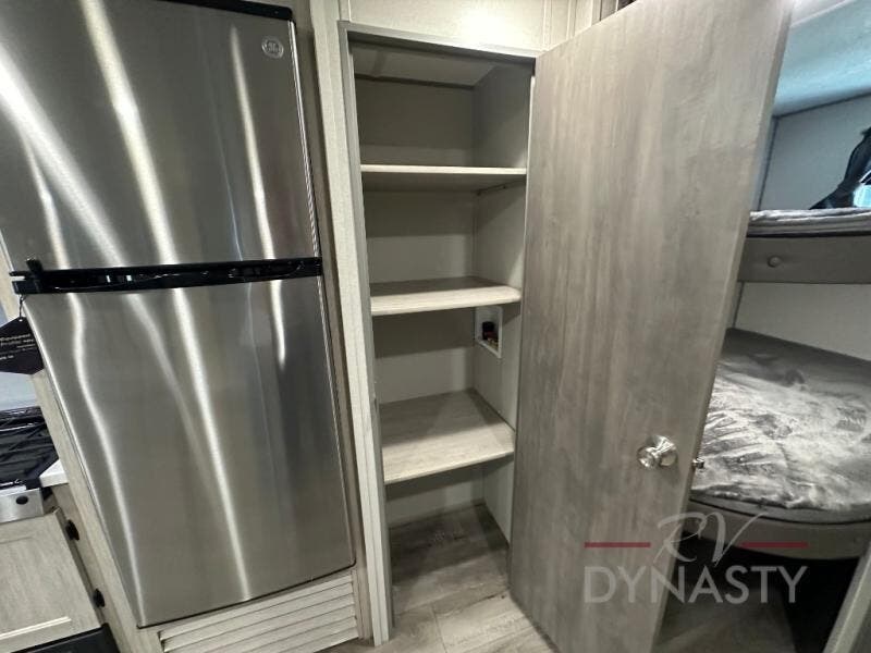 This is the perfect mid-size travel trailer for you and your family! The 46" x 74" double-size bunk beds with lower interior storage offer a comfortable sleeping space for the kids and you will have your own private sleeping space with the 60" x 74" queen bed in the front private bedroom. Freshen up each morning in the rear corner bathroom with the tub/shower and a mirror to get ready each morning. You can prepare your best home cooked meals with the GE stainless three burner cooktop and GE stainless 10.7 cu. ft. 12V refrigerator, then enjoy them together at the booth dinette. The sofa is near the entertainment center for a relaxing movie night. Don't leave any of your outdoor gear behind either thanks to the front pass-through storage area and the exterior outside storage area. You could even add the optional outside camper kitchen to grill the catch of the day on the pull out griddle!