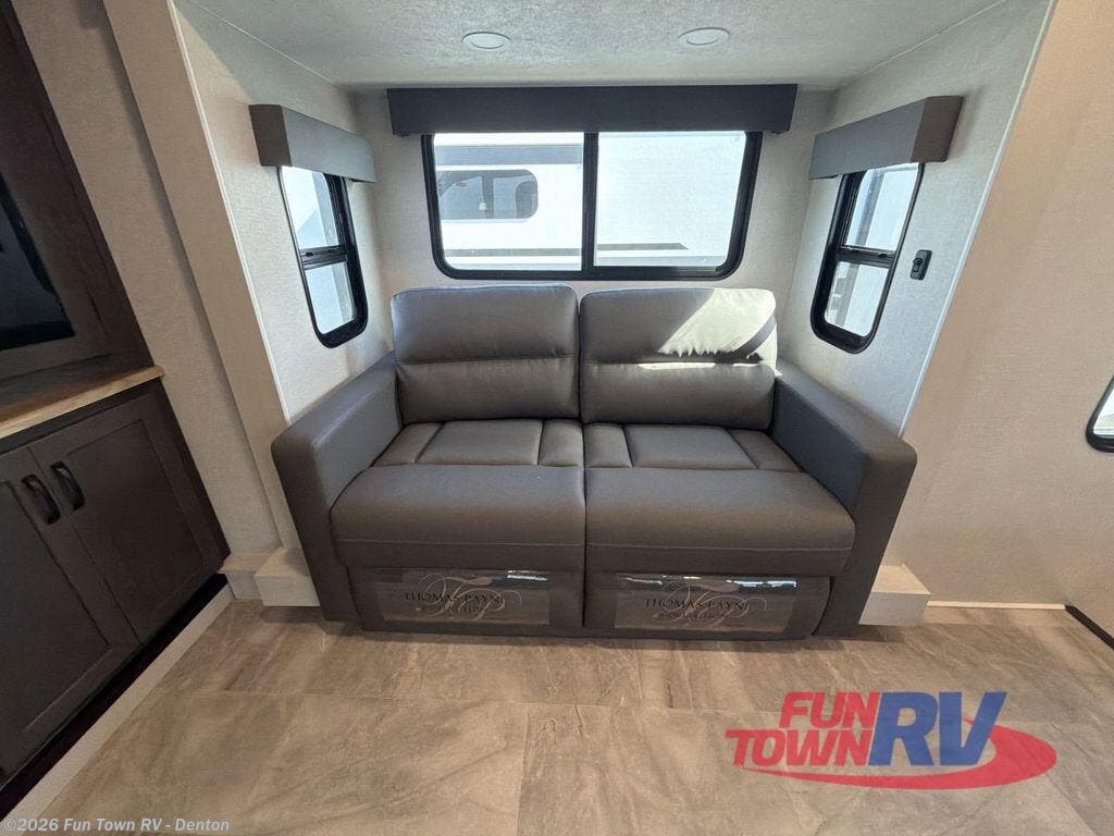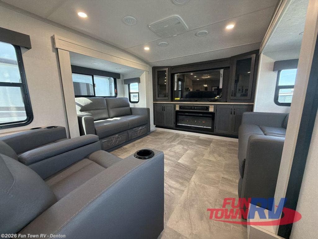 Camping or full-timing in this spacious fifth wheel will make the whole family happy. Your crew will love to visit in the front living area that included two tri-fold hide-a-bed sofas, theatre seating with a side table, plus an entertainment center for a 50" 4K Smart LED TV. The kitchen is any chef's dream with its kitchen island, large pantry, plus a hutch to store nice dishes, and stainless steel appliances. And the free-spanning table will allow you to dine just like you do at home. Head to the master suite to find a king bed slide out, two dressers, plus a full rear bath with dual bath sinks!