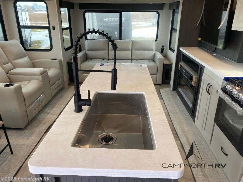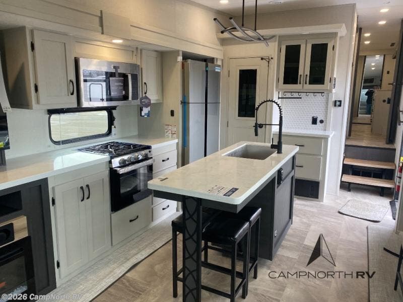 Are you wanting to trade out your busy work weeks for relaxing vacations? This fifth wheel can give you just that! Once you arrive at your destination, set up the 16' power awning with LED lights and enjoy some fresh air before you unpack your bags. The chef can start lunch on the GE Profile 21" oven with a residential cooktop, and there is an island with two barstools if the little ones want to color while they wait on their food. This model also includes a large pantry plus extra counter space with overhead storage for dishes. Everyone can take turns cleaning up in the full bath that includes a spacious shower and a linen closet to keep clean towels close by. When it's time to call it a night, you'll enjoy the king bed slide out in the front bedroom, while your guests take the rear tri-fold hide-a-bed sofa!