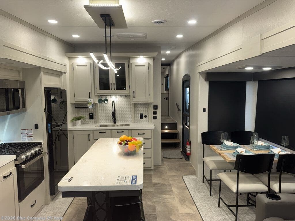 What could be better than a camping trip with family and friends? A camping trip in this spacious fifth wheel that can sleep eight people comfortably! There is a private middle bunkhouse with double-size bunks and overhead cabinets to store belongings, and a front private bedroom with a queen bed slide out. You'll find storage space in the large bedroom wardrobe that also includes washer and dryer prep if you plan to go full-time or camp for longer periods of time. Everyone can meet in the main living area that includes dual opposing slides, theatre seating, a free-spanning table, plus a tri-fold hide-a-bed sofa! And we didn't even mention the fully-equipped kitchen with stainless steel appliances, an extra deep single basin sink, plus tons of counter space with overhead cabinets for more storage!