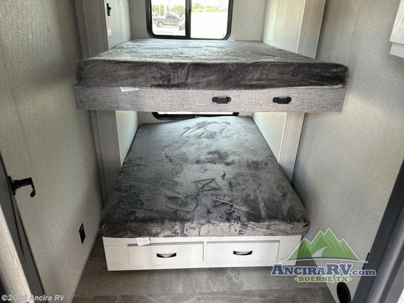 They say you can't have it all, but you can almost have it all with this fifth wheel in tow! This is the perfect unit to camp with family or a large group of friends since it features two private bunkhouses, two full baths, and two entry doors! The rear bunkhouse includes its own full bath, a tri-fold sofa and a flip-down bunk, plus a dresser to store clothes. Within the middle bunkhouse you'll find double-size bunks and overhead cabinets for your guests' things. Everyone will love to visit in the main living area that includes a free-standing table, theatre seating, and an entertainment center with a 50" 4K Smart LED TV. This Chaparral kitchen is complete with an island peninsula, pantry, plus a 16 cu. ft. side-by-side 12V refrigerator. There is also an outside entertainment center and an outside refrigerator to keep cold drinks stocked.