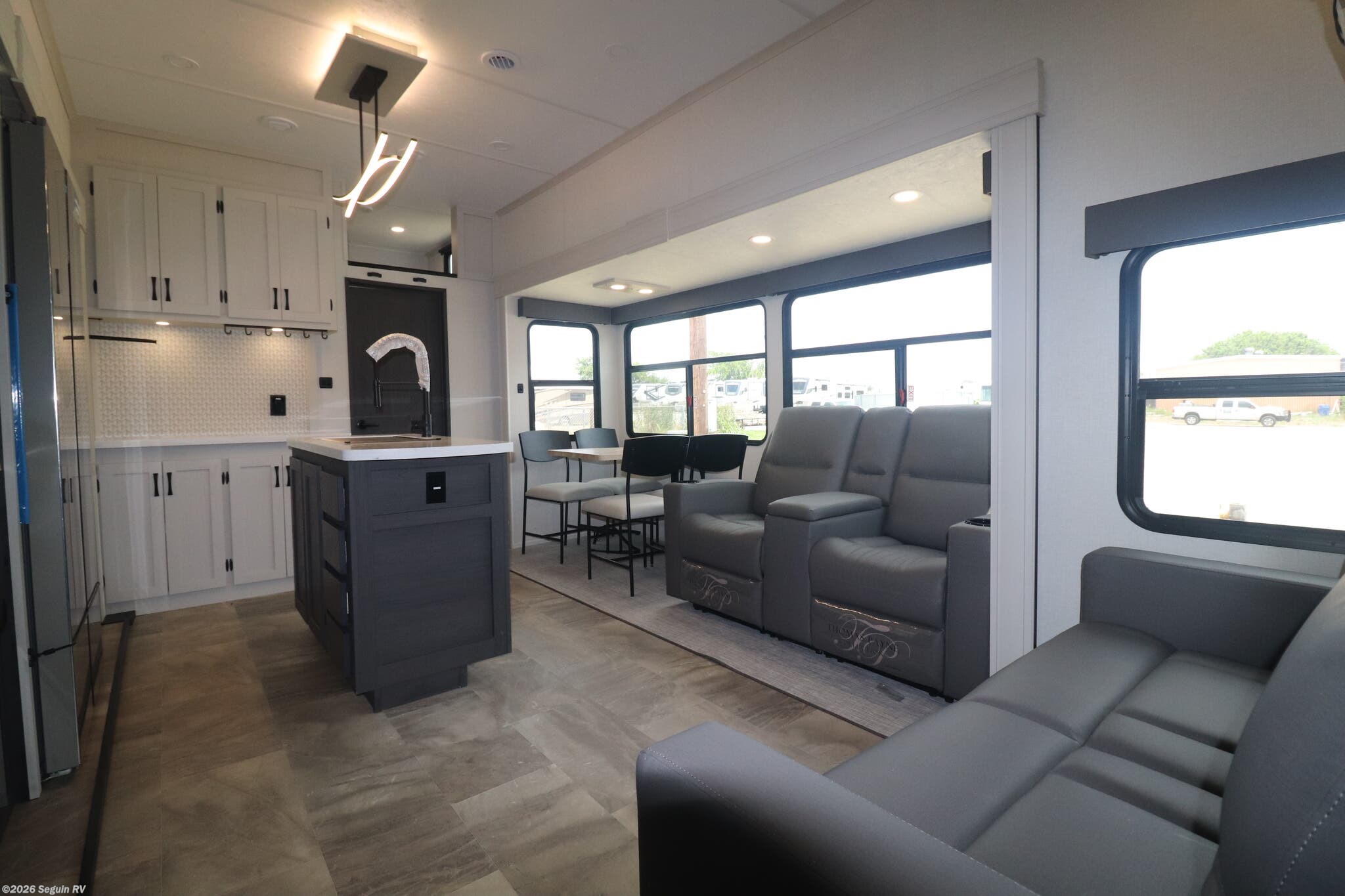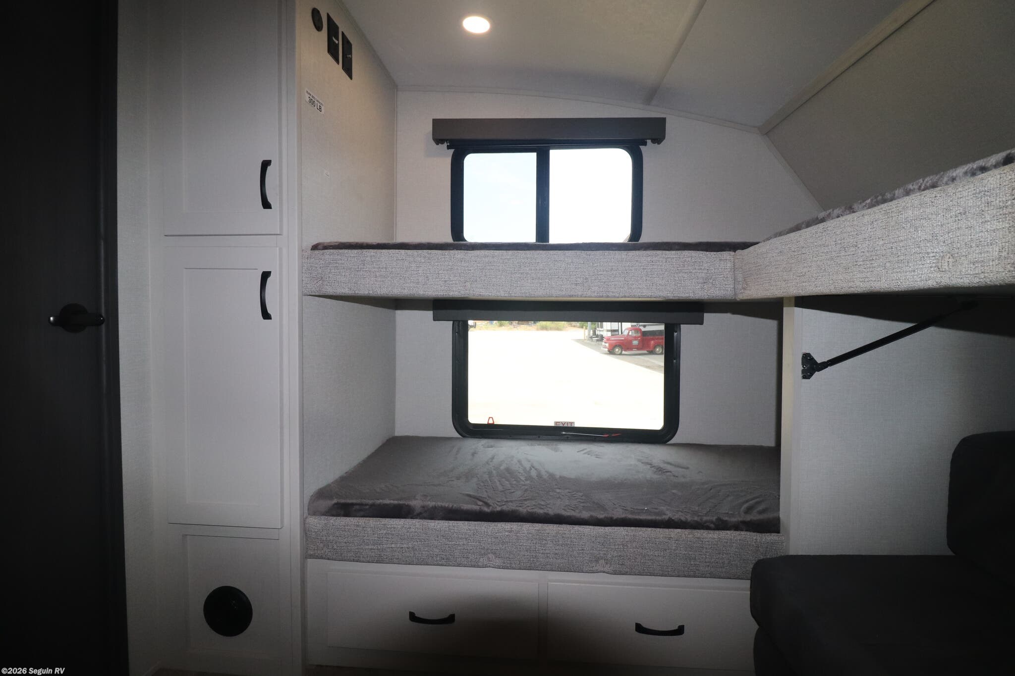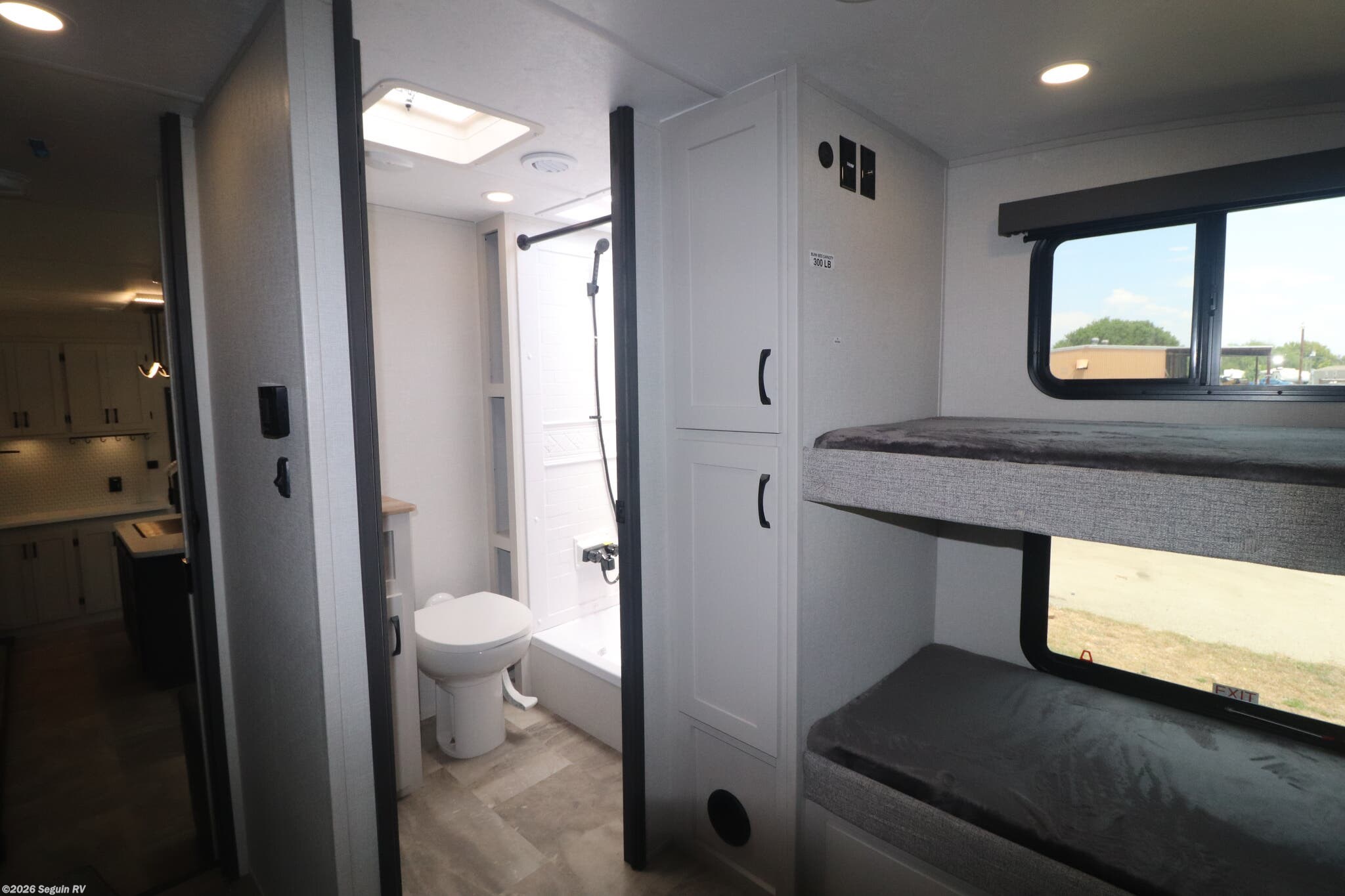 The 375BAF floorplan offers a versatile bunkhouse layout with a practical flow for families and guests. This layout includes a bunkhouse area, a mid kitchen for easy meal prep, and a mid living area that opens up to the central lounge. A rear bath and a front bath provide convenient options for overnight guests, while a rear bedroom creates a private retreat after a day of exploring. The bunkhouse configuration helps maximize sleeping capacity without compromising common living space, making this coach ideal for multi-generational trips or large groups.