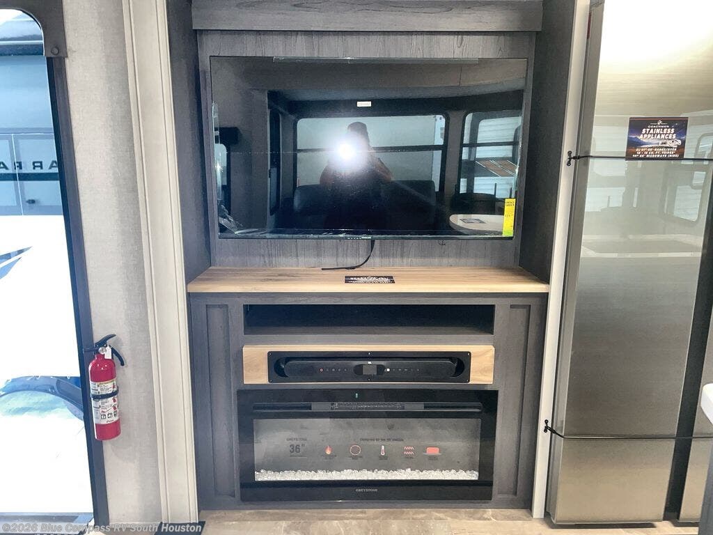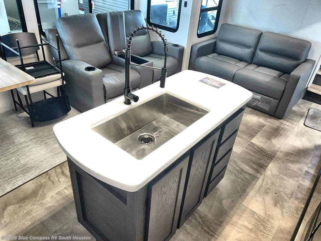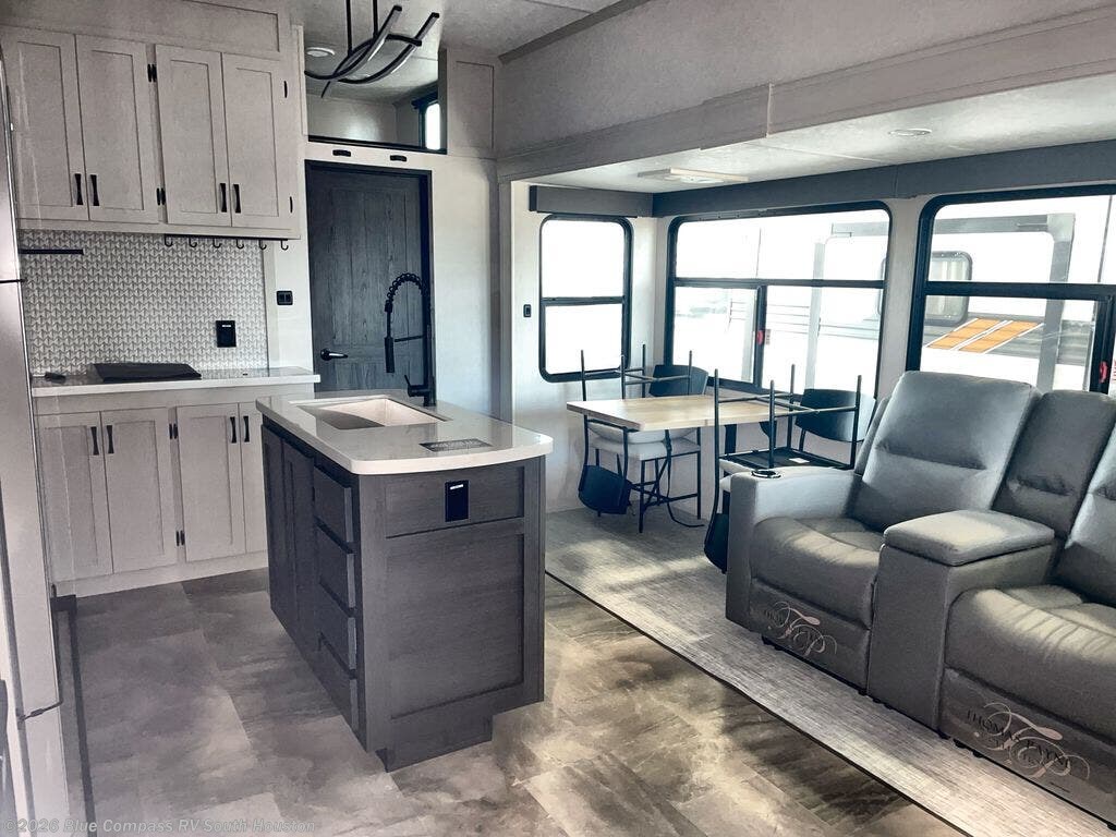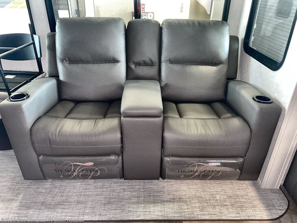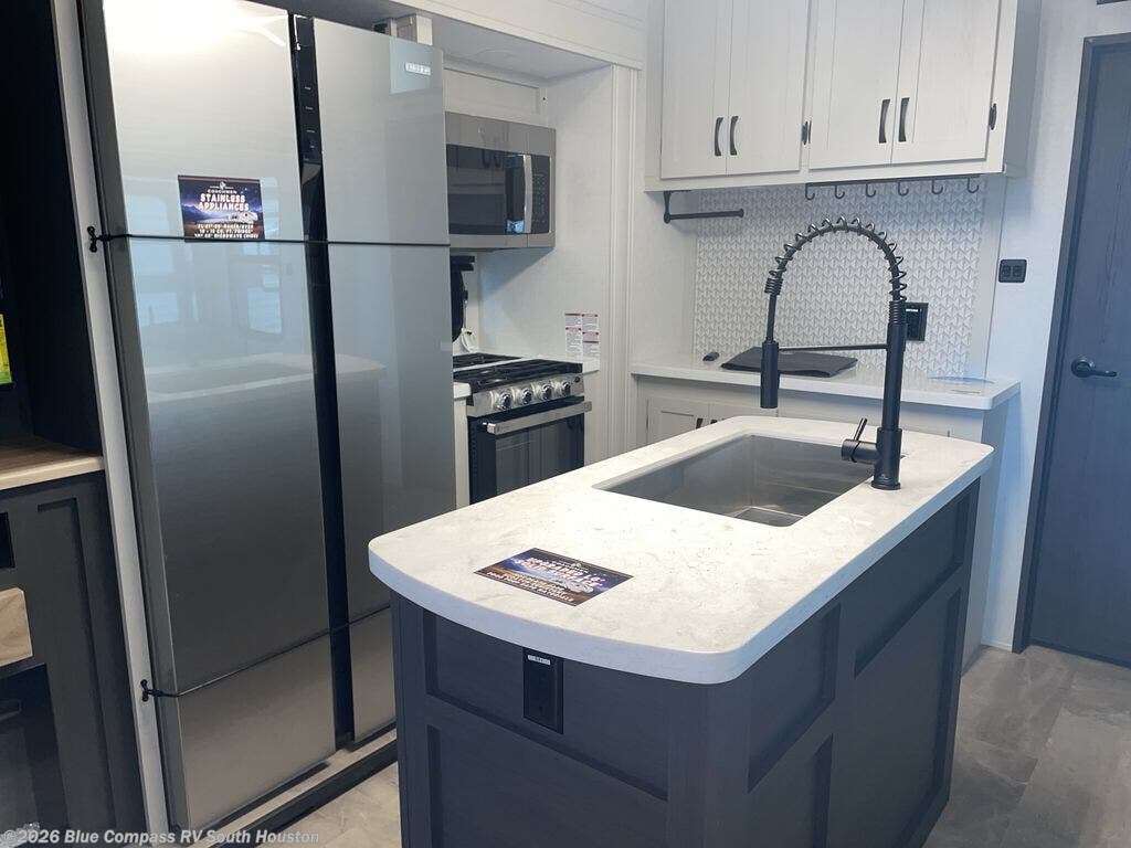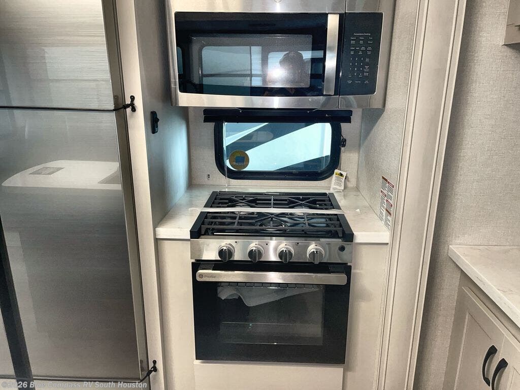 One look at this fifth wheel and you'll be sold! There are an impressive two master suites; one up front with a queen bed and full bath, and one towards the back with a king bed slide and second full bath! There are even dual bath sinks in the rear bath for added convenience! The middle living area includes dual opposing slides, a tri-fold sofa, plus theater seating and a free-spanning table for ample seating, dining, and sleeping space. There is also an entertainment center with a 50" 4K Smart LED TV to wash away those rainy day blues. The chef of your crew will have a GE Profile 21" stainless steel oven with a residential cooktop and a GE Profile stainless residential microwave to cook meals each day, a kitchen island for more counter space, and a 16 cu. ft. side-by-side 12V refrigerator for food storage.