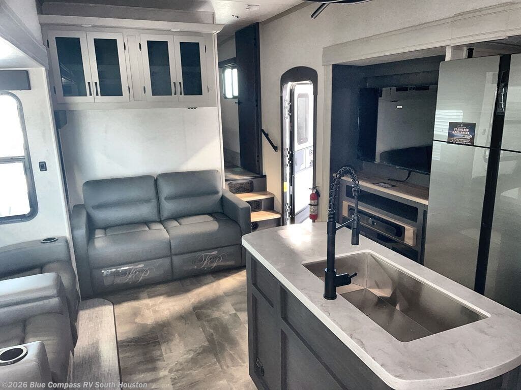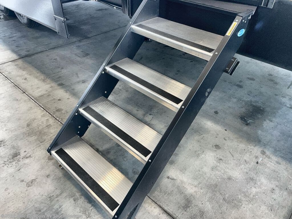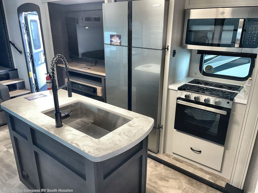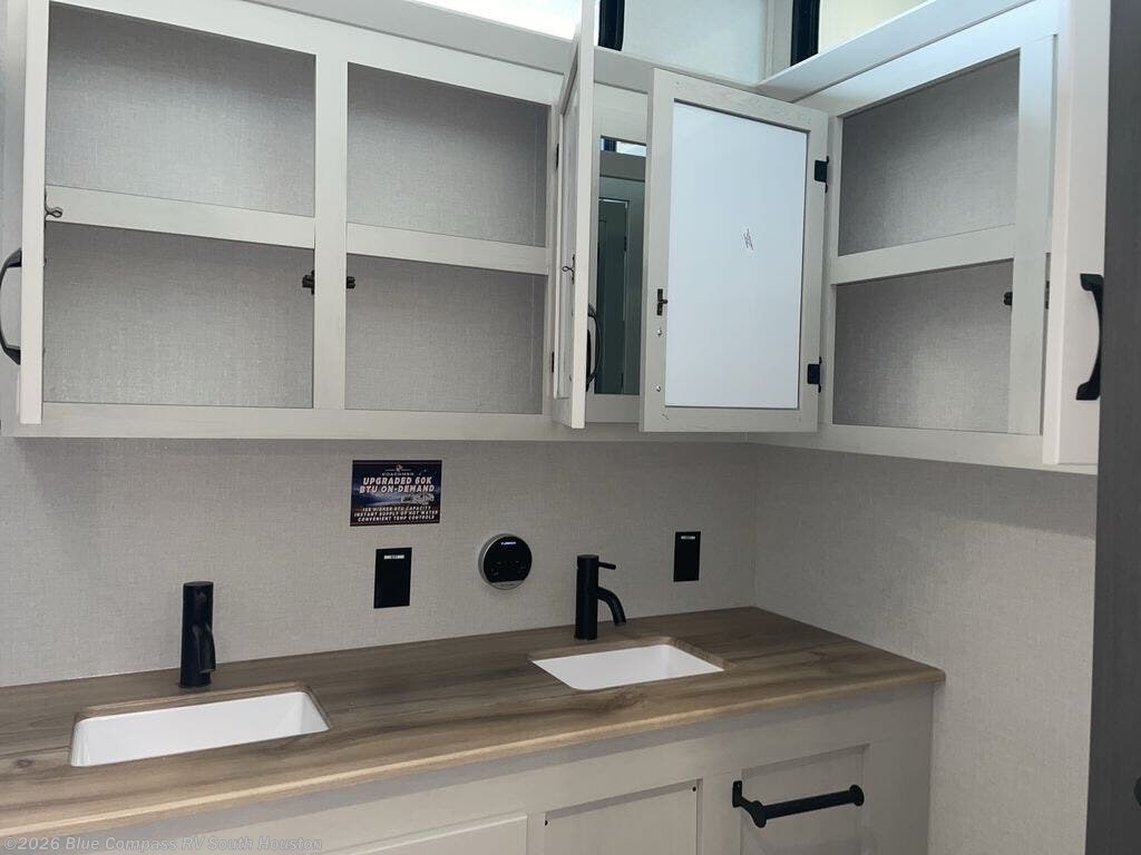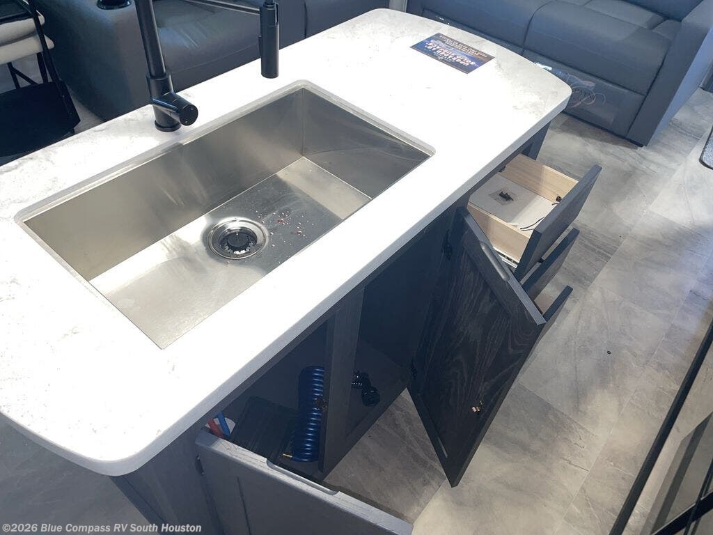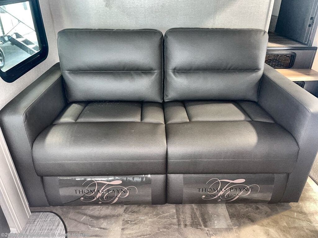 One look at this fifth wheel and you'll be sold! There are an impressive two master suites; one up front with a queen bed and full bath, and one towards the back with a king bed slide and second full bath! There are even dual bath sinks in the rear bath for added convenience! The middle living area includes dual opposing slides, a tri-fold sofa, plus theater seating and a free-spanning table for ample seating, dining, and sleeping space. There is also an entertainment center with a 50" 4K Smart LED TV to wash away those rainy day blues. The chef of your crew will have a GE Profile 21" stainless steel oven with a residential cooktop and a GE Profile stainless residential microwave to cook meals each day, a kitchen island for more counter space, and a 16 cu. ft. side-by-side 12V refrigerator for food storage.