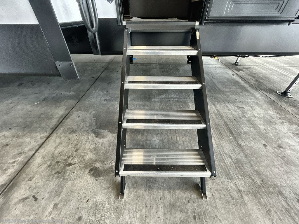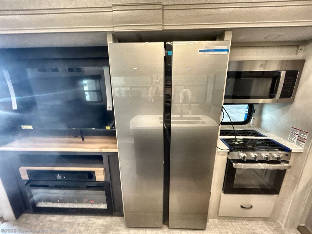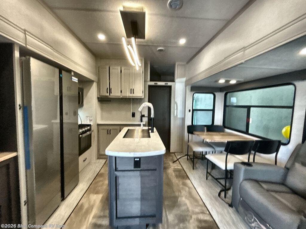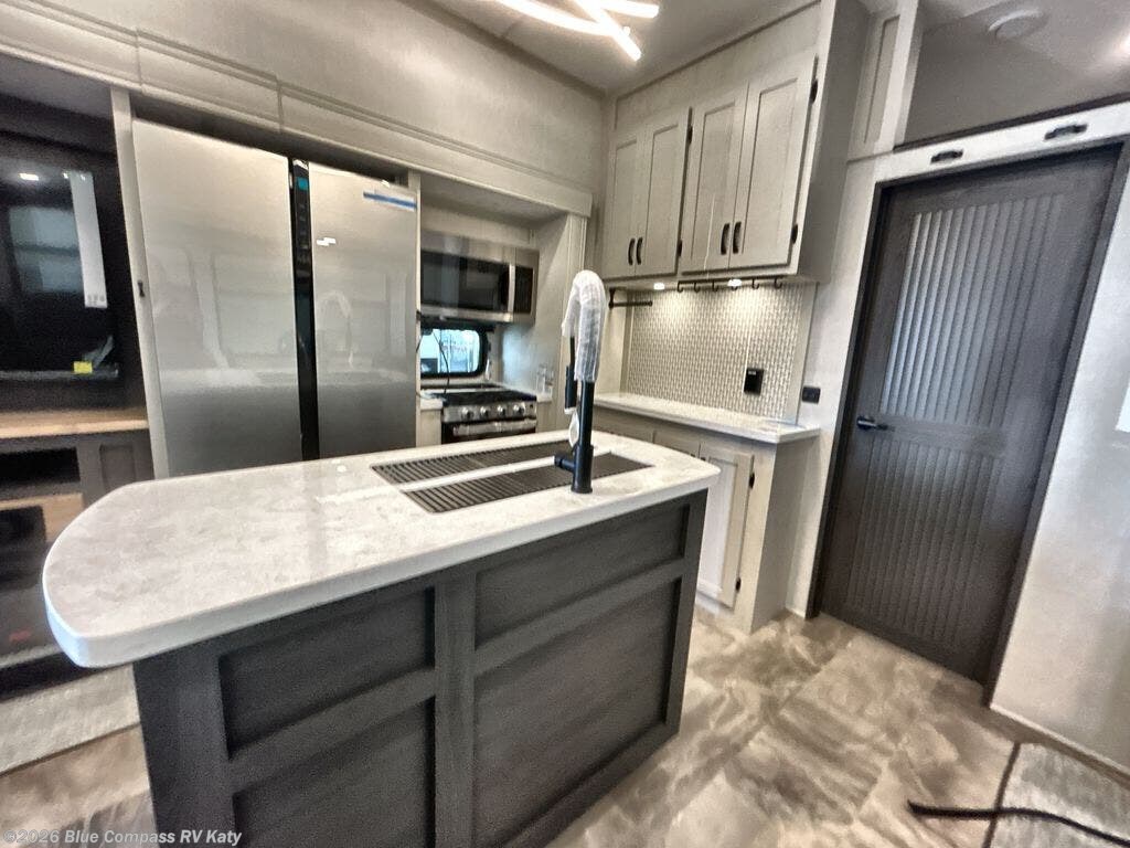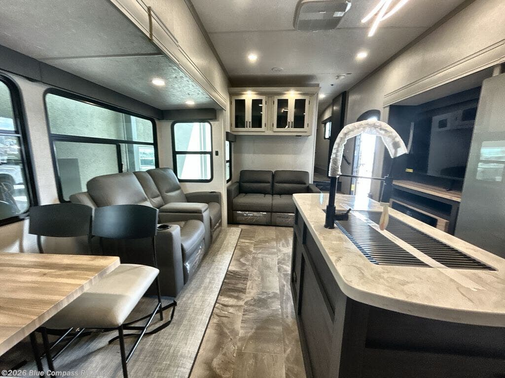 One look at this fifth wheel and you'll be sold! There are an impressive two master suites; one up front with a queen bed and full bath, and one towards the back with a king bed slide and second full bath! There are even dual bath sinks in the rear bath for added convenience! The middle living area includes dual opposing slides, a tri-fold sofa, plus theater seating and a free-spanning table for ample seating, dining, and sleeping space. There is also an entertainment center with a 50" 4K Smart LED TV to wash away those rainy day blues. The chef of your crew will have a GE Profile 21" stainless steel oven with a residential cooktop and a GE Profile stainless residential microwave to cook meals each day, a kitchen island for more counter space, and a 16 cu. ft. side-by-side 12V refrigerator for food storage.