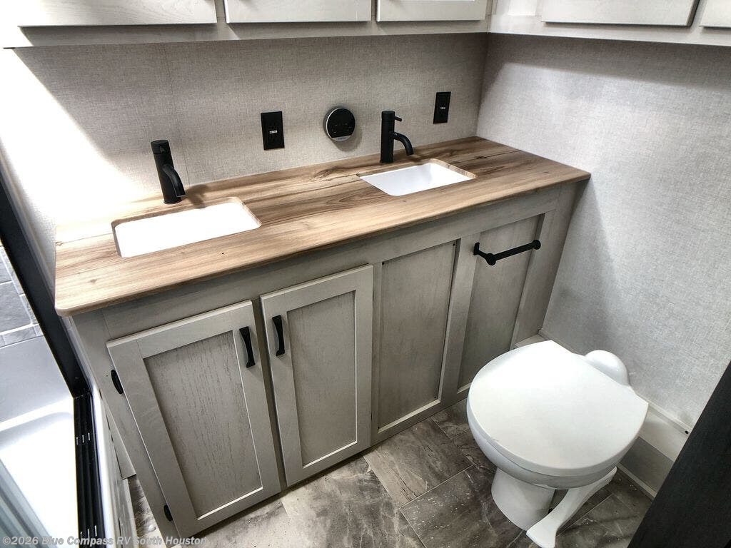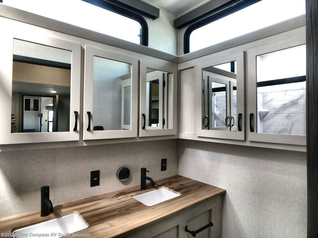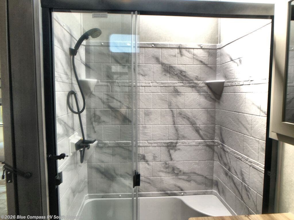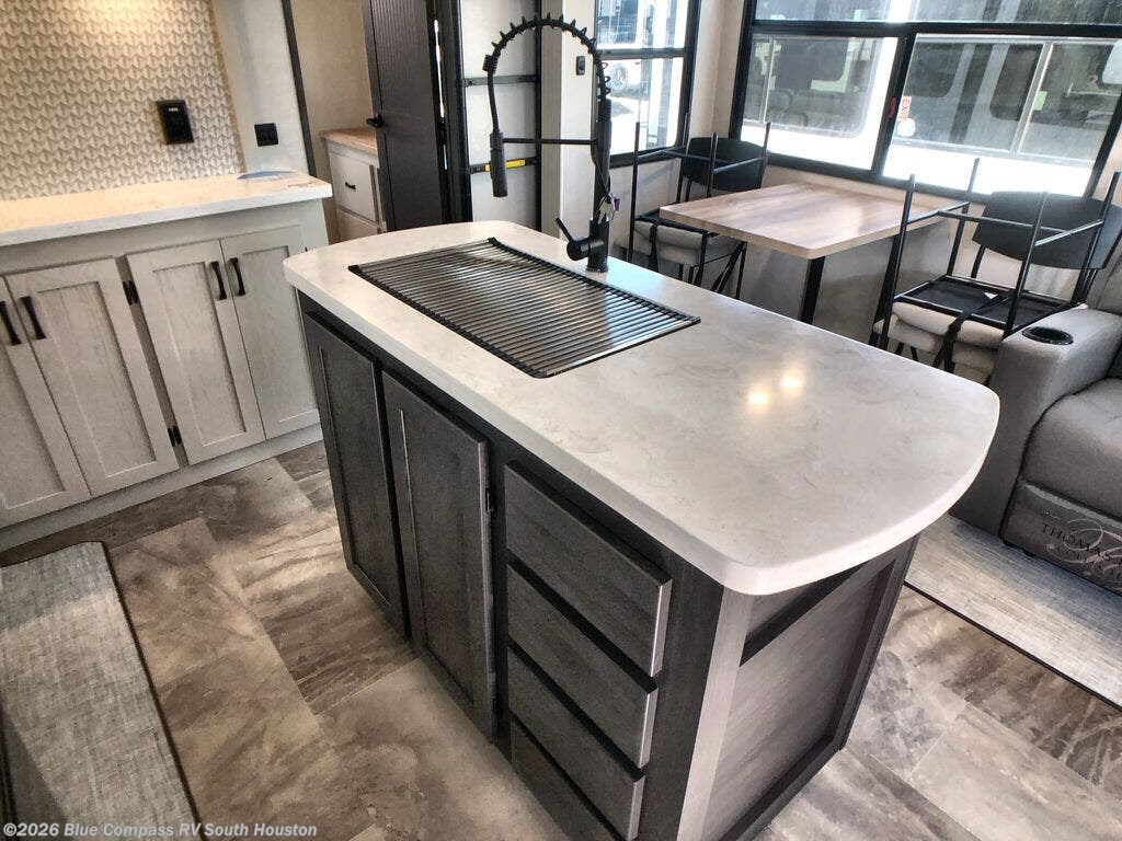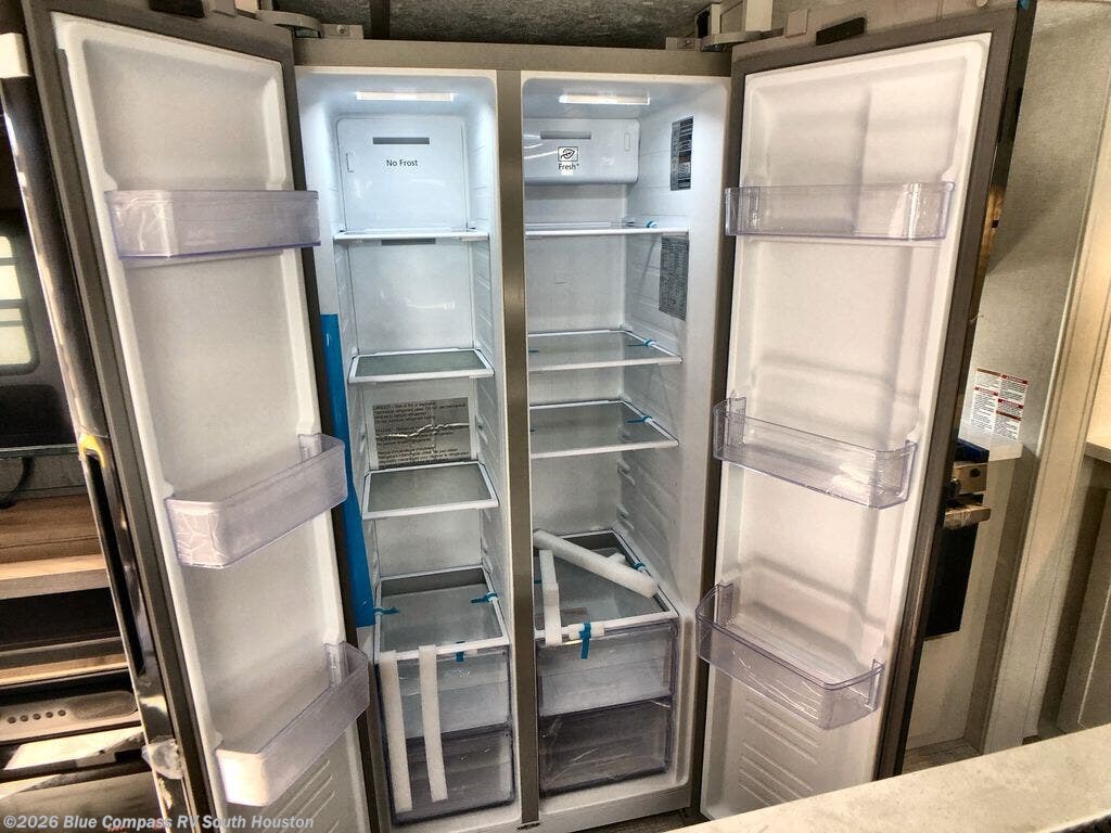 One look at this fifth wheel and you'll be sold! There are an impressive two master suites; one up front with a queen bed and full bath, and one towards the back with a king bed slide and second full bath! There are even dual bath sinks in the rear bath for added convenience! The middle living area includes dual opposing slides, a tri-fold sofa, plus theater seating and a free-spanning table for ample seating, dining, and sleeping space. There is also an entertainment center with a 50" 4K Smart LED TV to wash away those rainy day blues. The chef of your crew will have a GE Profile 21" stainless steel oven with a residential cooktop and a GE Profile stainless residential microwave to cook meals each day, a kitchen island for more counter space, and a 16 cu. ft. side-by-side 12V refrigerator for food storage.