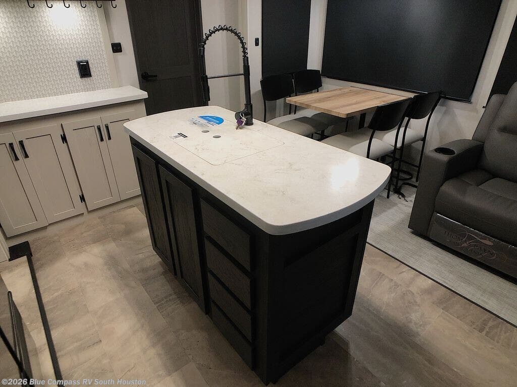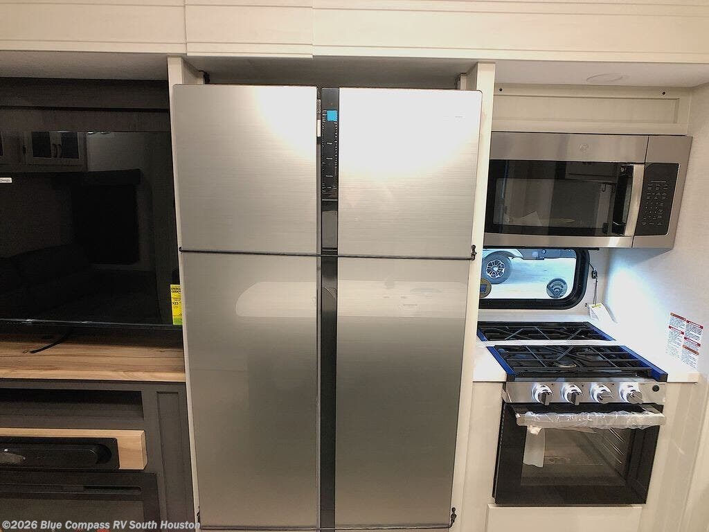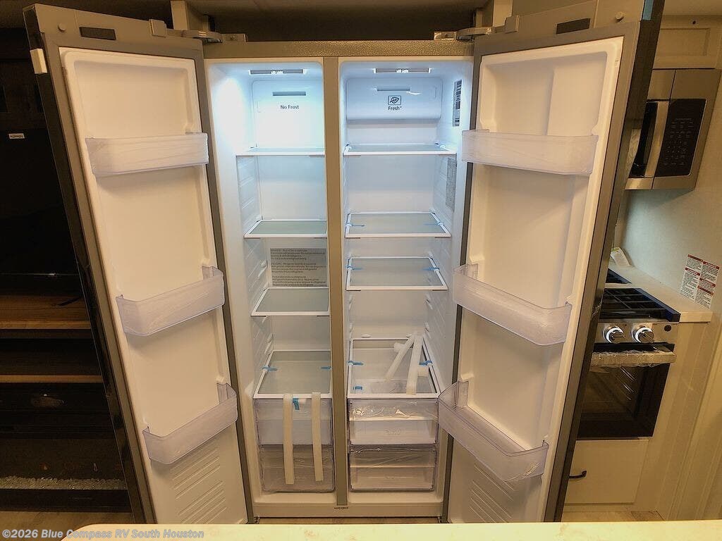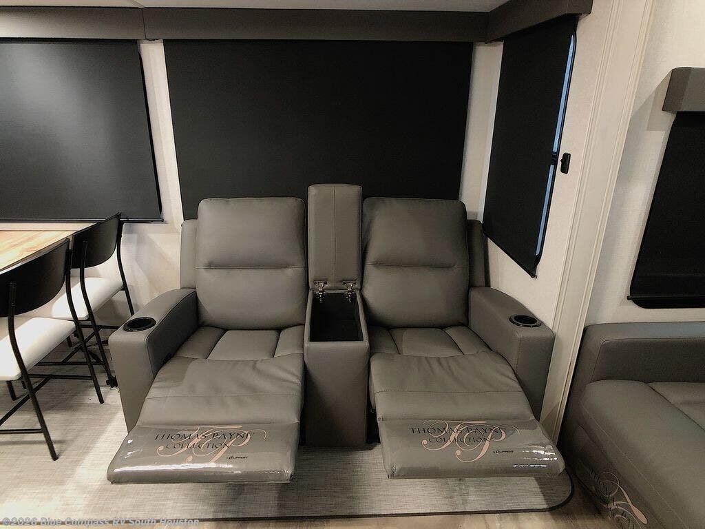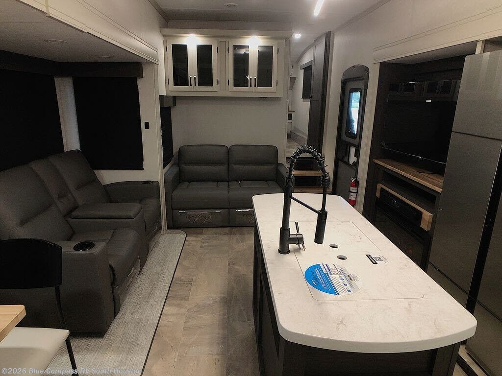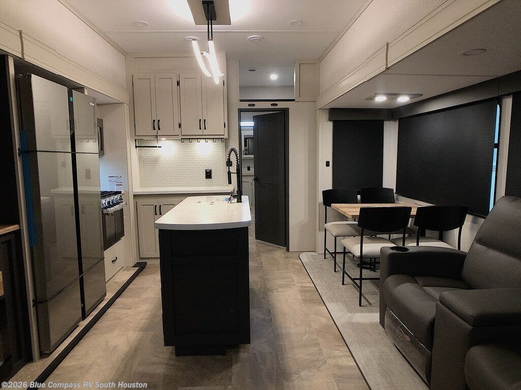 One look at this fifth wheel and you'll be sold! There are an impressive two master suites; one up front with a queen bed and full bath, and one towards the back with a king bed slide and second full bath! There are even dual bath sinks in the rear bath for added convenience! The middle living area includes dual opposing slides, a tri-fold sofa, plus theater seating and a free-spanning table for ample seating, dining, and sleeping space. There is also an entertainment center with a 50" 4K Smart LED TV to wash away those rainy day blues. The chef of your crew will have a GE Profile 21" stainless steel oven with a residential cooktop and a GE Profile stainless residential microwave to cook meals each day, a kitchen island for more counter space, and a 16 cu. ft. side-by-side 12V refrigerator for food storage.