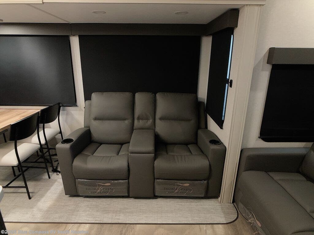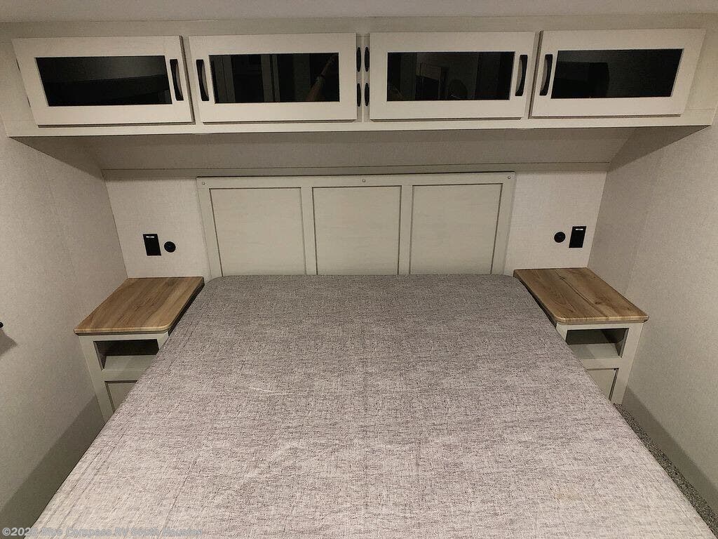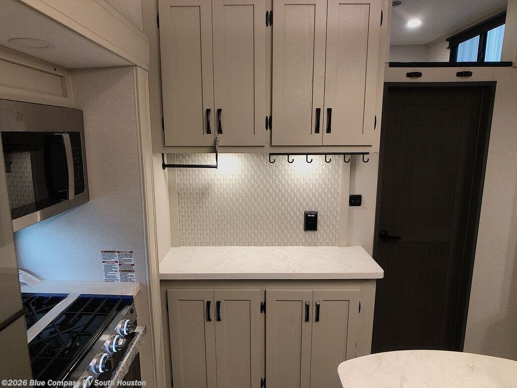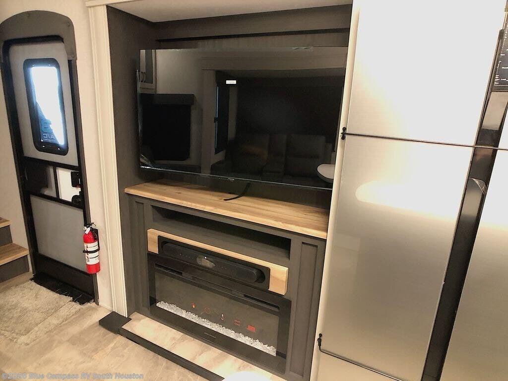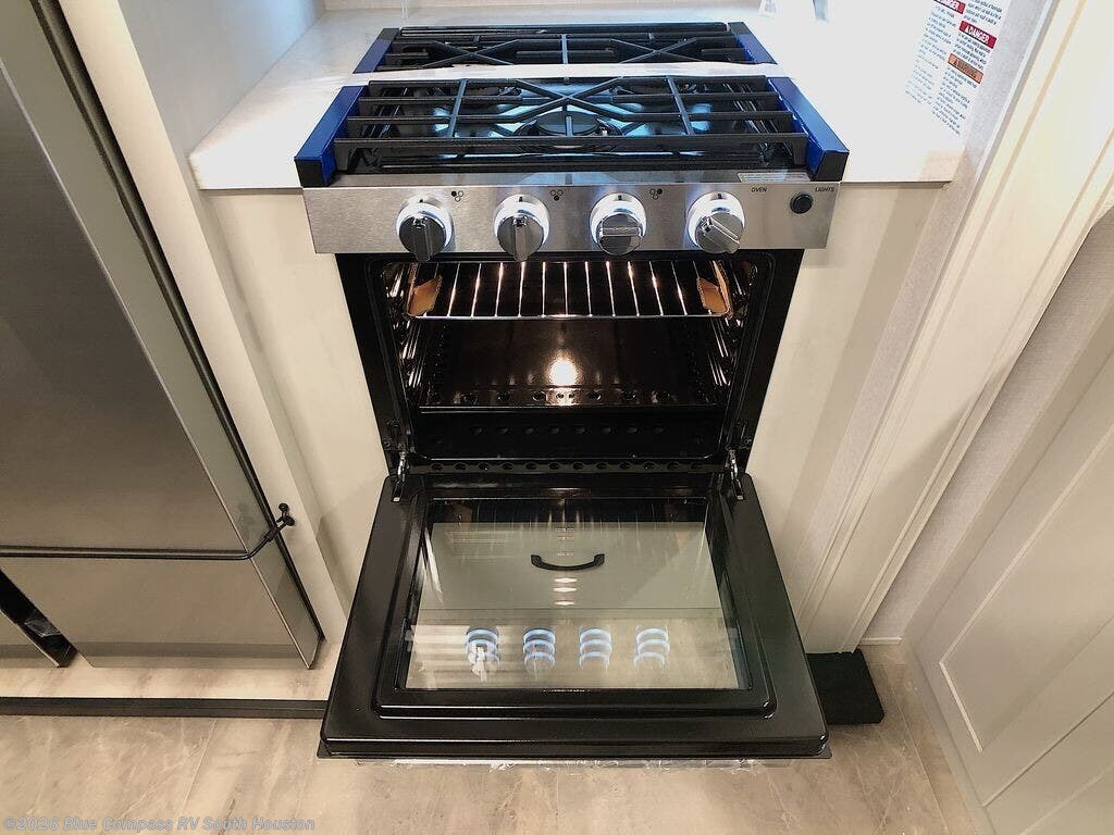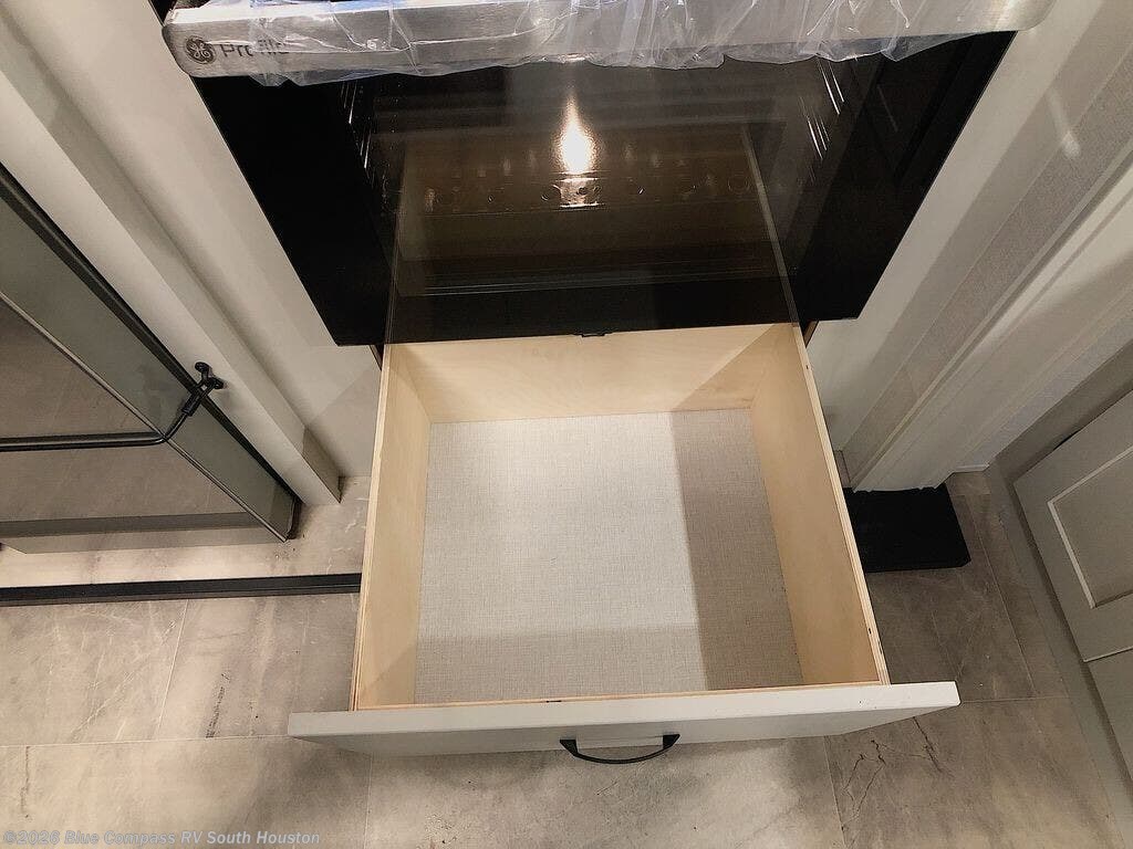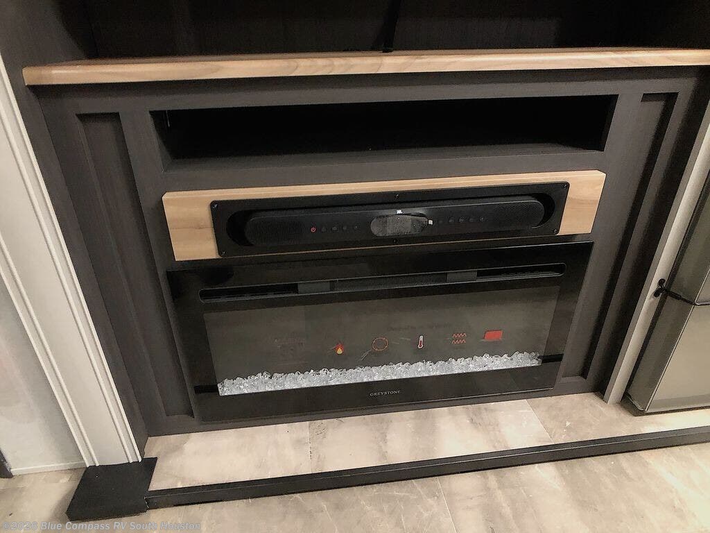 One look at this fifth wheel and you'll be sold! There are an impressive two master suites; one up front with a queen bed and full bath, and one towards the back with a king bed slide and second full bath! There are even dual bath sinks in the rear bath for added convenience! The middle living area includes dual opposing slides, a tri-fold sofa, plus theater seating and a free-spanning table for ample seating, dining, and sleeping space. There is also an entertainment center with a 50" 4K Smart LED TV to wash away those rainy day blues. The chef of your crew will have a GE Profile 21" stainless steel oven with a residential cooktop and a GE Profile stainless residential microwave to cook meals each day, a kitchen island for more counter space, and a 16 cu. ft. side-by-side 12V refrigerator for food storage.