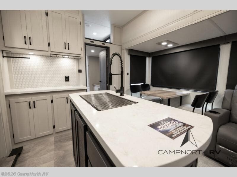 One look at this fifth wheel and you'll be sold! There are an impressive two master suites; one up front with a queen bed and full bath, and one towards the back with a king bed slide and second full bath! There are even dual bath sinks in the rear bath for added convenience! The middle living area includes dual opposing slides, a tri-fold sofa, plus theater seating and a free-spanning table for ample seating, dining, and sleeping space. There is also an entertainment center with a 50" 4K Smart LED TV to wash away those rainy day blues. The chef of your crew will have a GE Profile 21" stainless steel oven with a residential cooktop and a GE Profile stainless residential microwave to cook meals each day, a kitchen island for more counter space, and a 16 cu. ft. side-by-side 12V refrigerator for food storage.