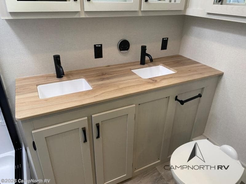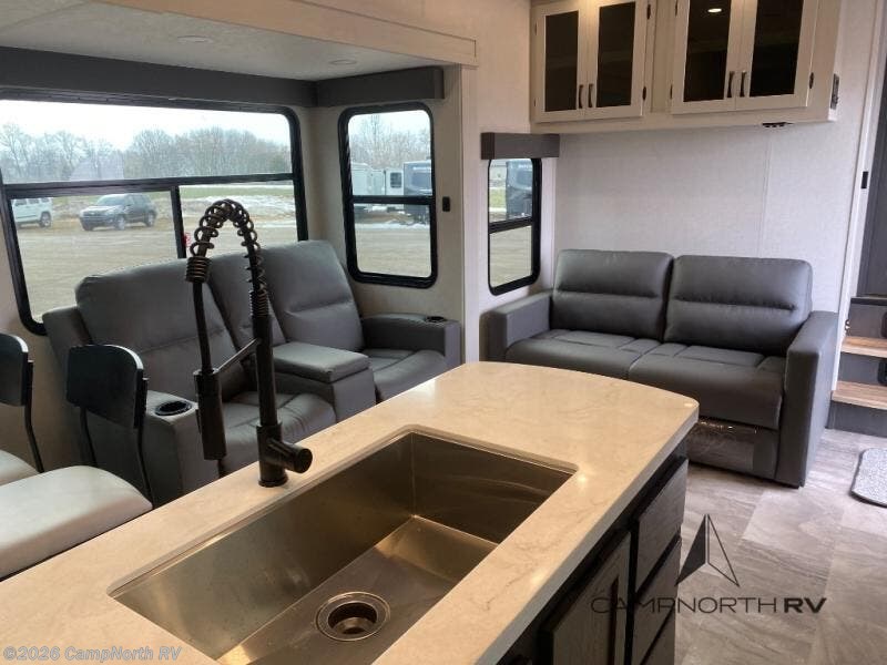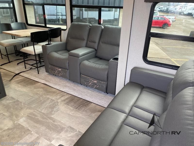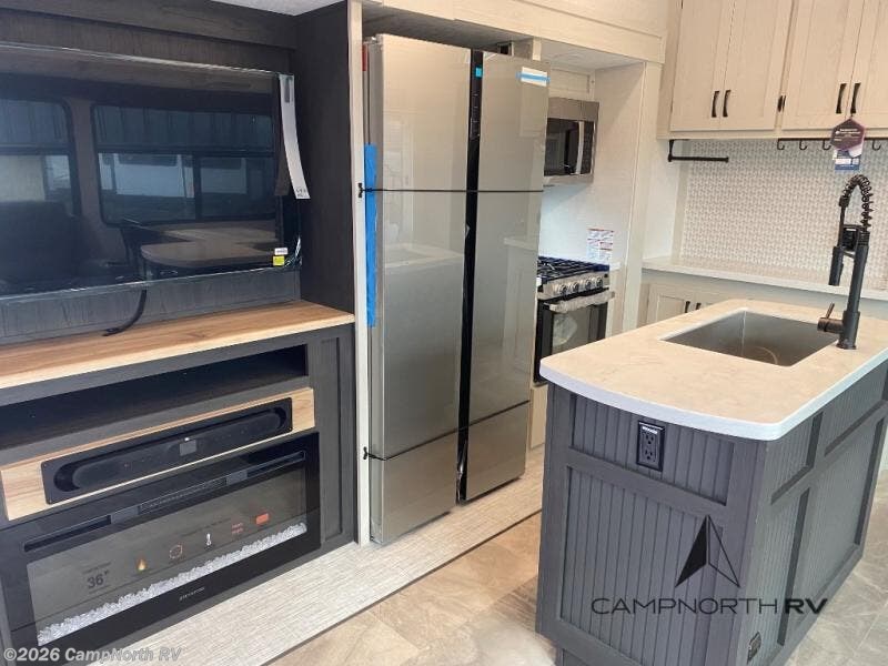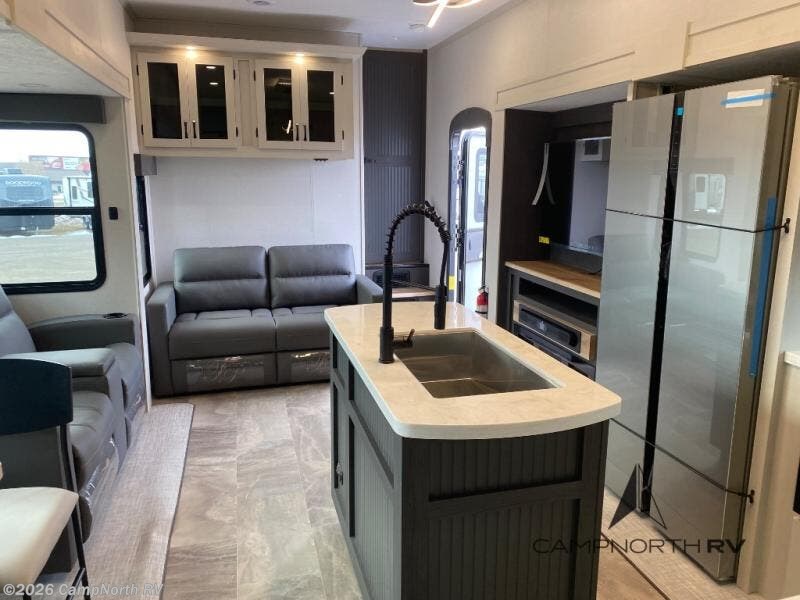 One look at this fifth wheel and you'll be sold! There are an impressive two master suites; one up front with a queen bed and full bath, and one towards the back with a king bed slide and second full bath! There are even dual bath sinks in the rear bath for added convenience! The middle living area includes dual opposing slides, a tri-fold sofa, plus theater seating and a free-spanning table for ample seating, dining, and sleeping space. There is also an entertainment center with a 50" 4K Smart LED TV to wash away those rainy day blues. The chef of your crew will have a GE Profile 21" stainless steel oven with a residential cooktop and a GE Profile stainless residential microwave to cook meals each day, a kitchen island for more counter space, and a 16 cu. ft. side-by-side 12V refrigerator for food storage.