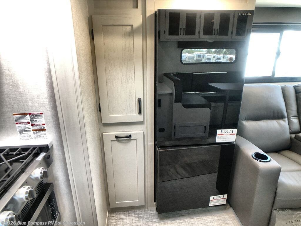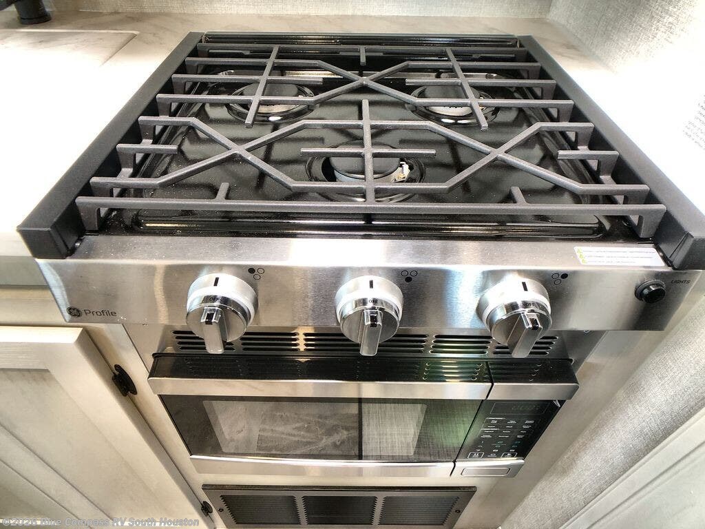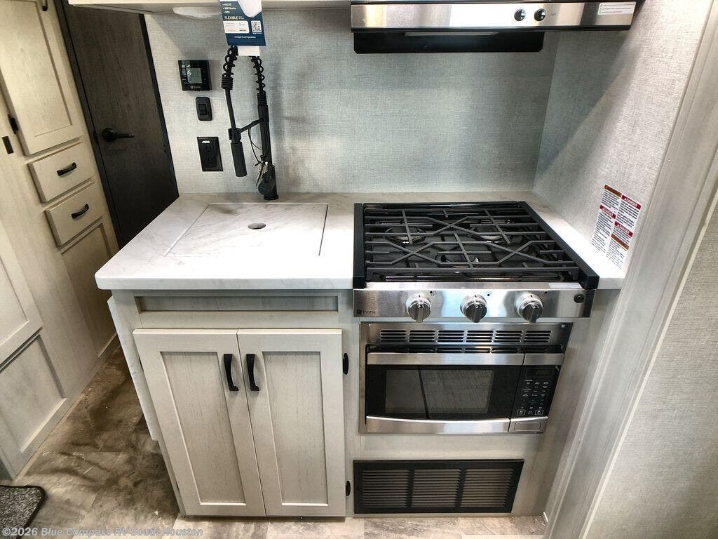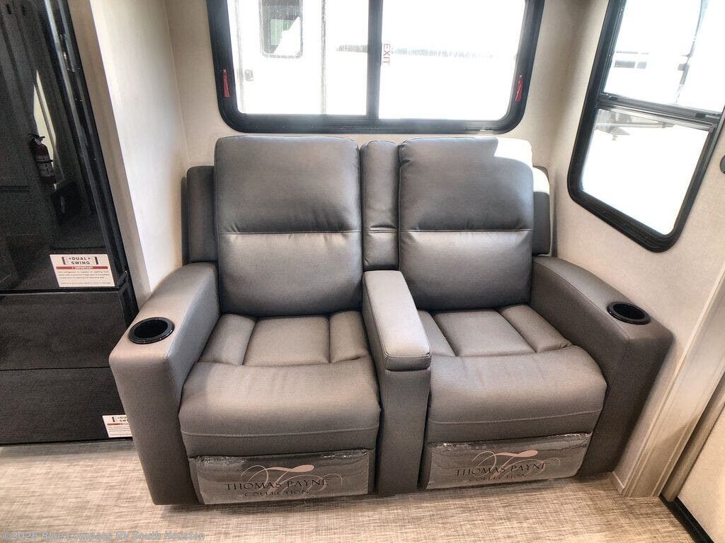 You'll love the amount of space you'll have in this fifth wheel thanks to the double slides! Once you arrive at the campground, you can start lunch in the full kitchen, then dine at the J-lounge with a table and bench seat. There is also theater seating within the living room slide for added space and comfort. Your guests can claim the front bunkhouse to themselves, which includes two bunk beds with a wardrobe below for clothes and shoes. The rear master bedroom will have you feeling right at home with a queen bed slide out and quick access into the full bath!