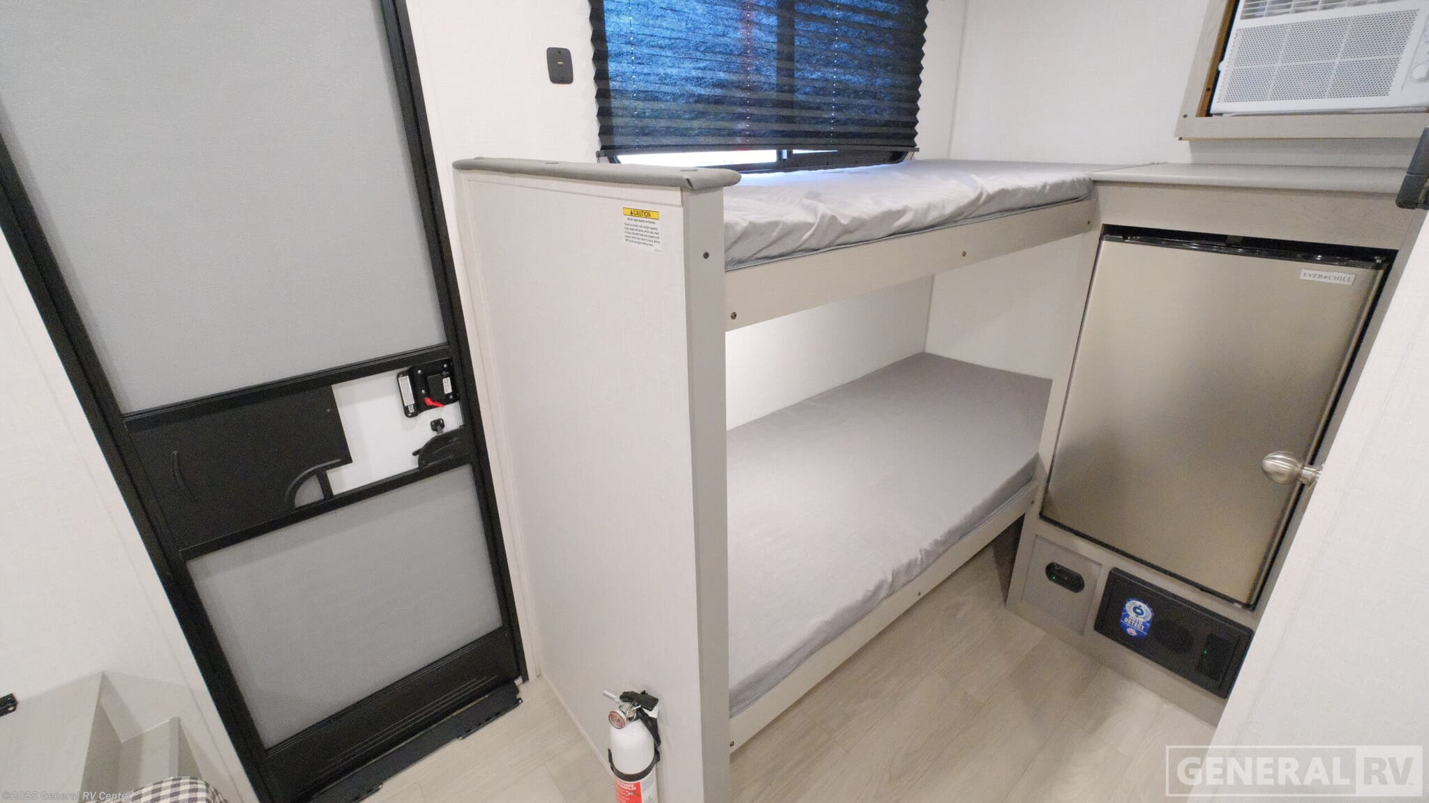 Coachmen Clipper 3K Series travel trailer 12BH highlights: 54" x 74" RV Queen Bed Two-Burner Cooktop Private Bath Sleeps Four Lightweight camping with at-home comforts is possible with this travel trailer in tow! Once you arrive at the campground, you can unload the exterior storage, put out the awning, then head inside to make lunch on the two-burner cooktop. There is a refrigerator to keep your items fresh, plus a sink with a cup rinse for added convenience. Your guests or little ones are sure to love the 29" x 70" bunk beds, and the private bath is close to the bunks for easy nighttime use. You'll have the front 54" x 74" RV queen bed to yourselves, along with an overhead shelf and bedroom storage for your things.