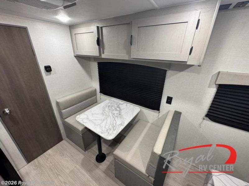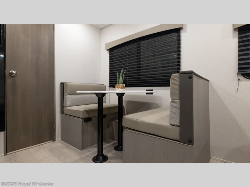 The booth dinette provides a comfortable place to enjoy meals indoors and can also convert for additional sleeping space when needed.