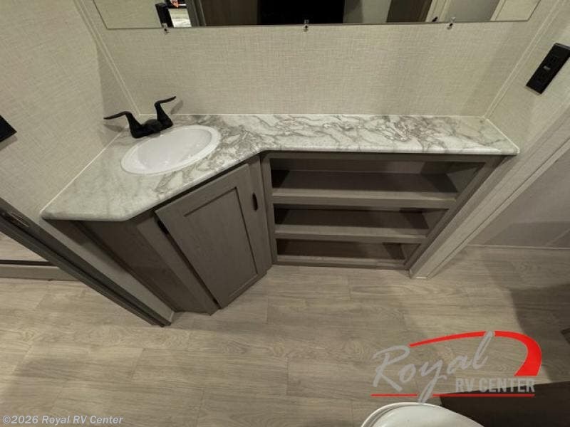 Everything you've been looking for in a travel trailer is found within this unit! The 21' power awning can be set up when you get to the campground, then you can unload your camping gear from the pass-thru storage and enjoy the outdoors. Once inside, you can put your things away in the front master bedroom that includes an RV queen bed and dual bedside wardrobes. There is a luxurious full bathroom featuring a shower with glass door and storage below the bath countertop. In the combined kitchen and living area you'll find a large slide out, a U-shaped dinette and sofa, plus a walk-in pantry with washer and dryer prep if you plan on getting those appliances. A great feature on this travel trailer are the rear private bunk rooms where each of your kiddos or guests can have their own space, and don't forget that both have flip-up desks so they can write, draw, work, you name it!