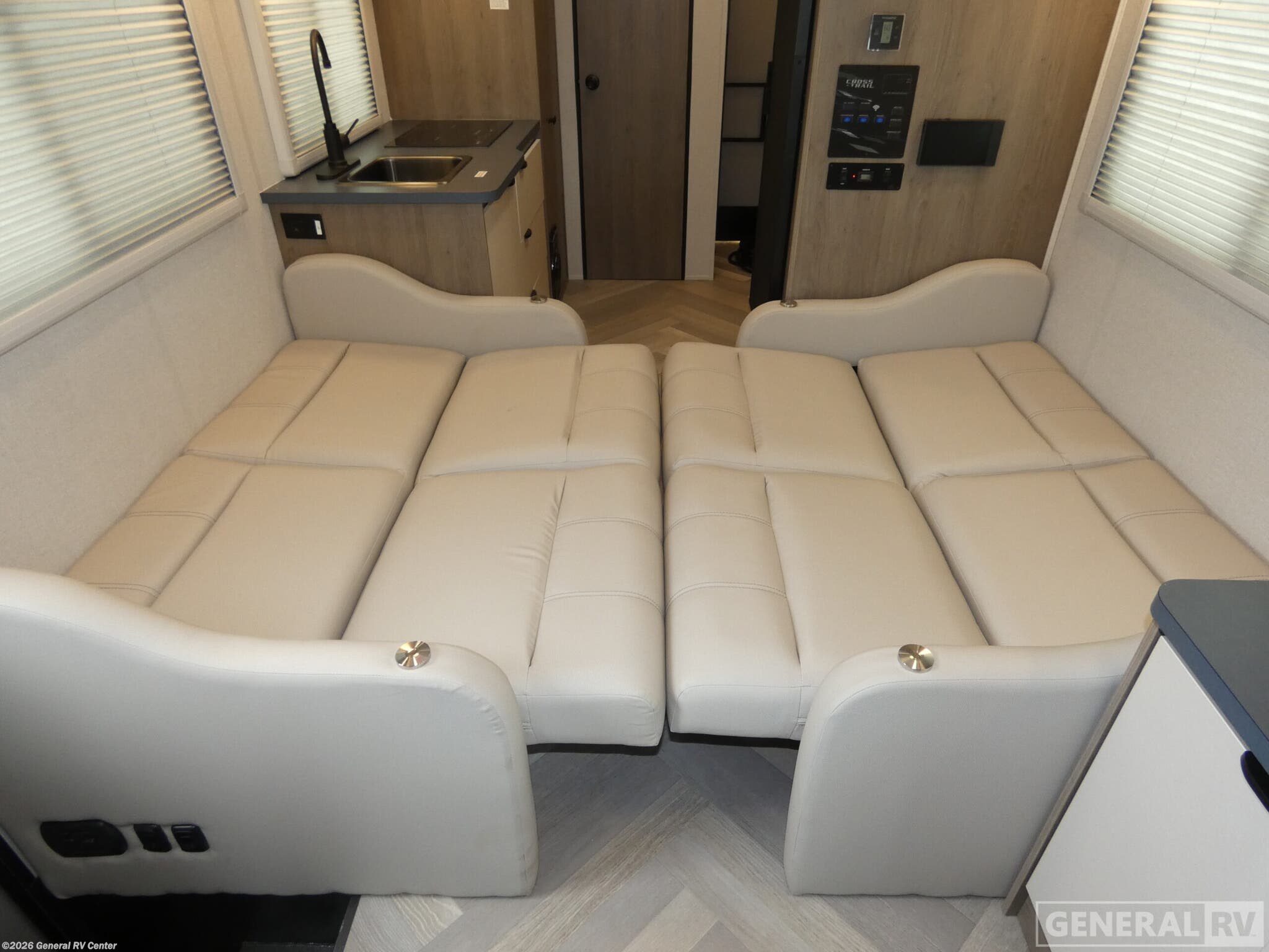 Coachmen Cross Trail EV Class C gas motorhome 20BH highlights: Two 55" sofas Cabover TV Induction Cooktop Sleeps Four You're going to love every minute spent in this cozy coach that sleeps four. There are convenient Murphy bunk beds with storage for your guests' belongings, and you can sleep on the 54" x 84" sleeping area once the two sofas are folded down for the night. In the morning, you can make breakfast on the two burner induction cooktop or use the convection microwave. There is also a three way refrigerator and a pantry to store your food for your whole trip. This model also includes a wet bath that will allow you to stay clean each day without having to use the camp's facilities! The Cross Trail EV Class C gas motorhomes by Coachmen offer livable and storage friendly coaches with an interior/exterior Smart TV, extra large kitchen counters, and large sliding tinted windows. Also included is the Renogy Empowered state-of-the-art hybrid electrical system designed to operate every coach function from battery power, including the A/C, and is convenient for operating systems while traveling without the use of a generator. Each has a fuel-friendly Ford transit chassis, Azdel composite vacuum bonded sidewalls, and a CrossFlex roof membrane, providing more puncture resistance.