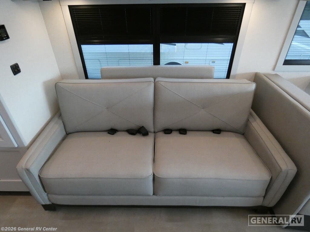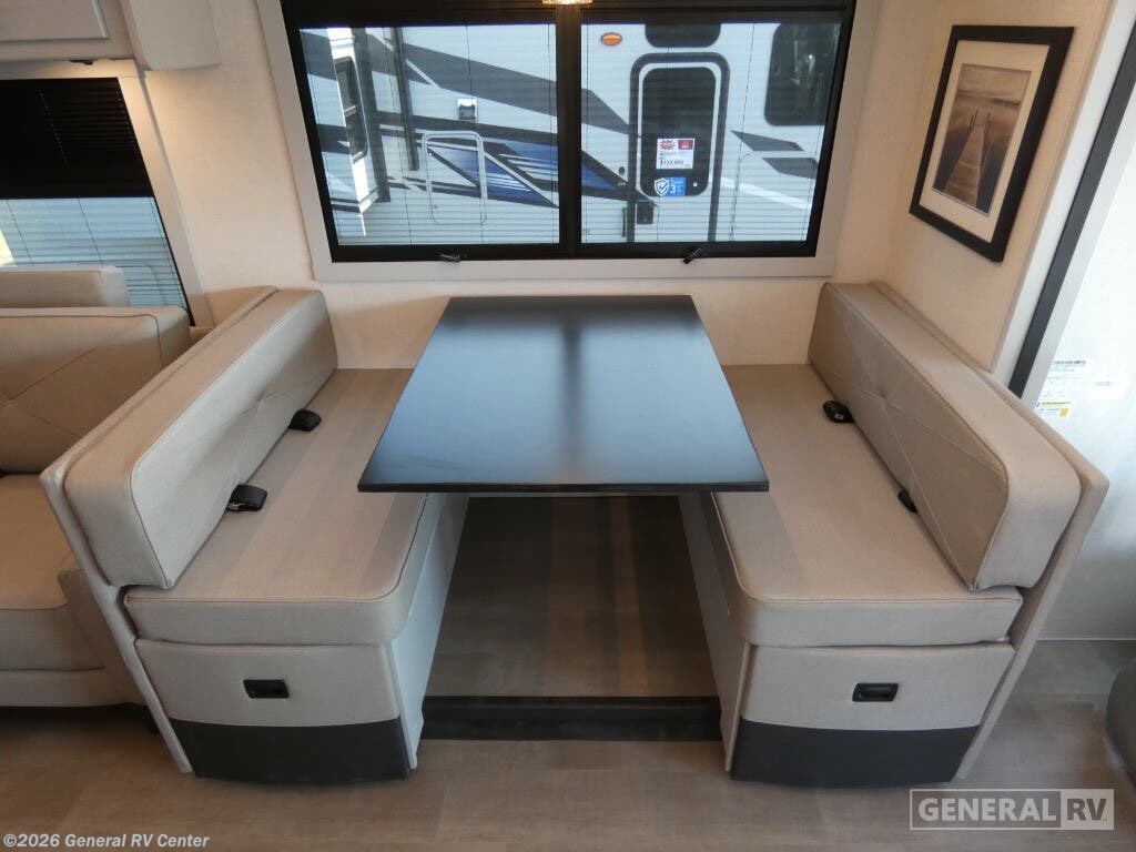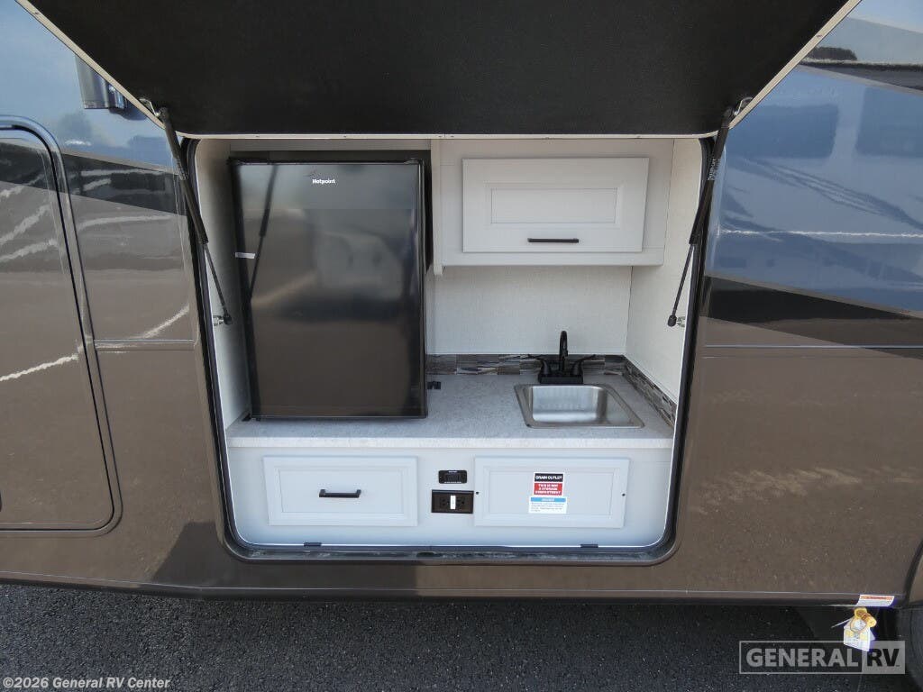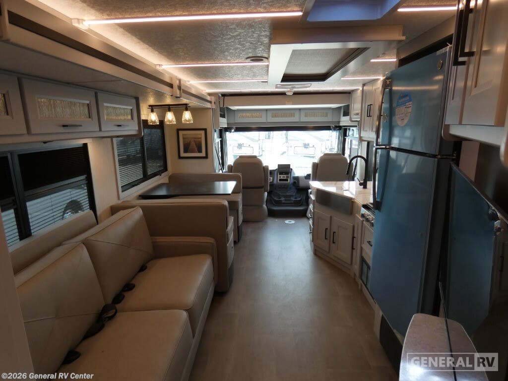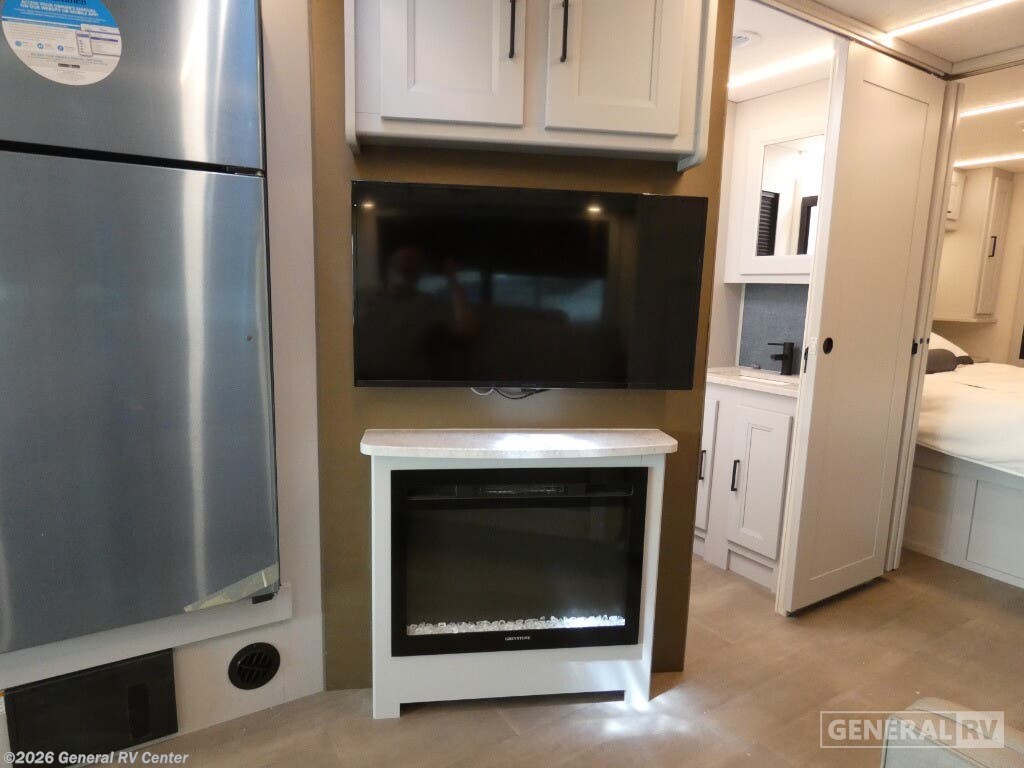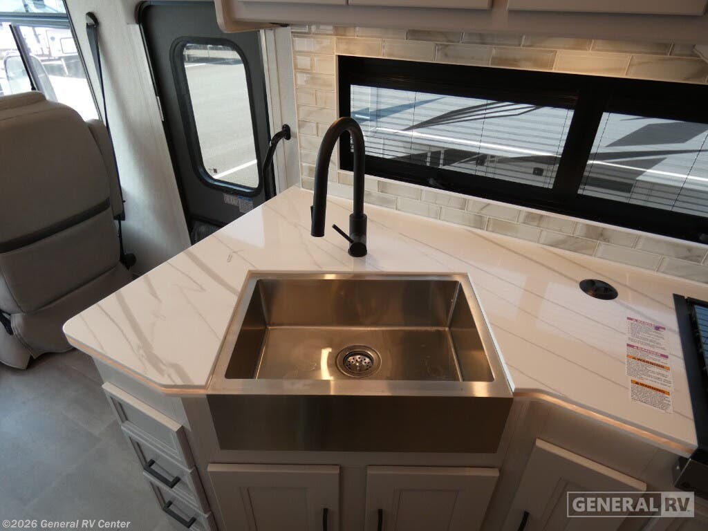 The 2026 Coachmen Encore 335FS is a Class A gas motorhome that blends residential comfort with dependable road performance, making it a top pick for travelers seeking long-term luxury on the go. Built on the reliable Ford F-53 chassis and powered by a 7.3L V8 engine, the 335FS stretches 35 feet 4 inches in length and offers a strong, stable drive with a 22,000-pound GVWR and an 80-gallon fuel tank. Its sleek exterior is enhanced by high-gloss gelcoat sidewalls, dual power awnings (10' and 15'), and an outdoor entertainment center with an LED TV and kitchen setup—perfect for outdoor living. Inside, the Encore 335FS offers a thoughtfully laid-out floorplan with stylish maple cabinetry, LED lighting, and residential vinyl flooring throughout. The front living area includes theater seating, a 78-inch sofa hide-a-bed, and a 40-inch TV with a built-in electric fireplace—ideal for relaxing evenings. The kitchen is fully equipped with a stainless-steel residential refrigerator, solid-surface countertops, a three-burner cooktop with oven, microwave, and plenty of storage, making meal prep easy and enjoyable. The private rear bedroom features a king-size bed, wardrobe storage, overhead cabinets, and a dedicated TV. It also includes prep space for a stackable washer and dryer, offering convenience for extended trips. The bathroom features a porcelain toilet, radius shower, skylight, and linen storage. Driver comfort is also a priority, with swivel captain’s chairs, a 10" touchscreen with Apple CarPlay and Android Auto, and a tilt/telescoping steering wheel. For added safety and functionality, the coach includes side and rearview cameras, automatic leveling jacks, a 5.5kW generator, 50-amp service, and Azdel composite construction for durability and moisture resistance. With its high-end features and road-ready build, the 2026 Encore 335FS is built for travelers who want it all.