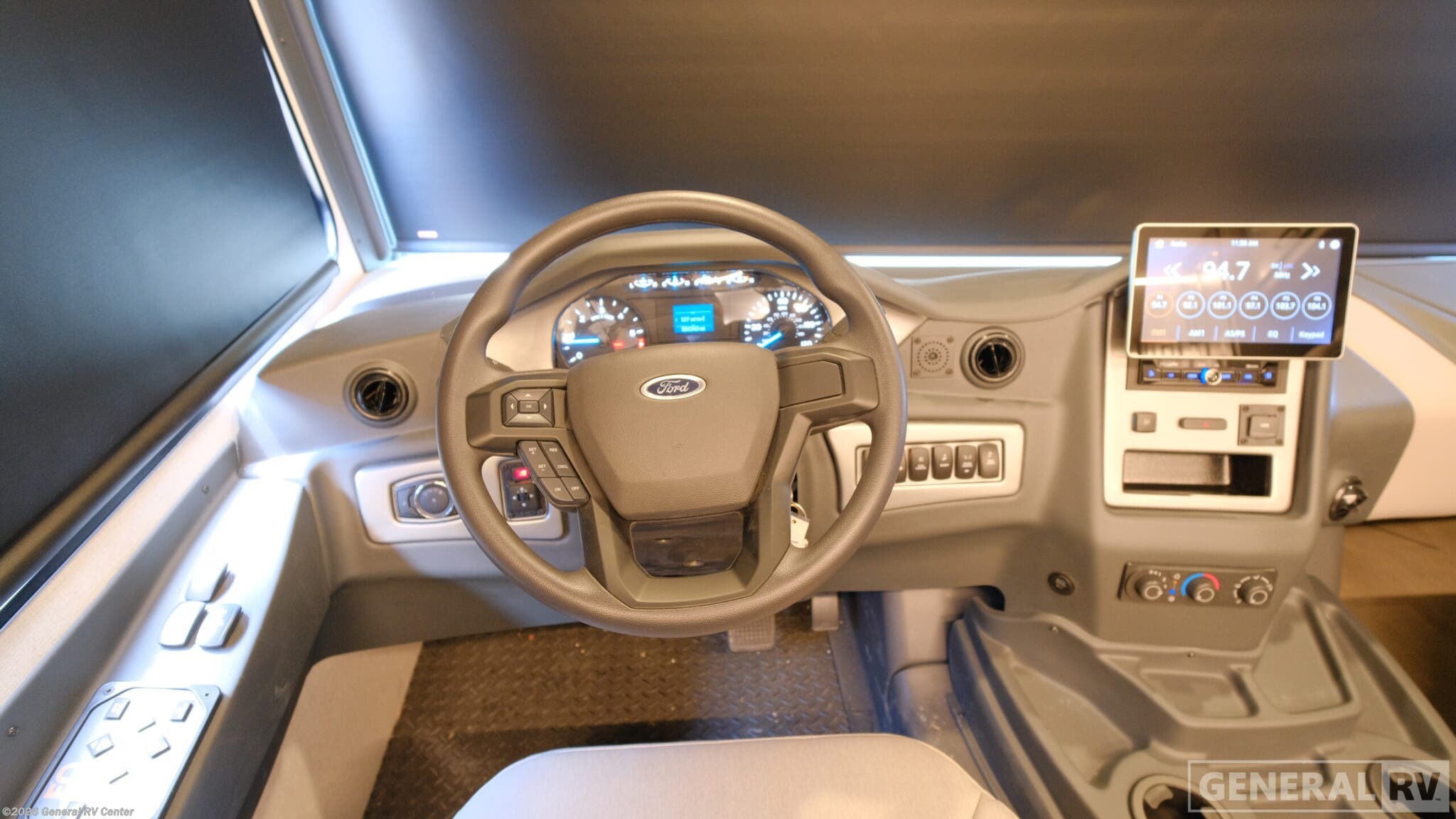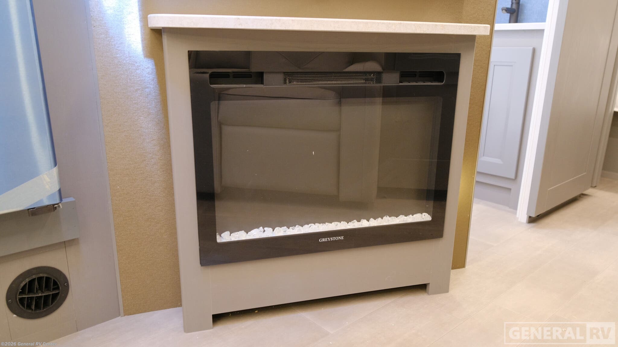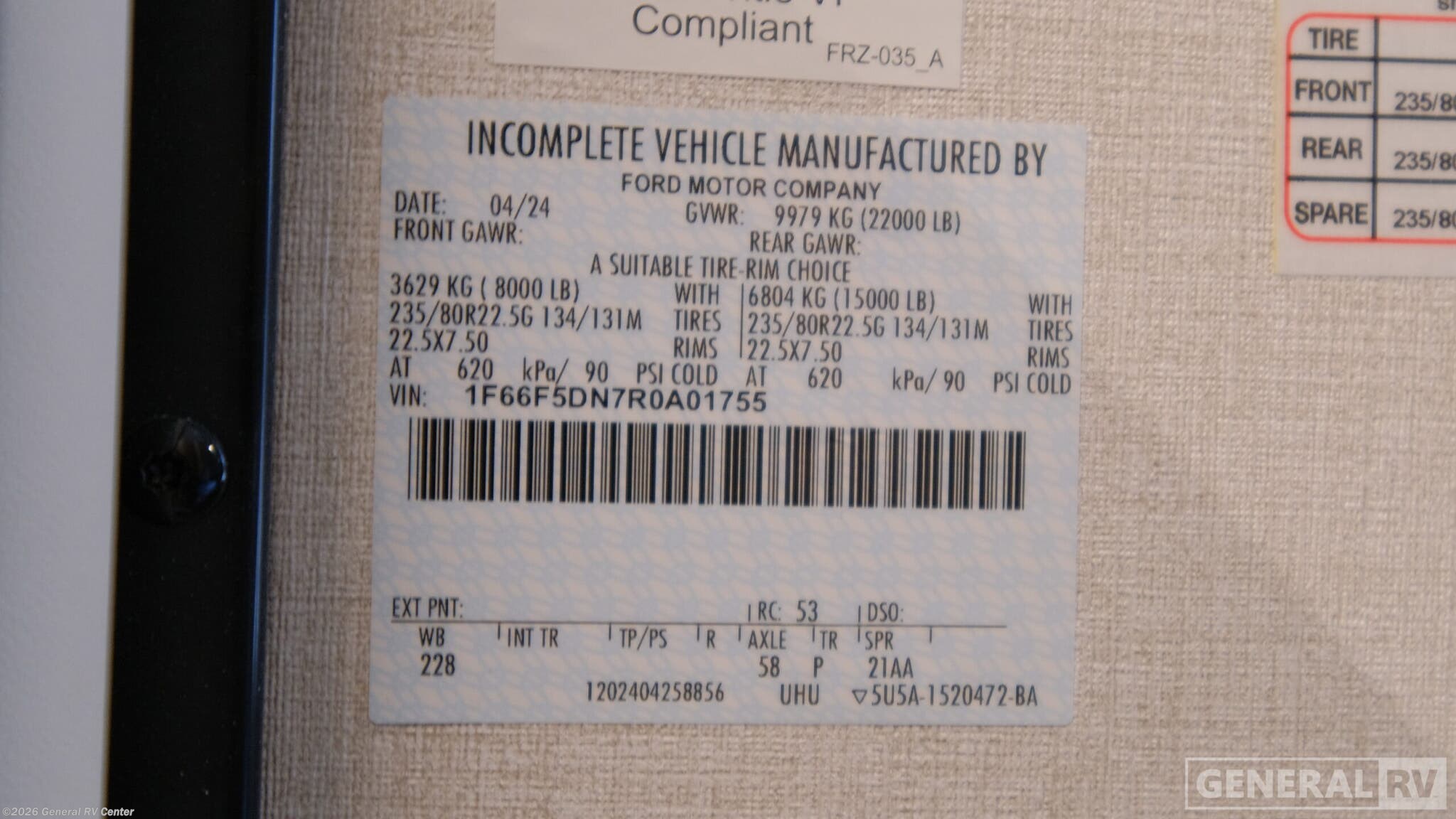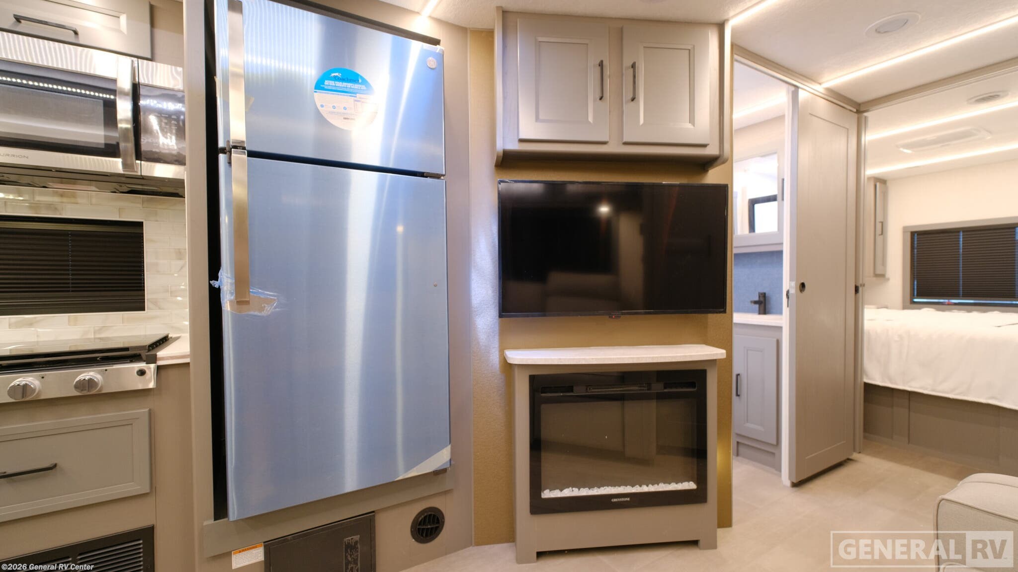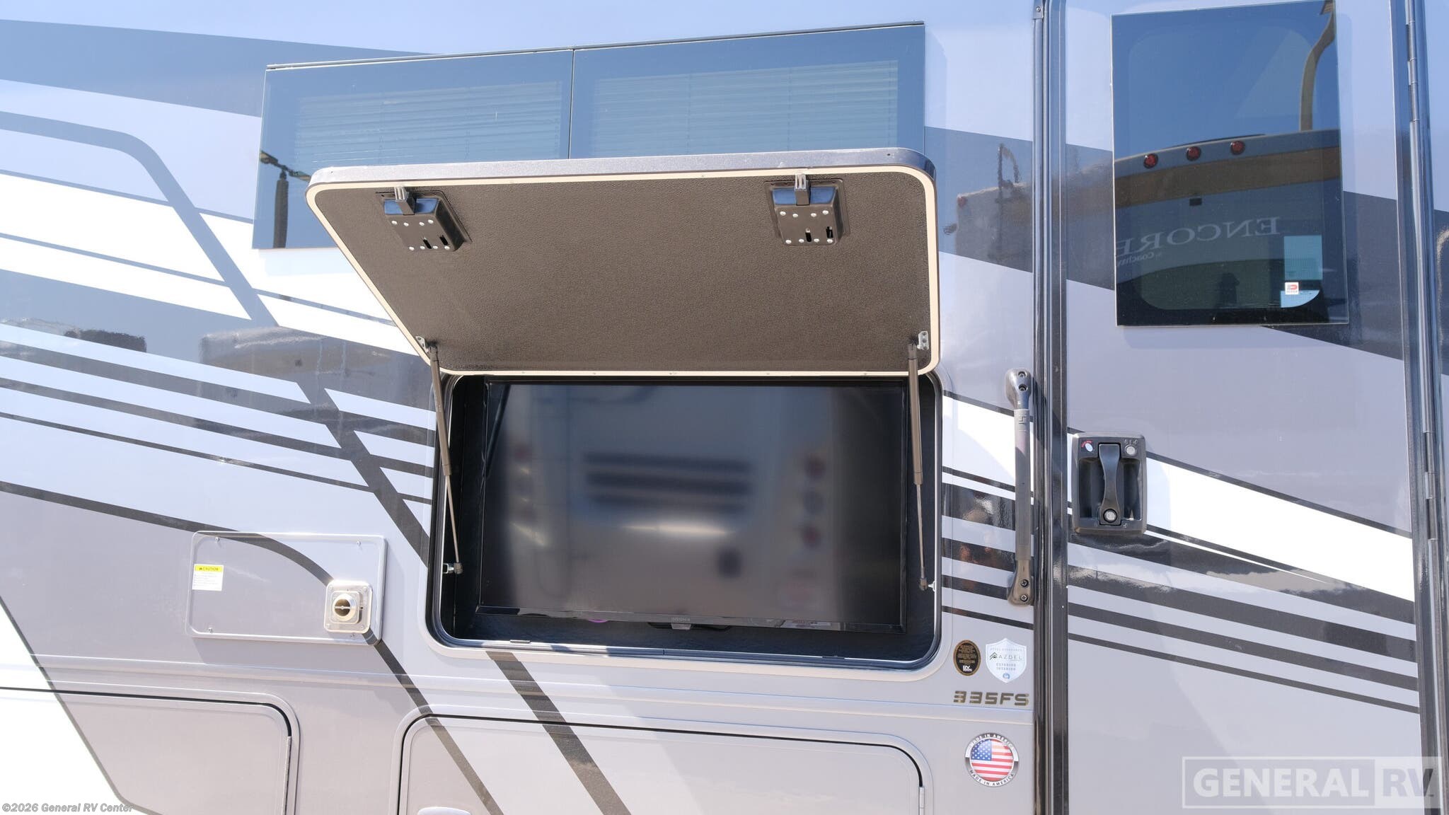 The 2026 Coachmen Encore 335FS is a Class A gas motorhome that blends residential comfort with dependable road performance, making it a top pick for travelers seeking long-term luxury on the go. Built on the reliable Ford F-53 chassis and powered by a 7.3L V8 engine, the 335FS stretches 35 feet 4 inches in length and offers a strong, stable drive with a 22,000-pound GVWR and an 80-gallon fuel tank. Its sleek exterior is enhanced by high-gloss gelcoat sidewalls, dual power awnings (10' and 15'), and an outdoor entertainment center with an LED TV and kitchen setup—perfect for outdoor living. Inside, the Encore 335FS offers a thoughtfully laid-out floorplan with stylish maple cabinetry, LED lighting, and residential vinyl flooring throughout. The front living area includes theater seating, a dinette, and a 40-inch TV with a built-in electric fireplace—ideal for relaxing evenings. The kitchen is fully equipped with a stainless-steel residential refrigerator, solid-surface countertops, a three-burner cooktop with oven, microwave, and plenty of storage, making meal prep easy and enjoyable. The private rear bedroom features a king-size bed, wardrobe storage, overhead cabinets, and a dedicated TV. It also includes prep space for a stackable washer and dryer, offering convenience for extended trips. The bathroom features a porcelain toilet, radius shower, skylight, and linen storage. Driver comfort is also a priority, with swivel captain’s chairs, a 10" touchscreen with Apple CarPlay and Android Auto, and a tilt/telescoping steering wheel. For added safety and functionality, the coach includes side and rearview cameras, automatic leveling jacks, a 5.5kW generator, 50-amp service, and Azdel composite construction for durability and moisture resistance. With its high-end features and road-ready build, the 2026 Encore 335FS is built for travelers who want it all.