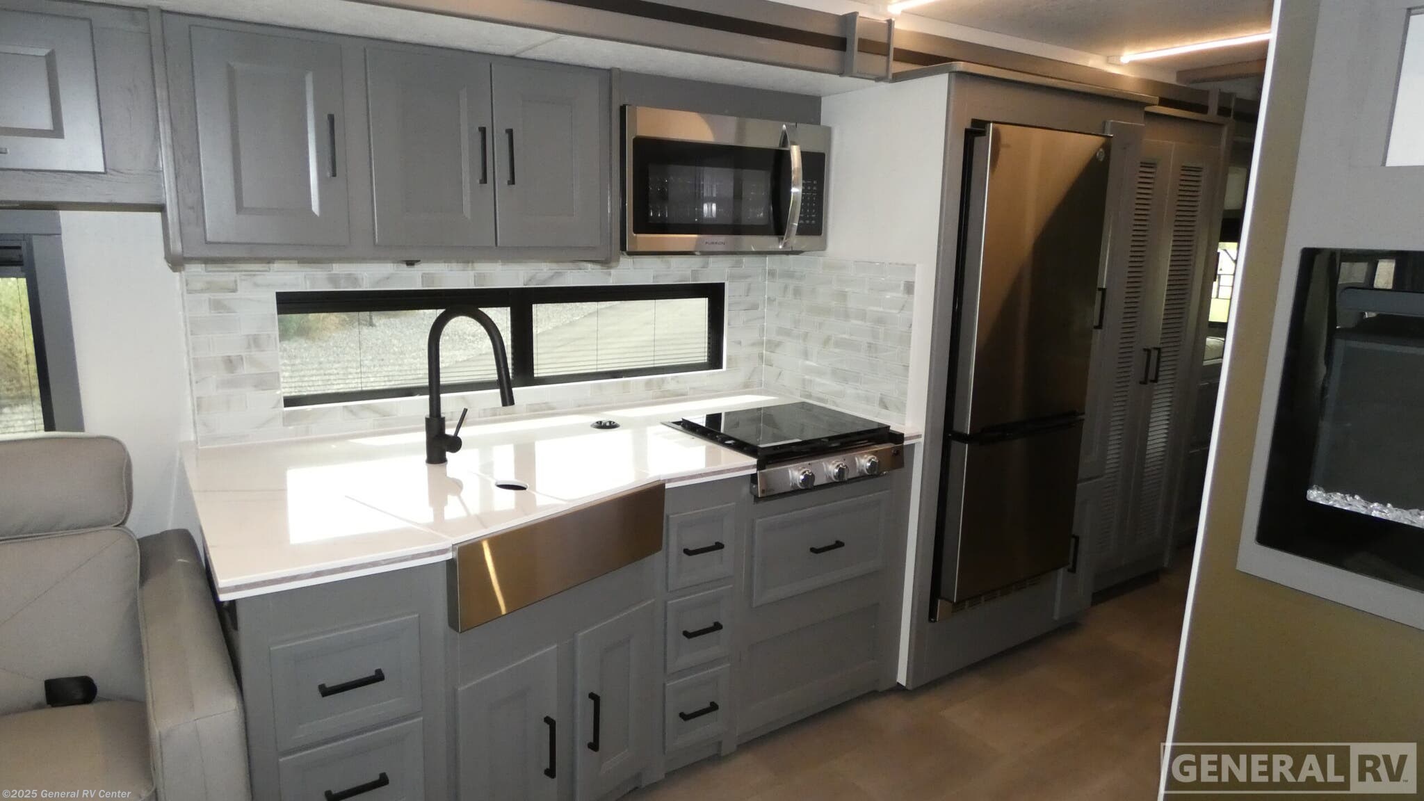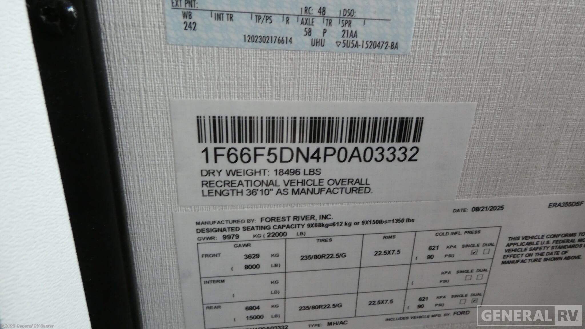 Experience the ultimate in luxury travel with the 2026 Coachmen Encore 355DS. This RV is designed to provide all the comforts of home while on the road. With a spacious layout that includes a front living area and a center kitchen, you'll find plenty of room to relax and entertain. The kitchen is equipped with a full-size electric refrigerator and a three-burner cooktop, making meal prep a breeze. The central bath, featuring a plastic and glass shower, offers convenience and style, while the rear king bedroom provides a peaceful retreat after a day of adventure. The Encore 355DS is perfect for families or groups, comfortably sleeping up to six people. It includes a king bed, a double bed, and two convertible sleeping areas. The thoughtful design ensures everyone has their space, with ample storage throughout. Enjoy the outdoors with the 20 ft. powered retractable awning, perfect for shaded relaxation. Built on a Ford F53 chassis with a powerful 350-horsepower engine, this RV is ready to take you on your next journey with ease and confidence. Whether you're traveling cross-country or enjoying a weekend getaway, the Coachmen Encore 355DS offers the perfect blend of comfort, style, and functionality. For more information, visit your nearest General RV dealership and start your adventure today!