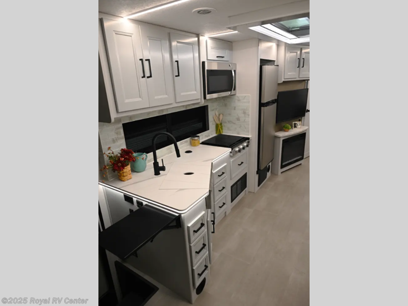 It's a clean decision to take this motorhome on your next vacation with a bath and a half! The full rear bathroom has a 38" x 30" shower and creates a master suite with the entrance going into the private bedroom which features a 70" x 74" king bed slide with CPAP station above it, a wardrobe, and a 32" LED TV with storage space. Just outside the bedroom is a prepped area to add an optional washer and dryer and a versatile space that can be transformed into bunks, an office, or a wardrobe area instead. The half bathroom is conveniently located close to the living/kitchen area for easy access for everyone. There is an 86" sofa with bed for extra sleeping space, but if you don't need the extra sleeping area then you can switch it out for the optional power theater seating. A 42" x 72" booth dinette could also transform into a sleeping space and the 47" x 81" drop down bunk over cab can be used for sleeping or storage!